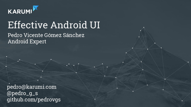 • MVP and MVVM samples. • How to work with Fragments. • Communication between Fragments and Activities. • How to use Dagger as Dependency Injector. • How to use resources to support different screen densities, device orientation and different Android versions. • How to use styles and themes. • How to use Navigator or ActionCommand to implement activities navigation. • How to use custom qualifiers with resources. • How to use different layouts: RelativeLayout, LinearLayout, FrameLayout, etc. • Usage of merge, include and view stub. • How to implement a ListView using Renderers. • Simple Interactors implementation described in “Software Design Patterns on Android” talk. • How to use Dagger with different scopes, Application scope and Activity scope. Introduction https://github.com/pedrovgs/EffectiveAndroidUI