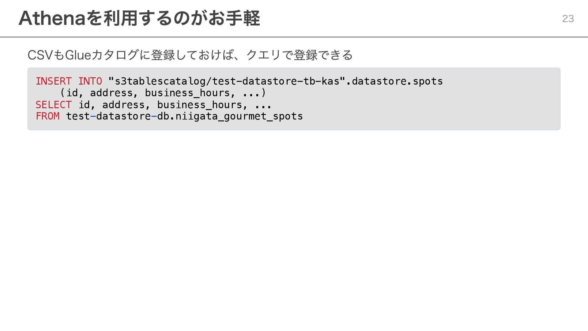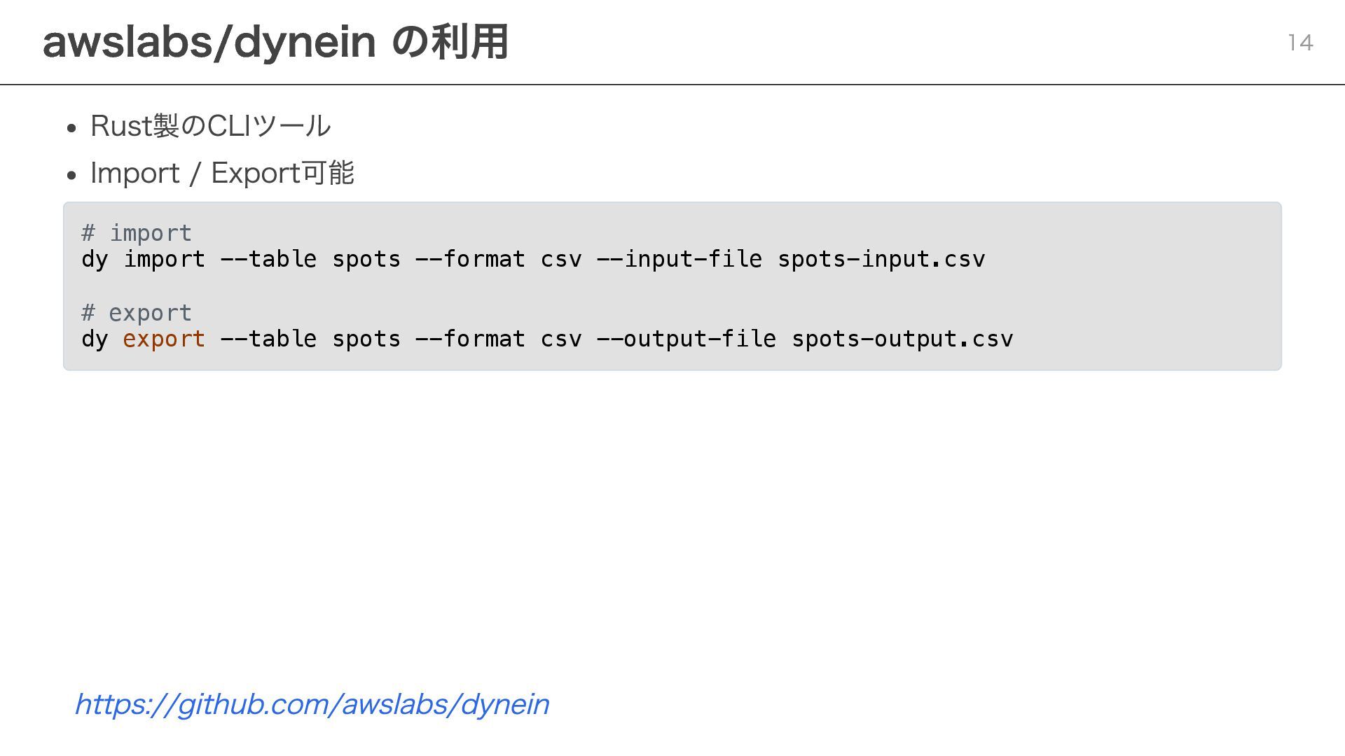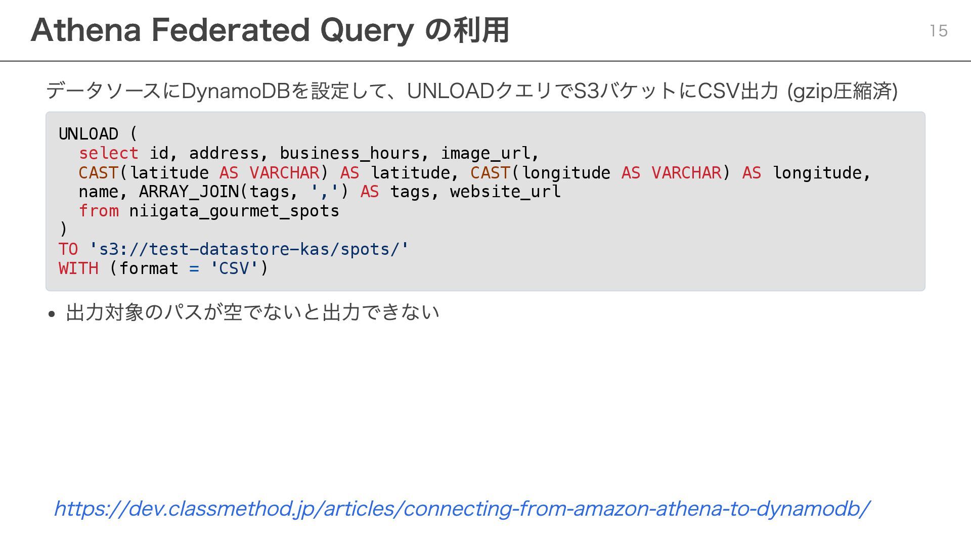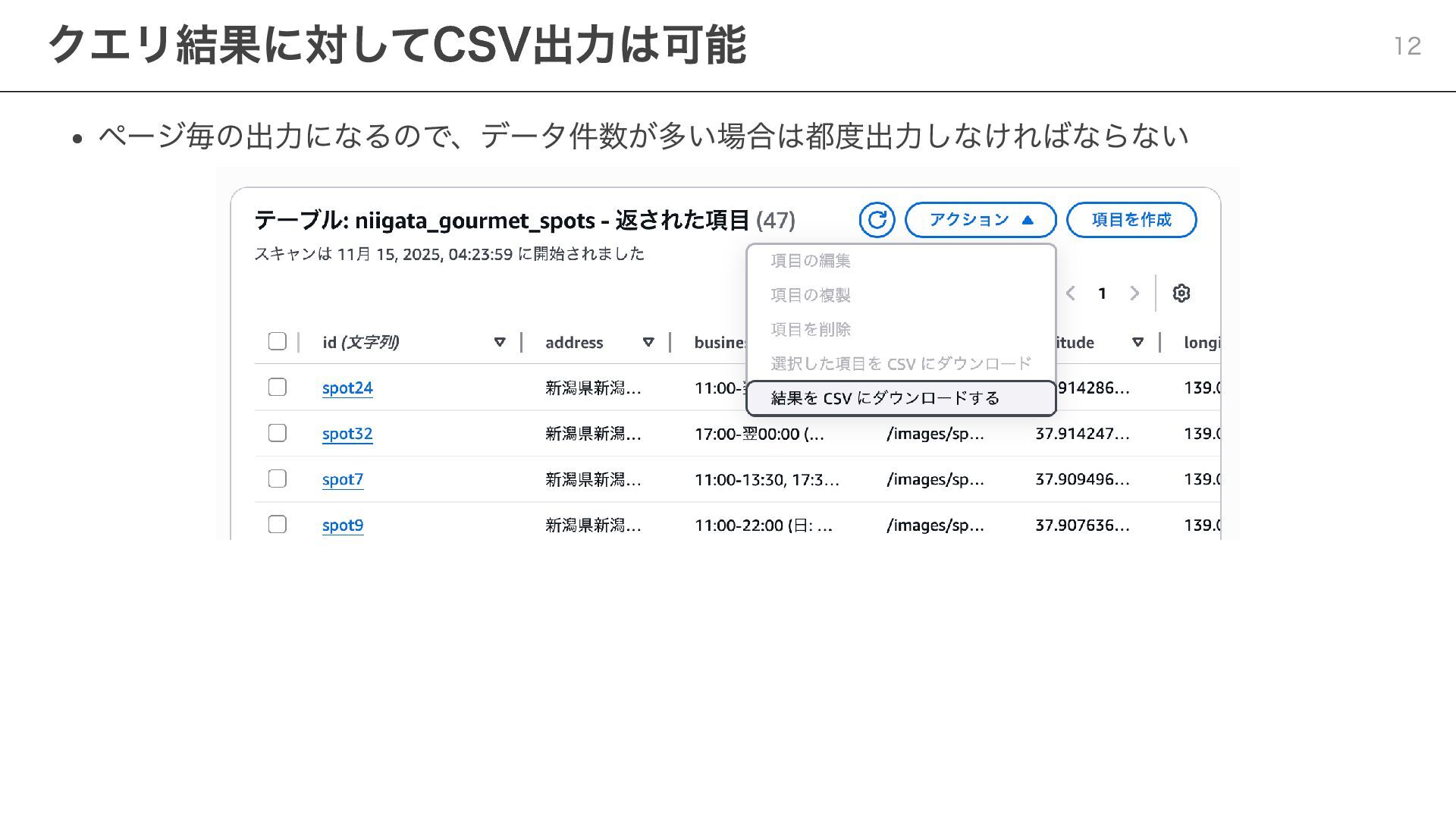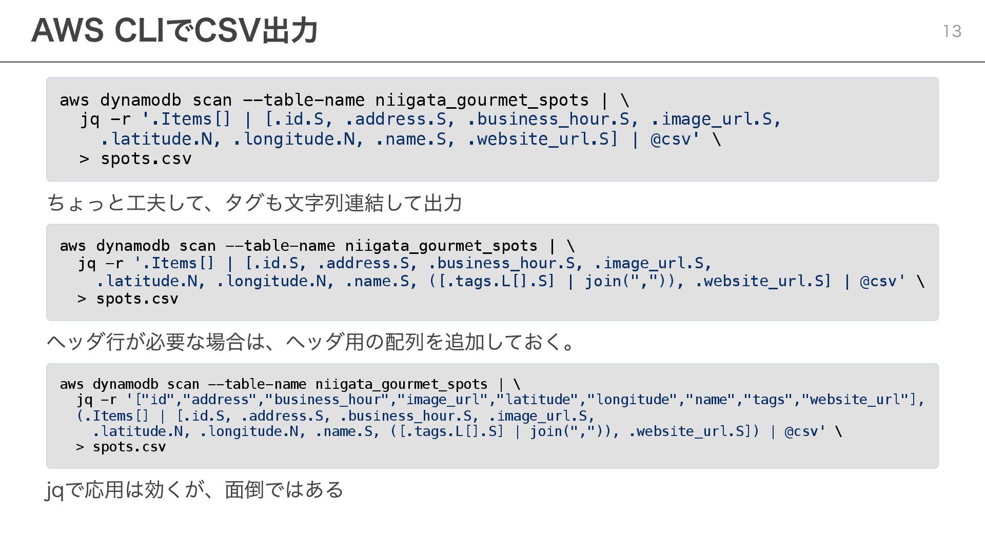 | [.id.S, .address.S, .business_hour.S, .image_url.S, .latitude.N, .longitude.N, .name.S, .website_url.S] | @csv' \ > spots.csv ちょっと工夫して、タグも文字列連結して出力 aws dynamodb scan --table-name niigata_gourmet_spots | \ jq -r '.Items[] | [.id.S, .address.S, .business_hour.S, .image_url.S, .latitude.N, .longitude.N, .name.S, ([.tags.L[].S] | join(",")), .website_url.S] | @csv' \ > spots.csv ヘッダ行が必要な場合は、ヘッダ用の配列を追加しておく。 aws dynamodb scan --table-name niigata_gourmet_spots | \ jq -r '["id","address","business_hour","image_url","latitude","longitude","name","tags","website_url"], (.Items[] | [.id.S, .address.S, .business_hour.S, .image_url.S, .latitude.N, .longitude.N, .name.S, ([.tags.L[].S] | join(",")), .website_url.S]) | @csv' \ > spots.csv jqで応用は効くが、面倒ではある AWS CLIでCSV出力 13