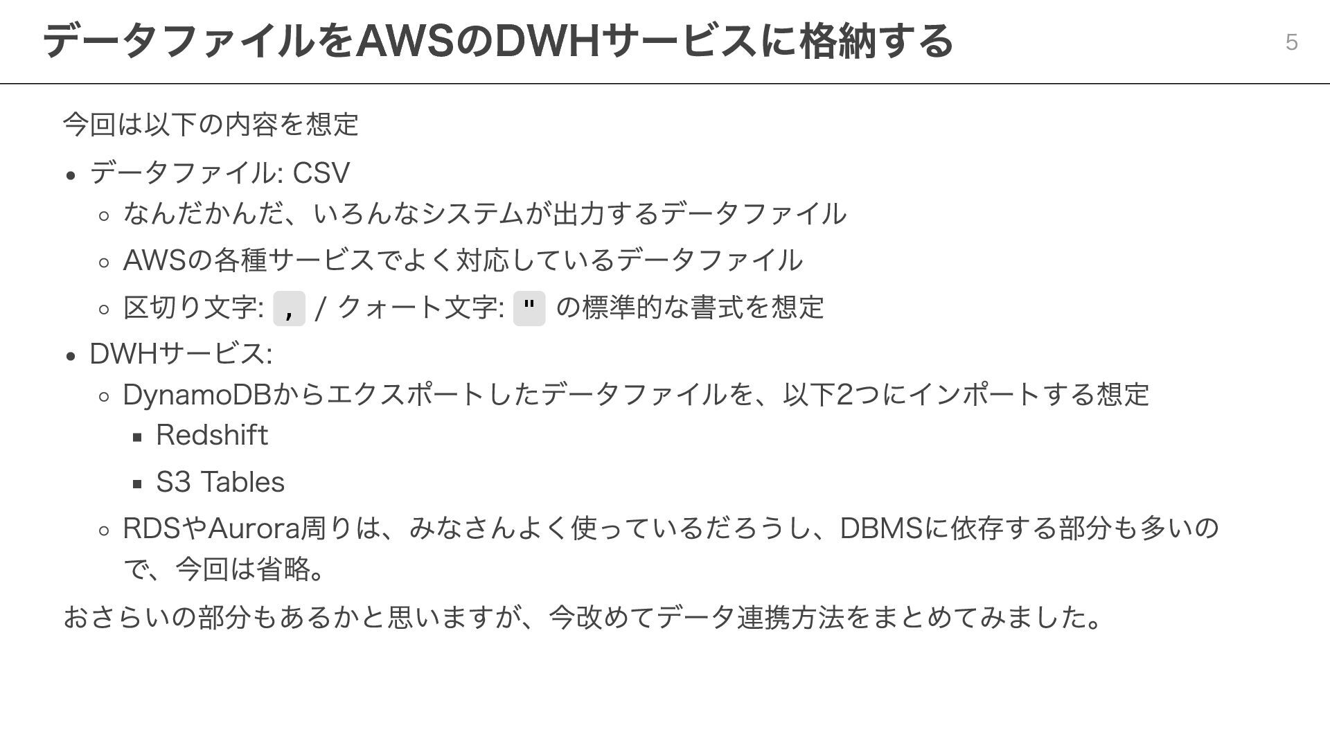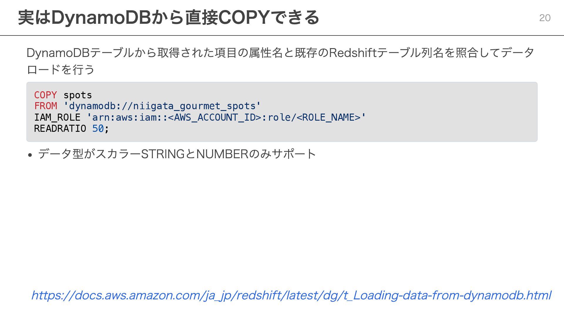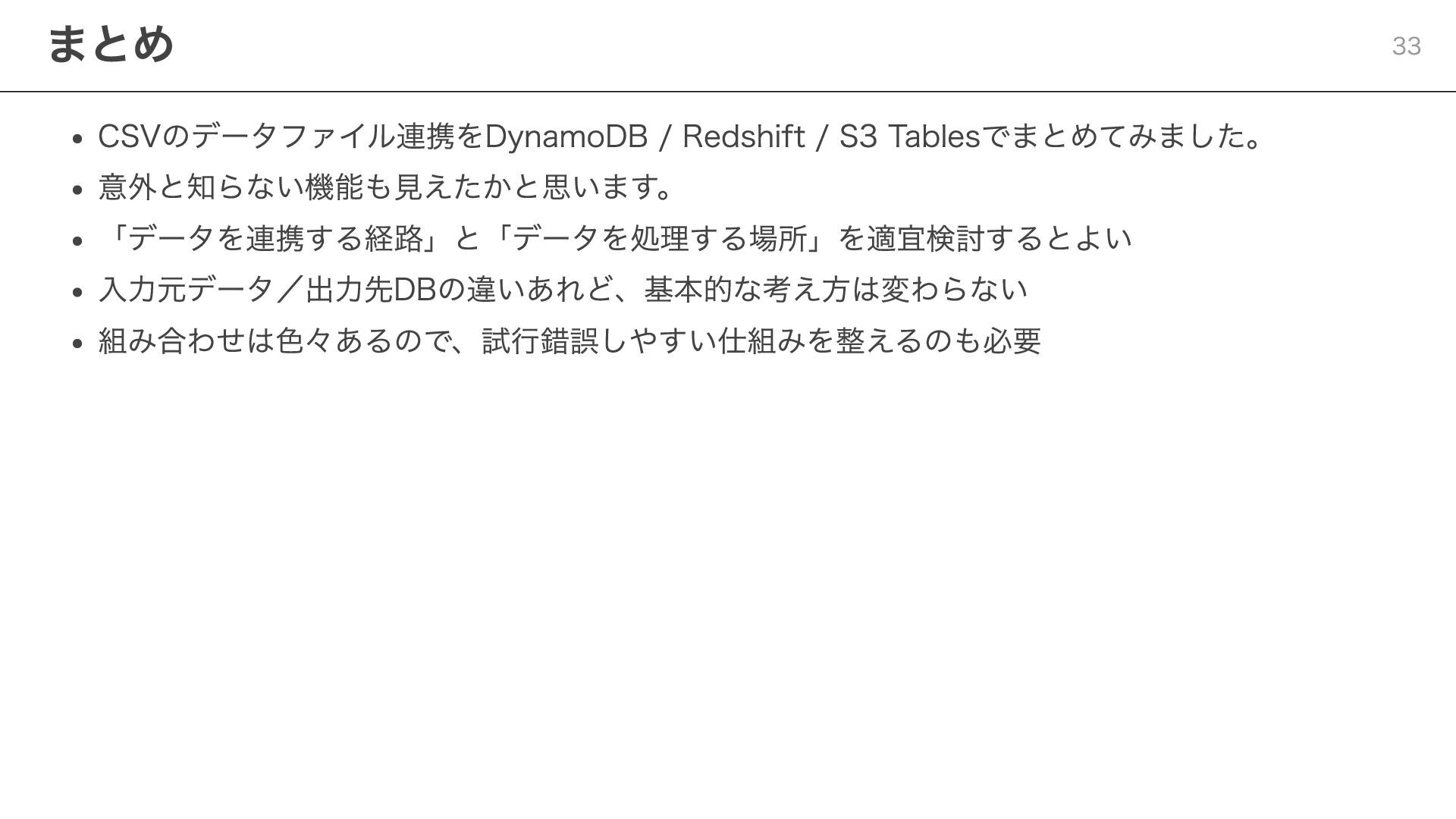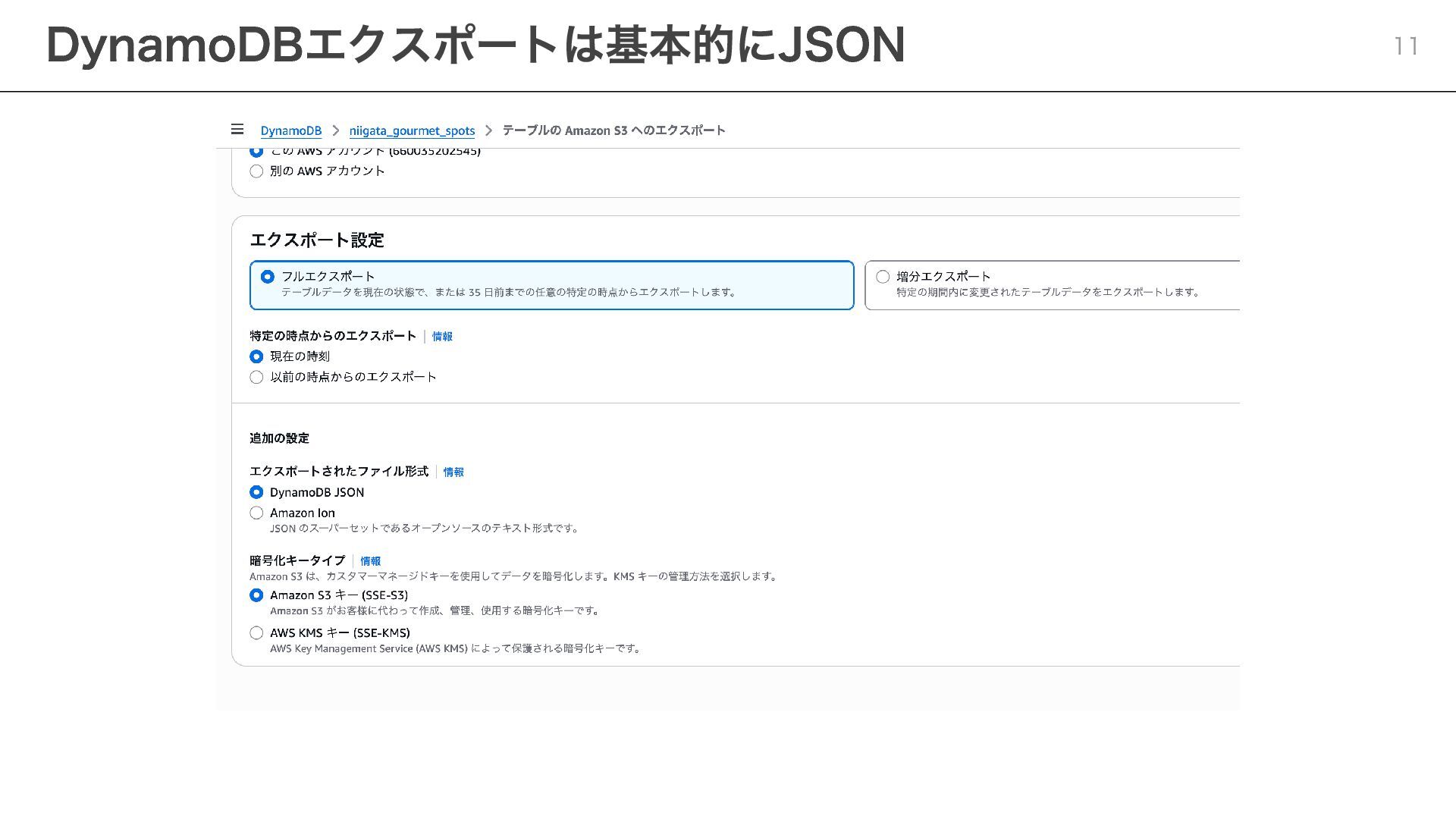 | [.id.S, .address.S, .business_hour.S, .image_url.S, .latitude.N, .longitude.N, .name.S, .website_url.S] | @csv' \ > spots.csv ちょっと工夫して、タグも文字列連結して出力 aws dynamodb scan --table-name niigata_gourmet_spots | \ jq -r '.Items[] | [.id.S, .address.S, .business_hour.S, .image_url.S, .latitude.N, .longitude.N, .name.S, ([.tags.L[].S] | join(",")), .website_url.S] | @csv' \ > spots.csv ヘッダ行が必要な場合は、ヘッダ用の配列を追加しておく。 aws dynamodb scan --table-name niigata_gourmet_spots | \ jq -r '["id","address","business_hour","image_url","latitude","longitude","name","tags","website_url"], (.Items[] | [.id.S, .address.S, .business_hour.S, .image_url.S, .latitude.N, .longitude.N, .name.S, ([.tags.L[].S] | join(",")), .website_url.S]) | @csv' \ > spots.csv jqで応用は効くが、面倒ではある AWS CLIでCSV出力 13
