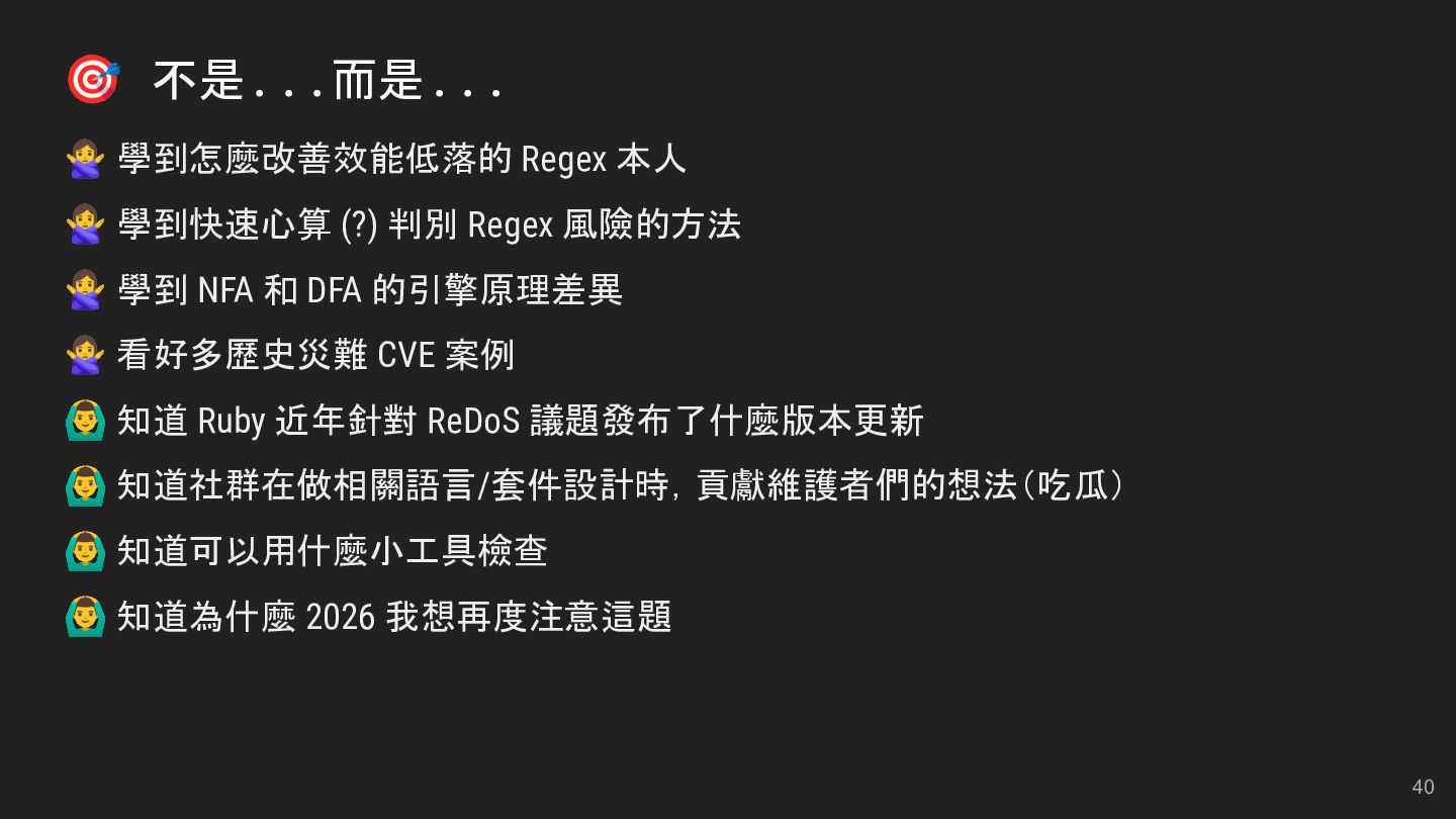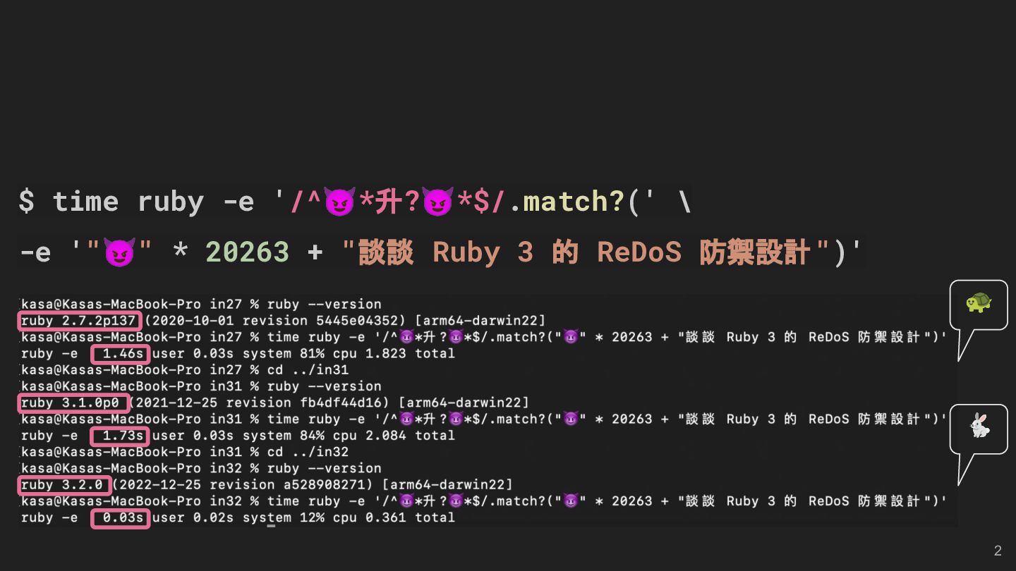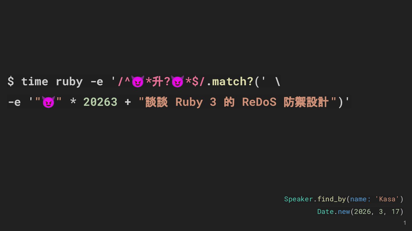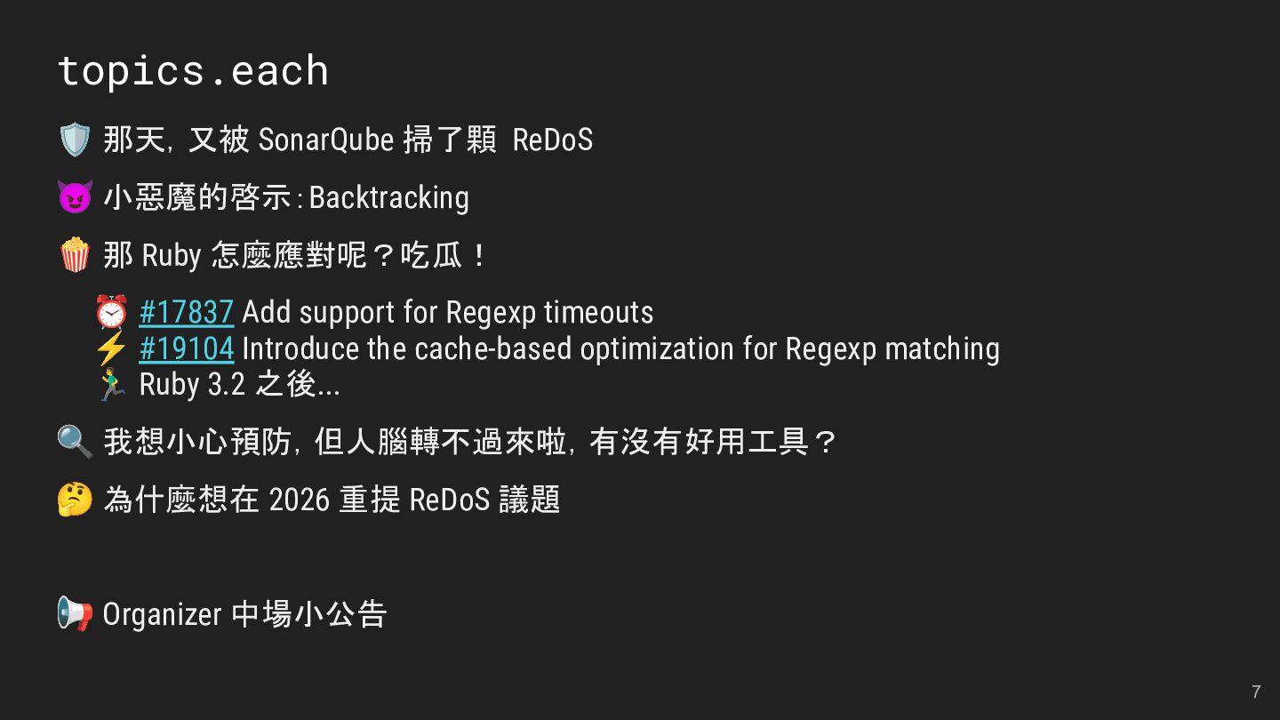 2022 年底,Ruby 3.2 大幅改善了 Regexp 的安全性與效能;隨著 Ruby 4 發佈、Ruby 3.2 即將進入 EOL,來談談 #17837 與 #19104 的設計與權衡,以及為何在 2026 更應重視 ReDoS 議題。
