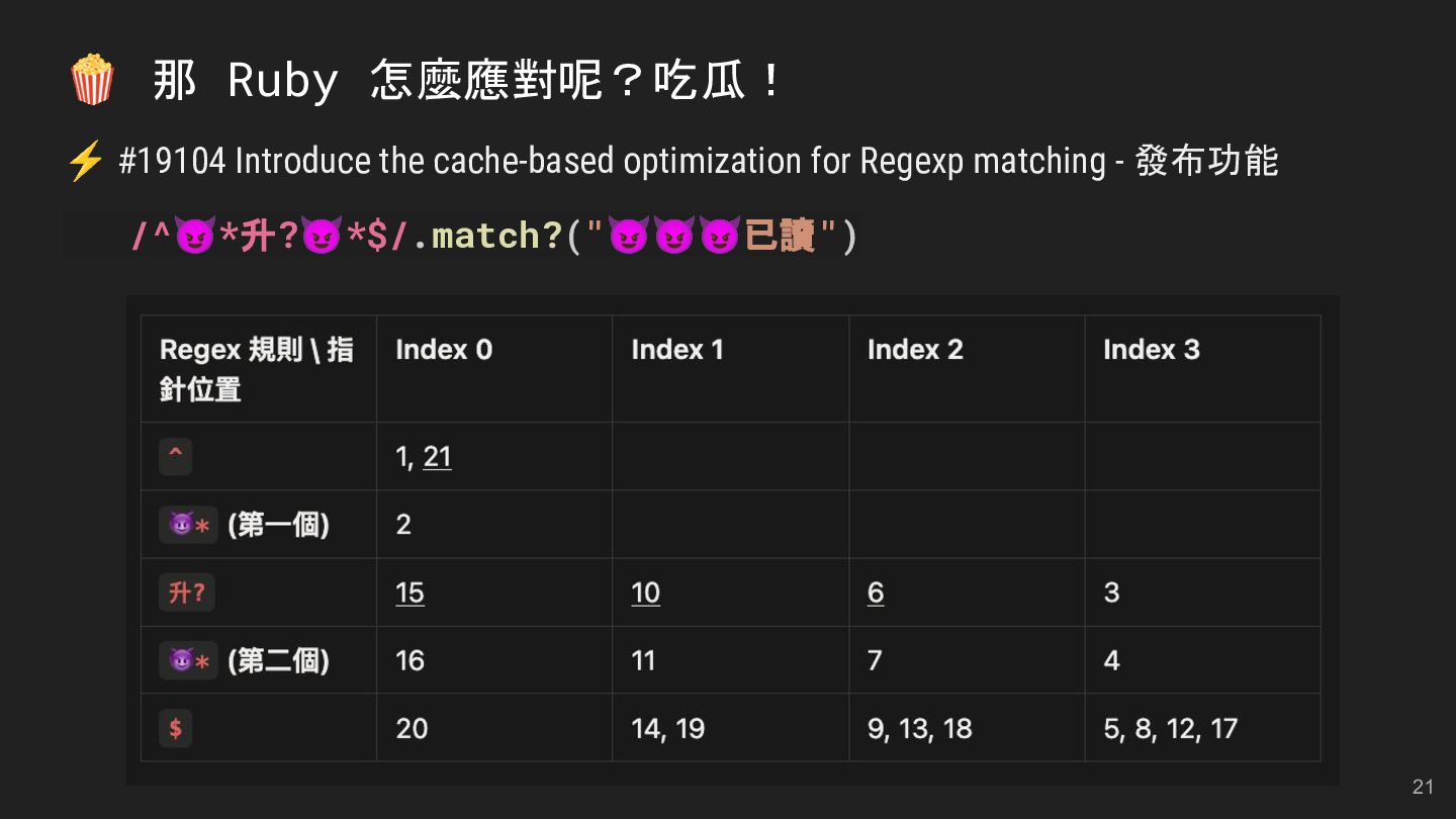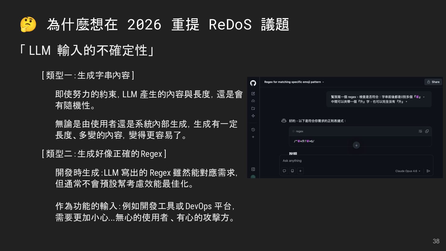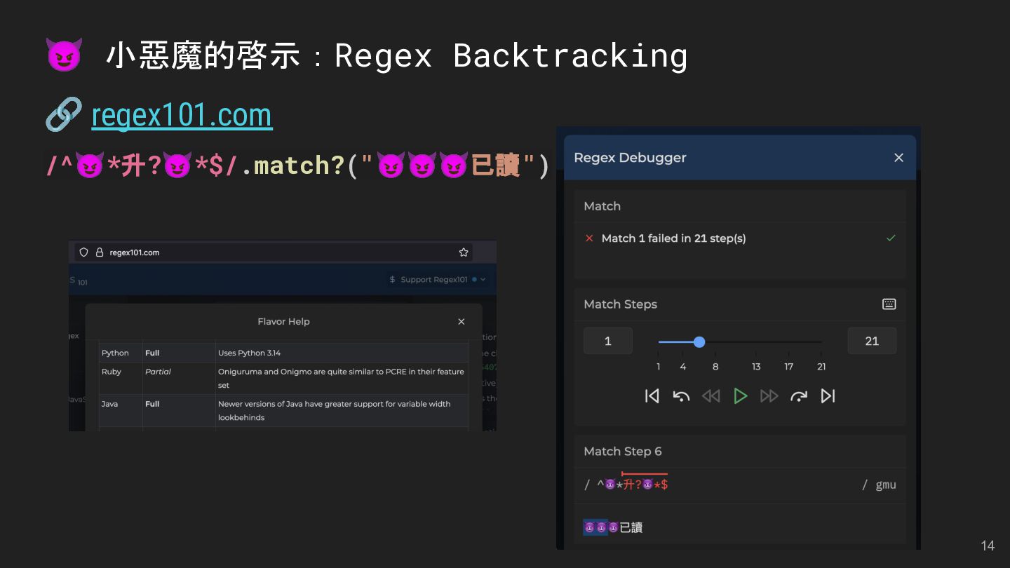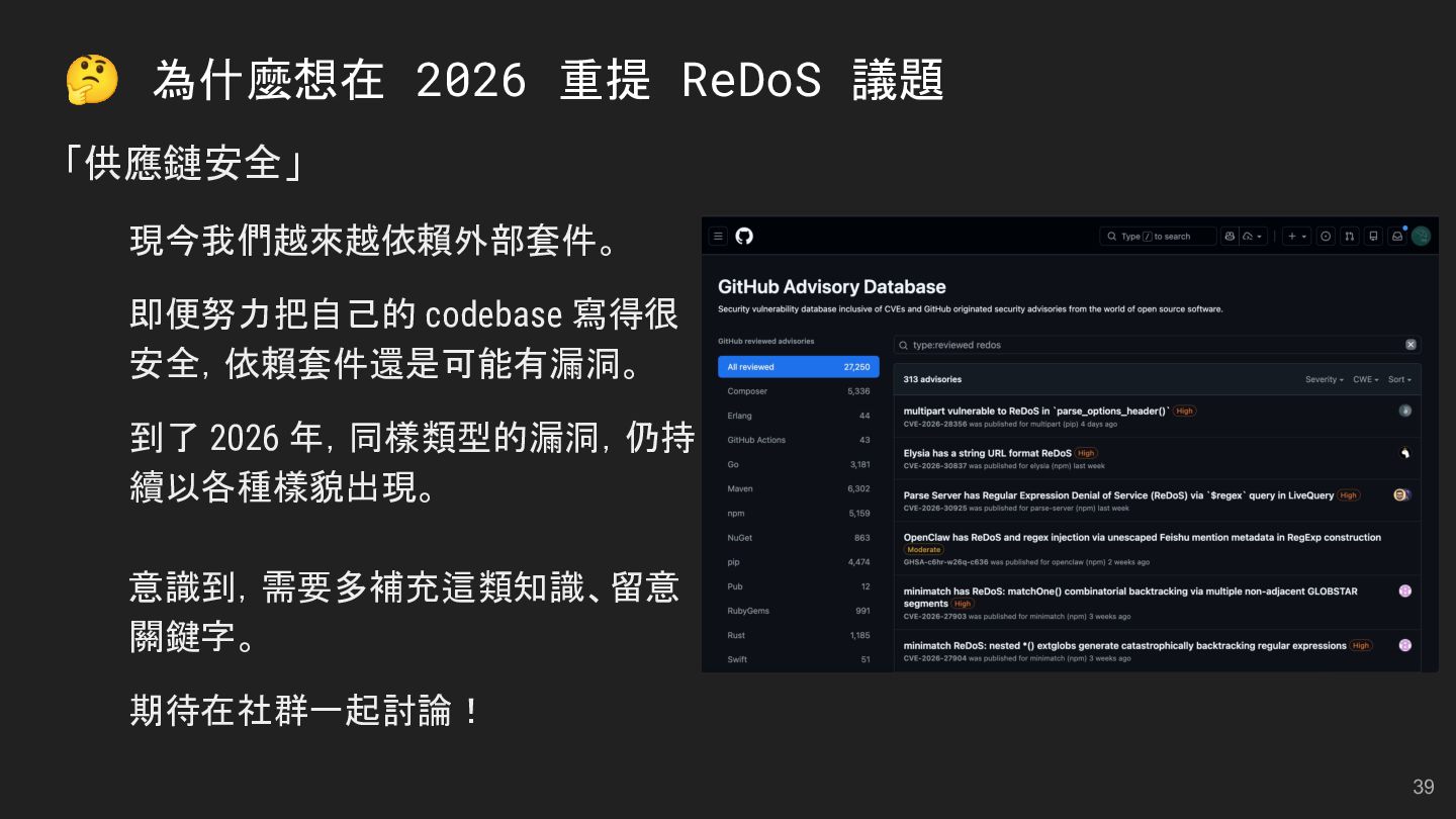 2022 年底,Ruby 3.2 大幅改善了 Regexp 的安全性與效能;隨著 Ruby 4 發佈、Ruby 3.2 即將進入 EOL,來談談 #17837 與 #19104 的設計與權衡,以及為何在 2026 更應重視 ReDoS 議題。