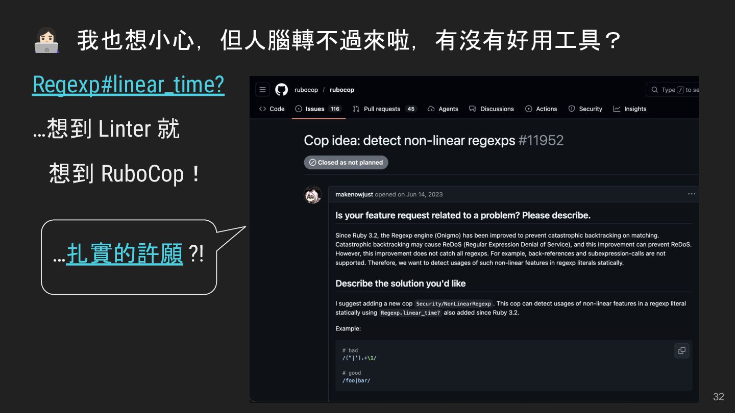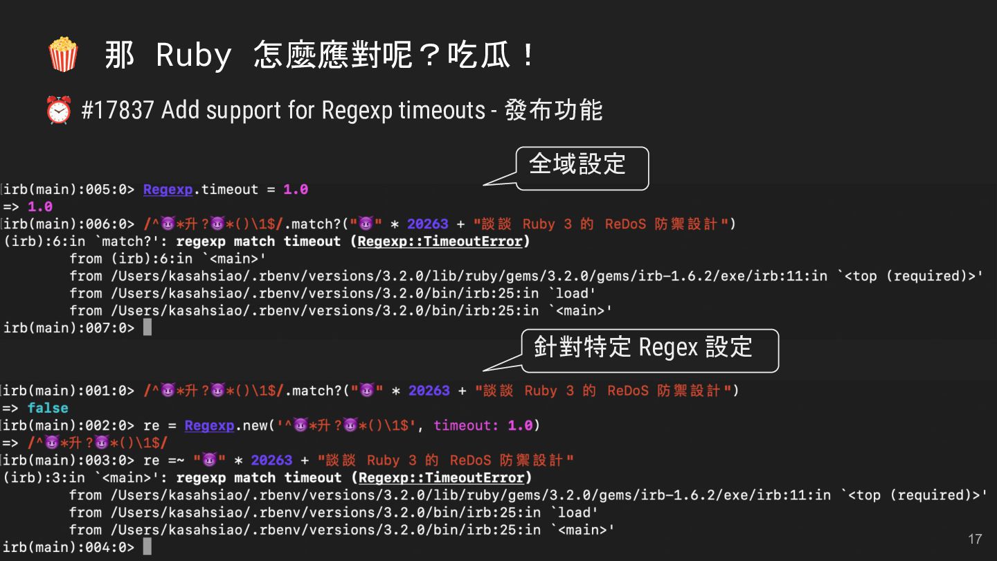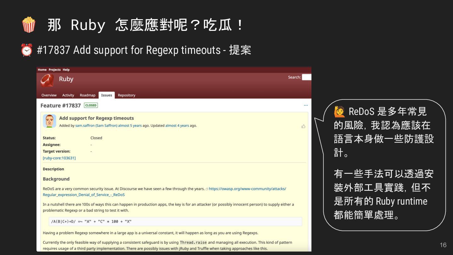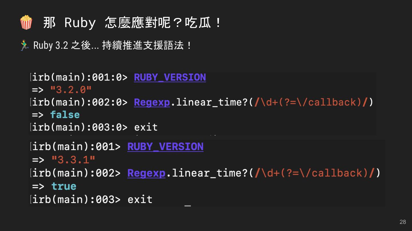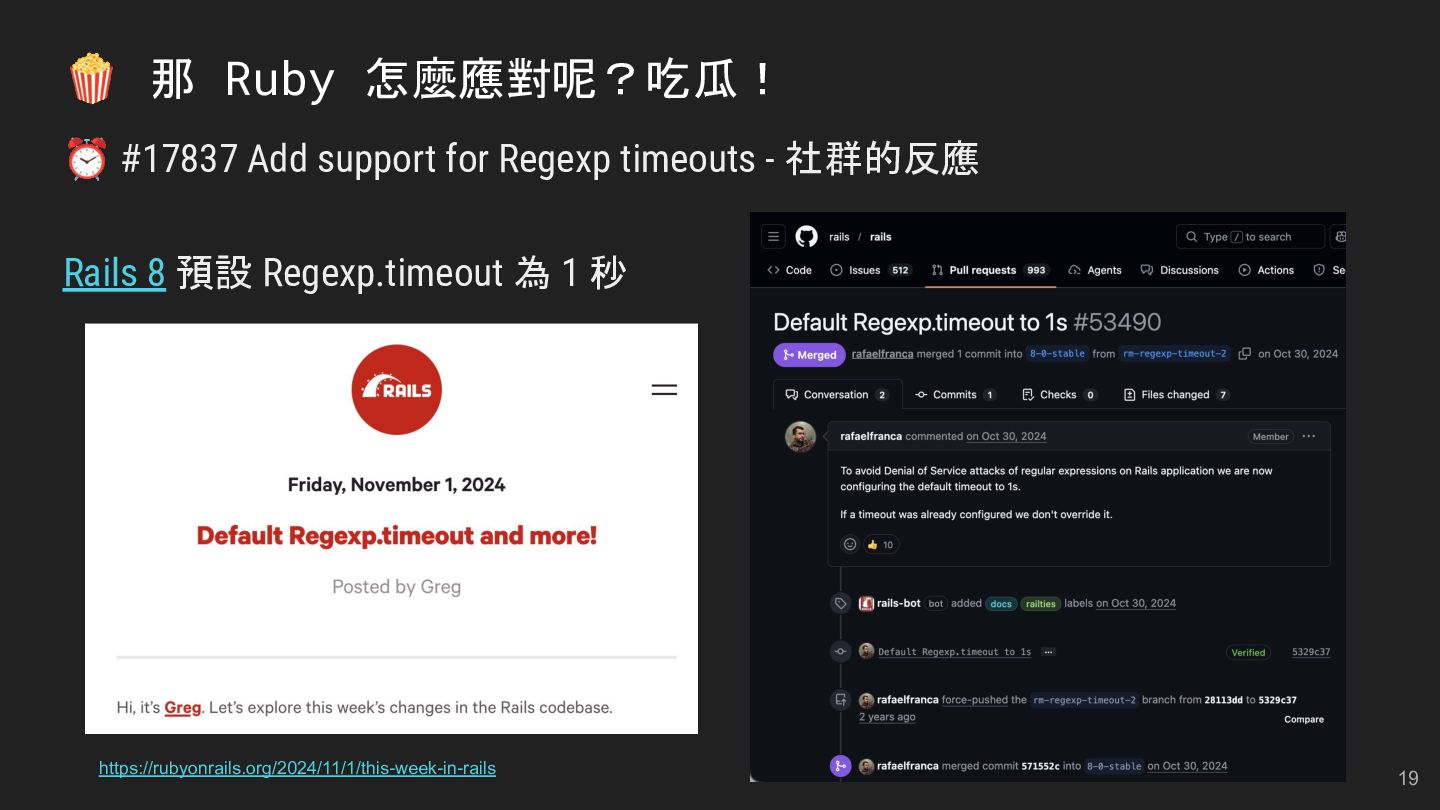 WebConf 2025 Huli 的演講重燃大家對 ReDoS 的關注,那 Ruby 圈是如何應對此安全性議題呢?