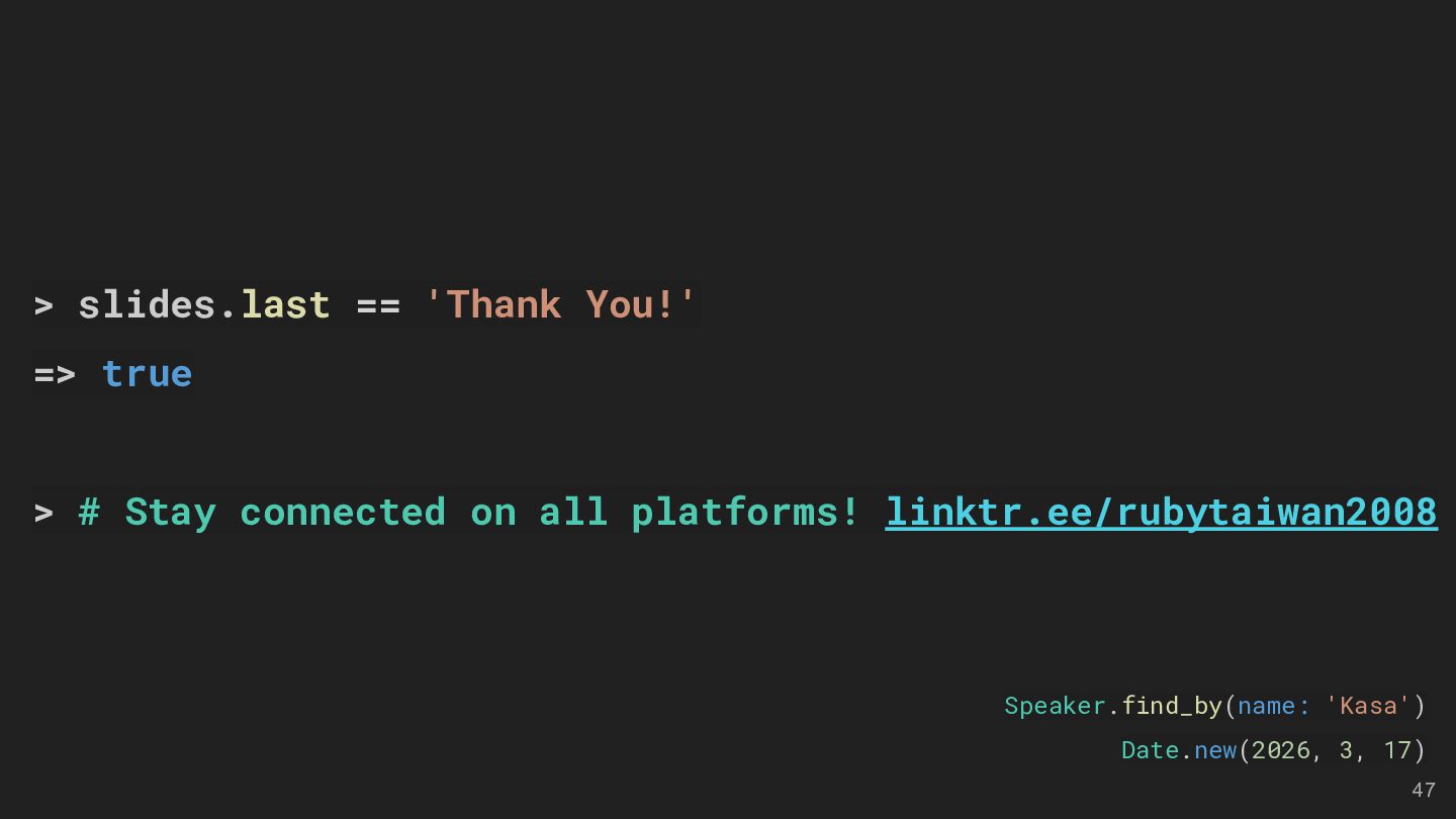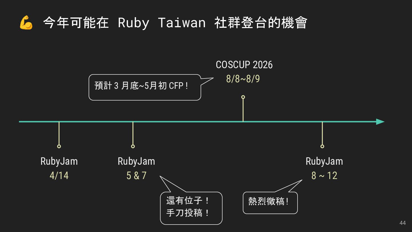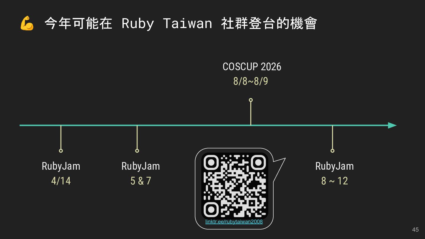 • Ruby Taiwan 更多社群資訊 : https://linktr.ee/rubytaiwan2008