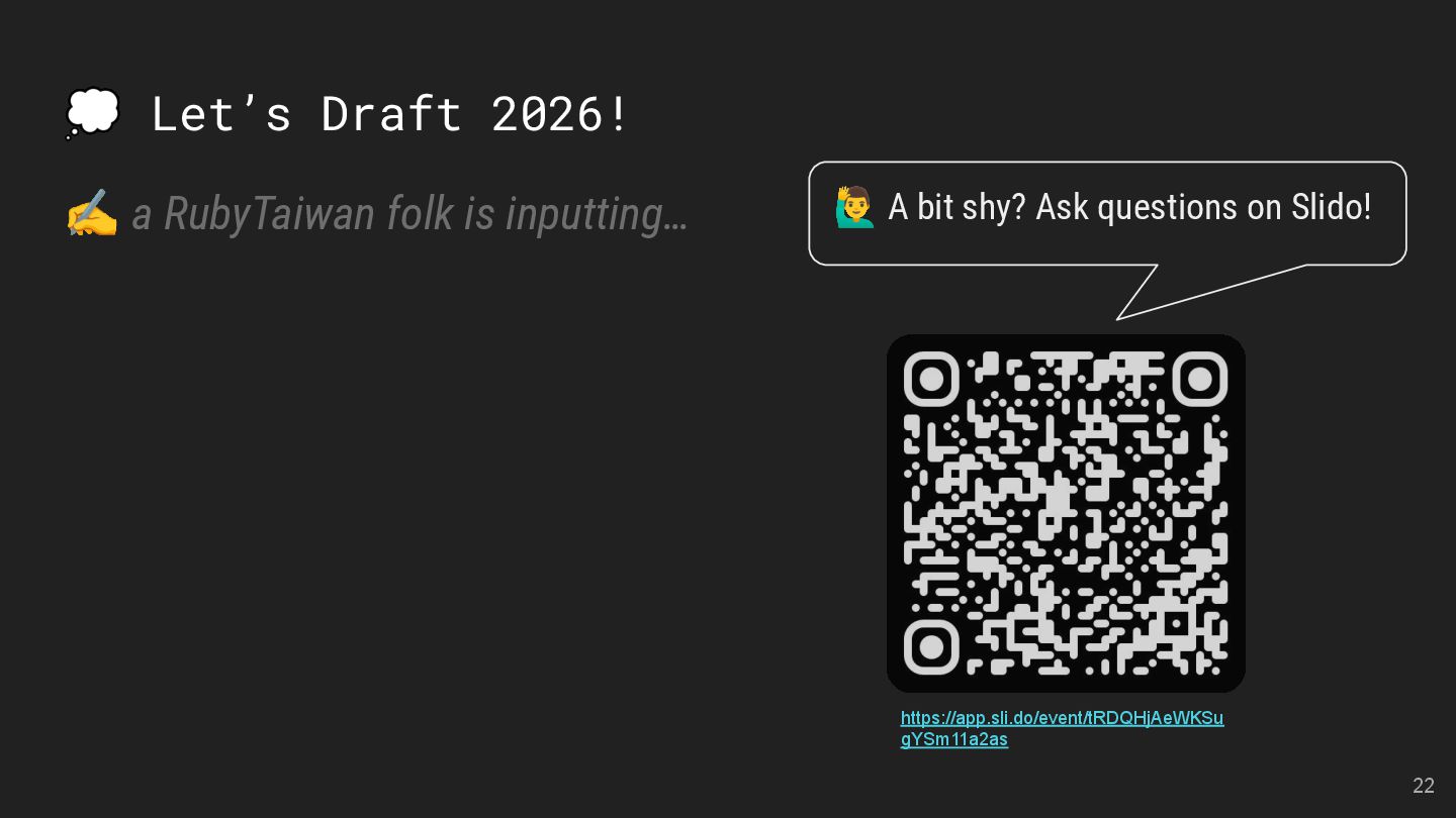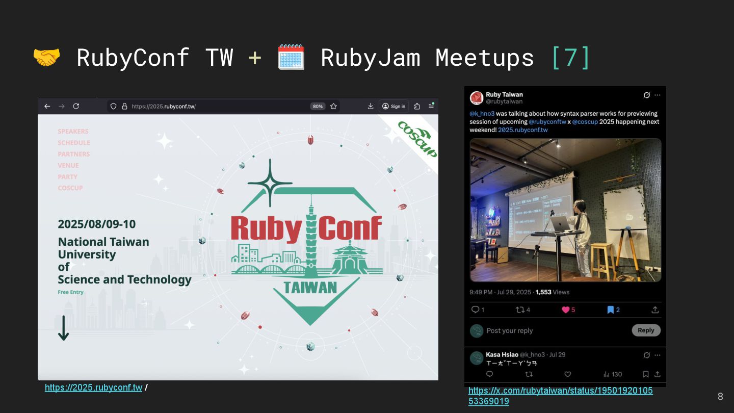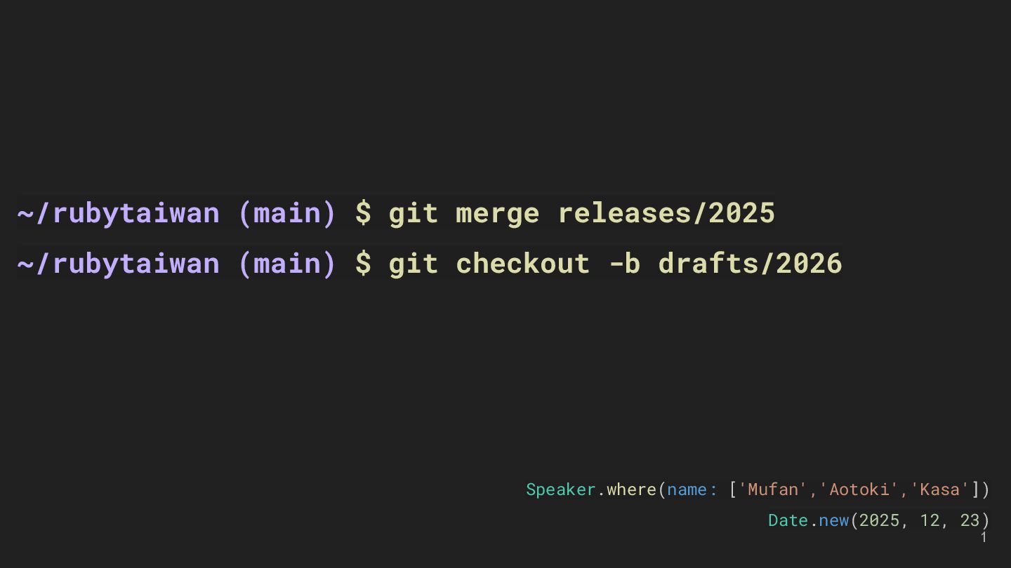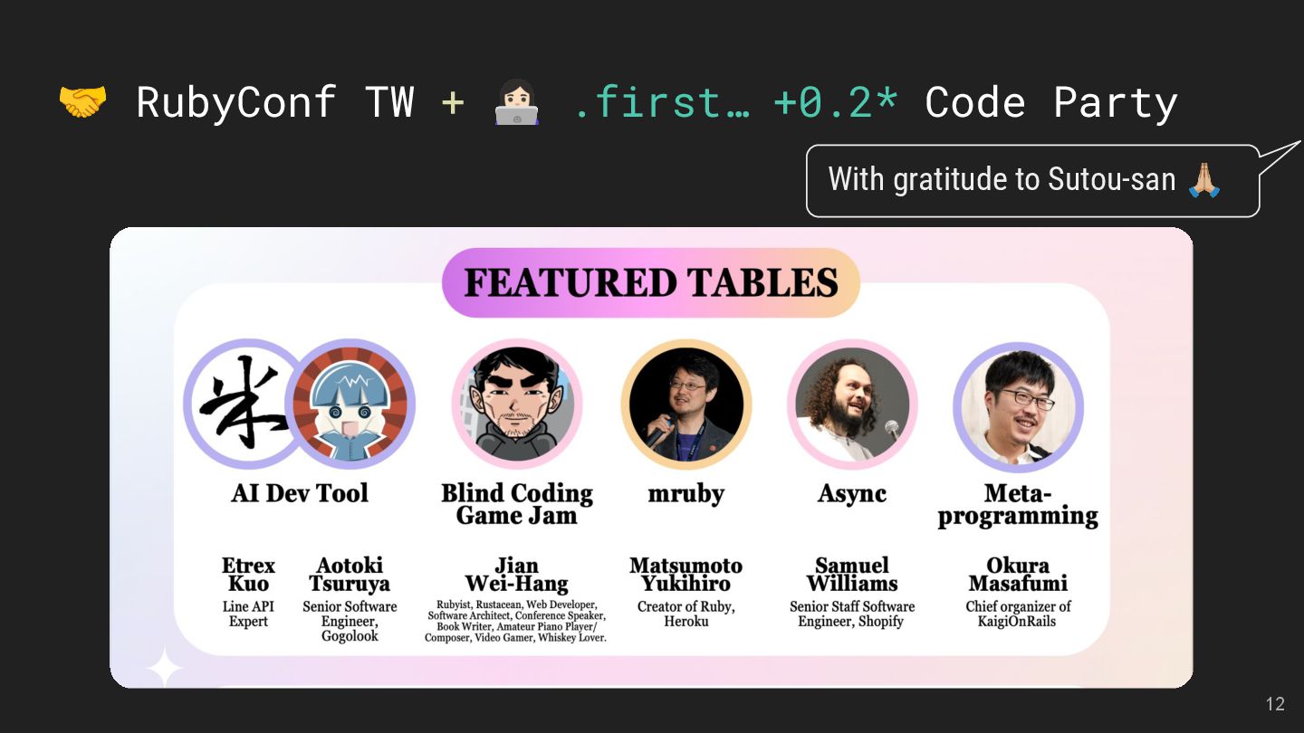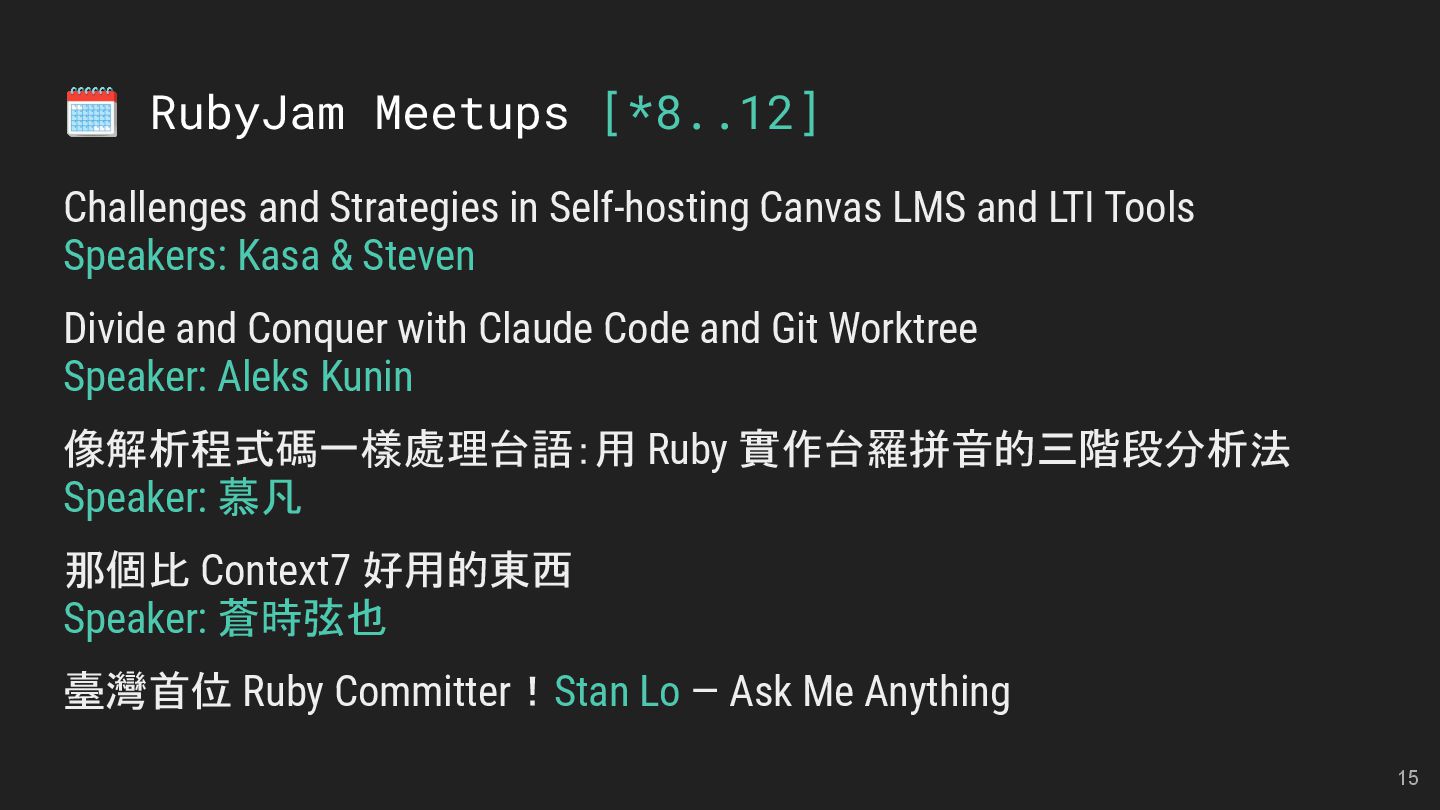 LMS and LTI Tools Speakers: Kasa & Steven Divide and Conquer with Claude Code and Git Worktree Speaker: Aleks Kunin 像解析程式碼一樣處理台語:用 Ruby 實作台羅拼音的三階段分析法 Speaker: 慕凡 那個比 Context7 好用的東西 Speaker: 蒼時弦也 臺灣首位 Ruby Committer!Stan Lo — Ask Me Anything 15