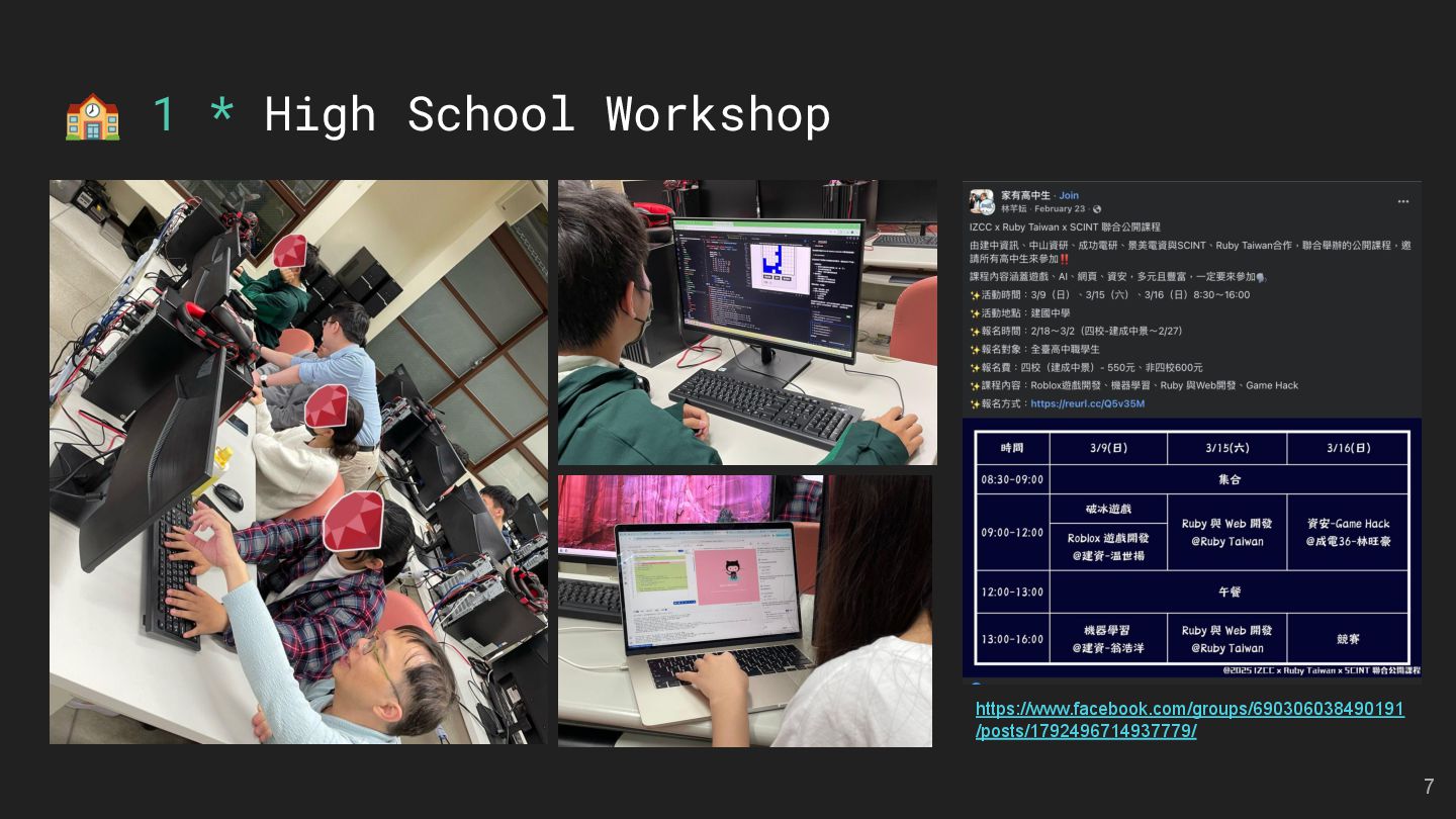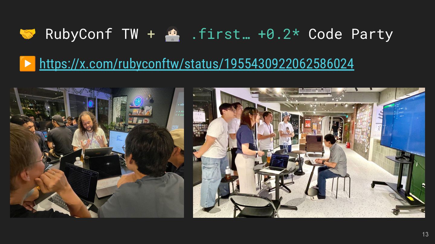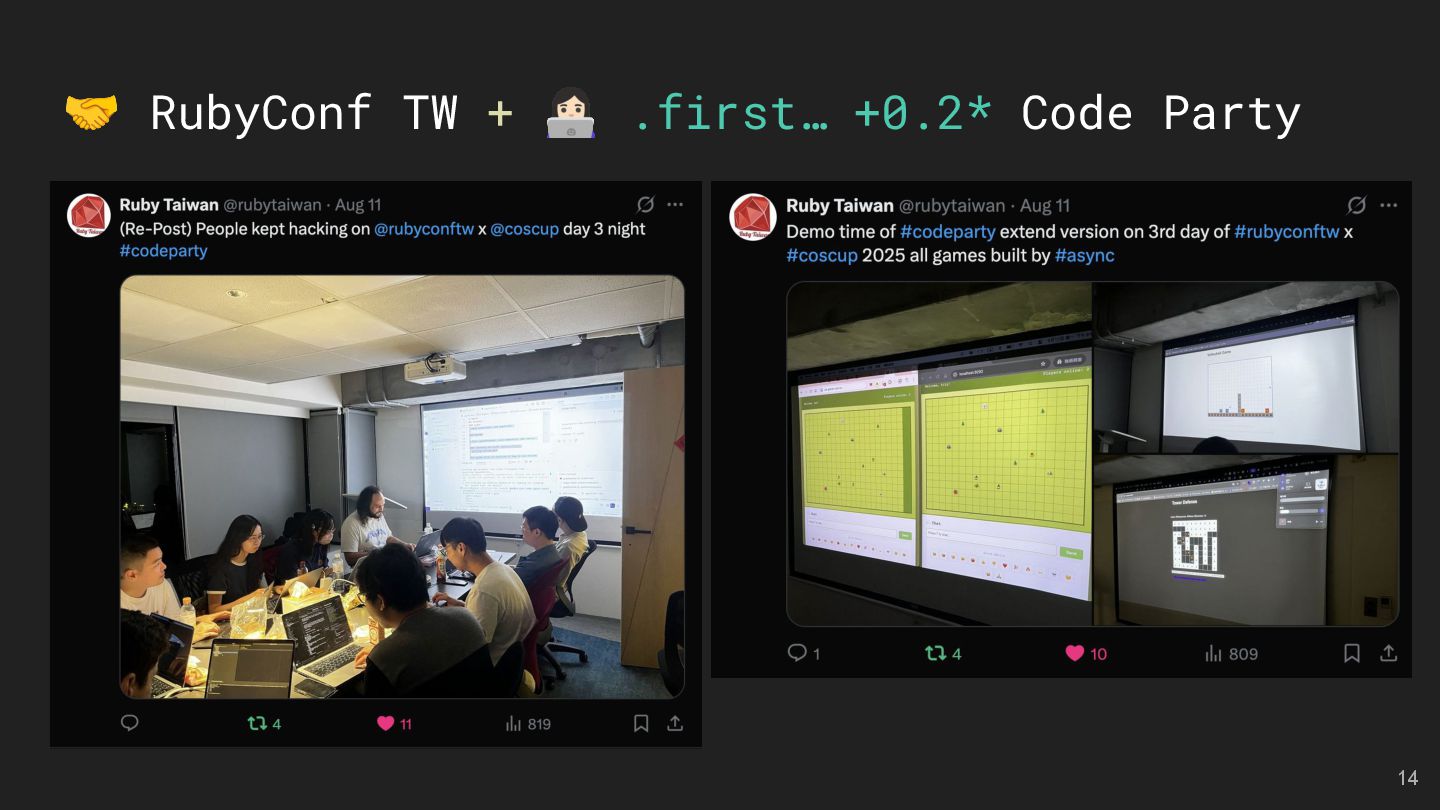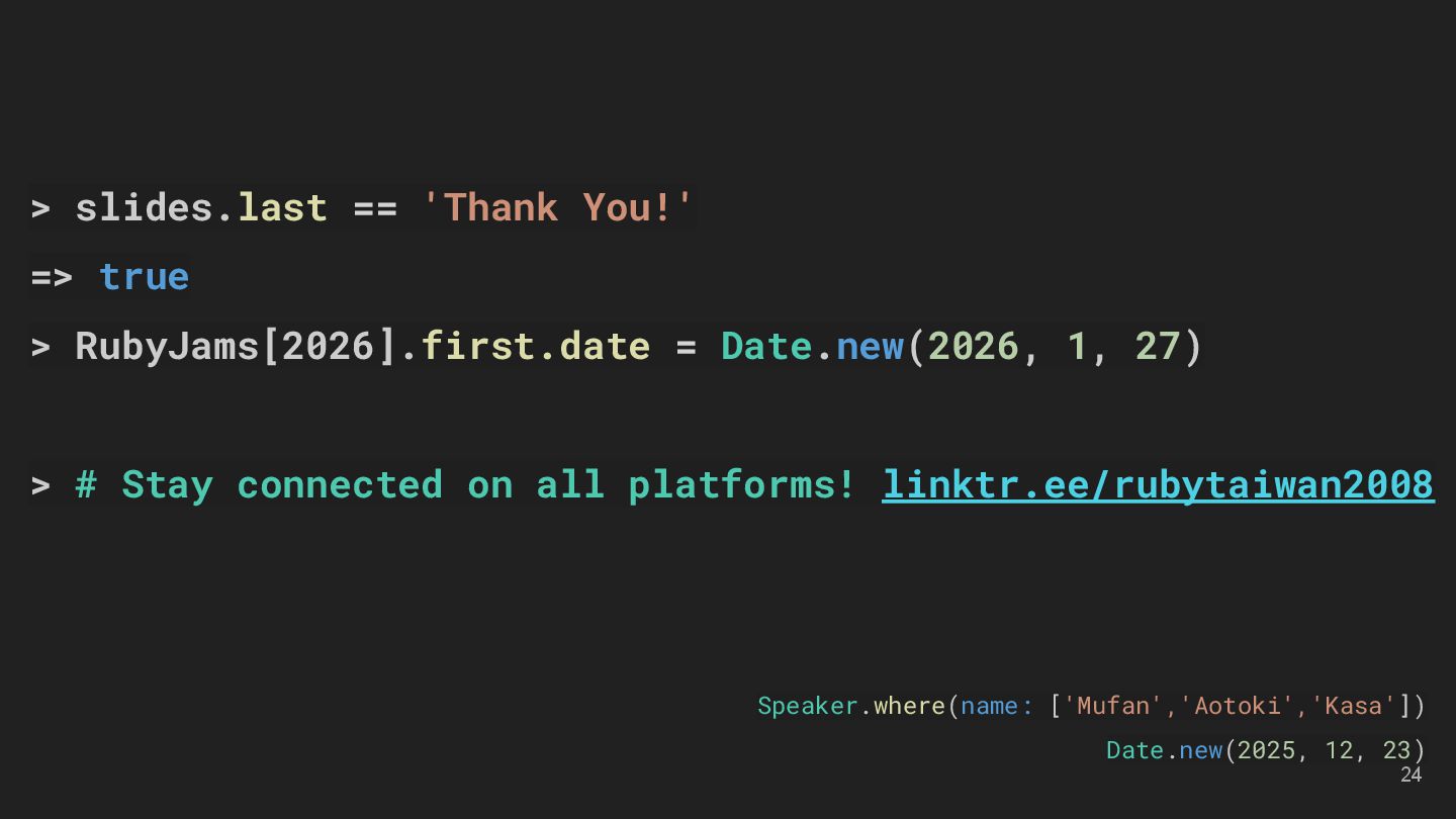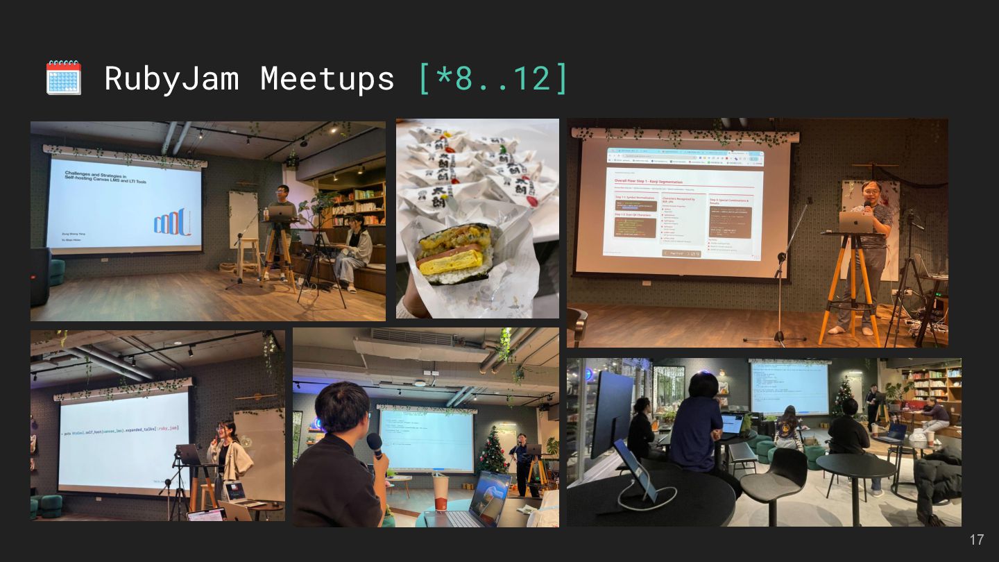 LMS and LTI Tools Speakers: Kasa & Steven Divide and Conquer with Claude Code and Git Worktree Speaker: Aleks Kunin 像解析程式碼一樣處理台語:用 Ruby 實作台羅拼音的三階段分析法 Speaker: 慕凡 那個比 Context7 好用的東西 Speaker: 蒼時弦也 臺灣首位 Ruby Committer!Stan Lo — Ask Me Anything 15