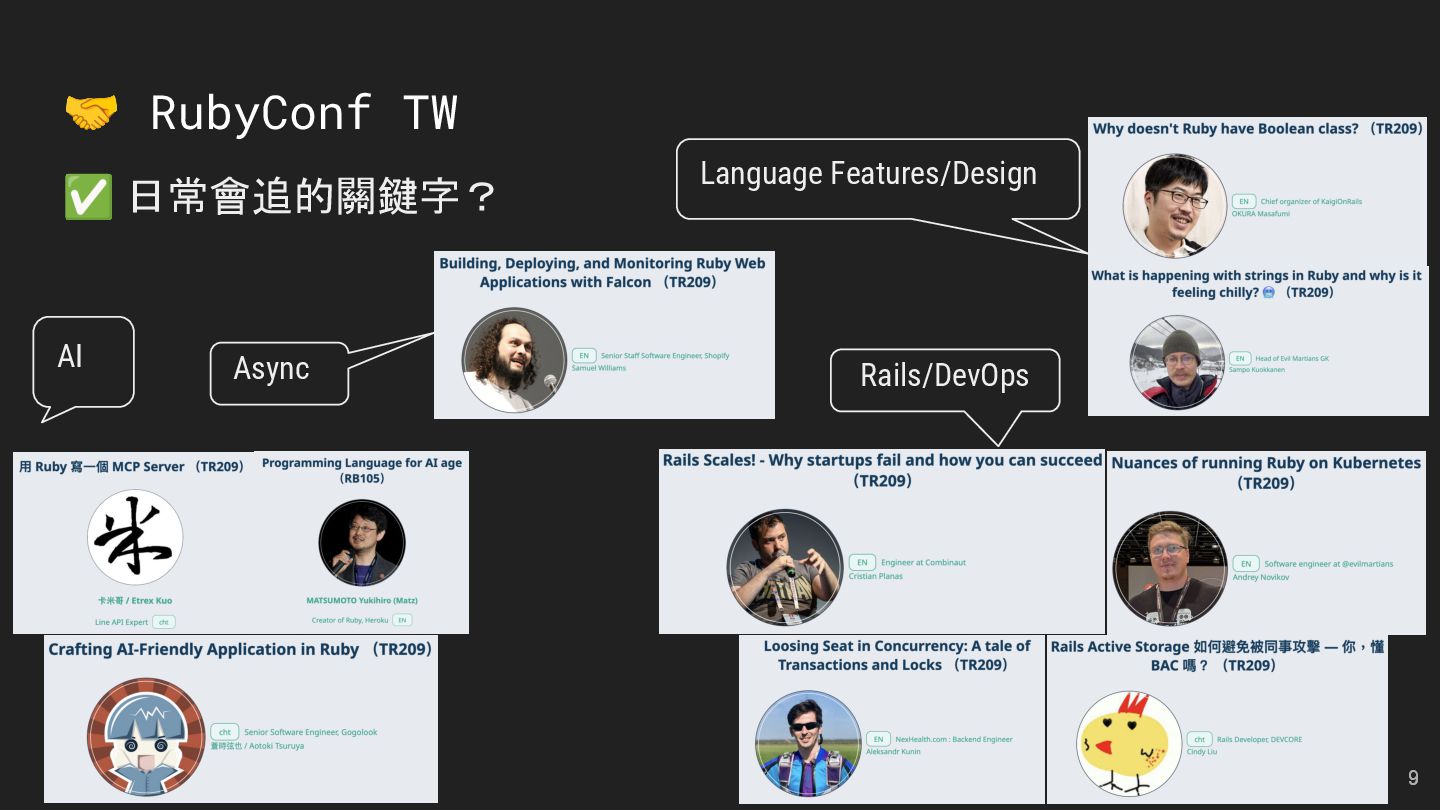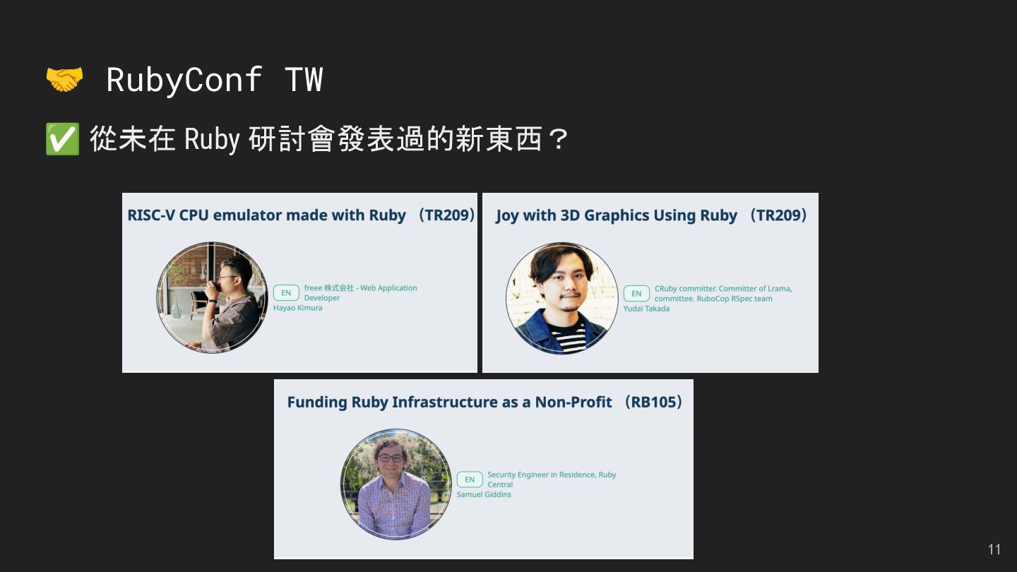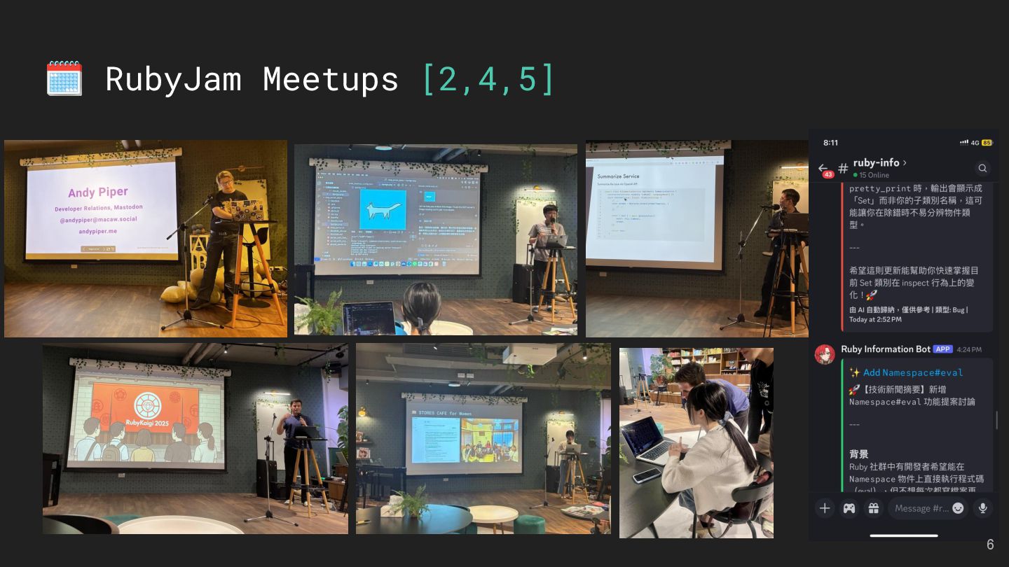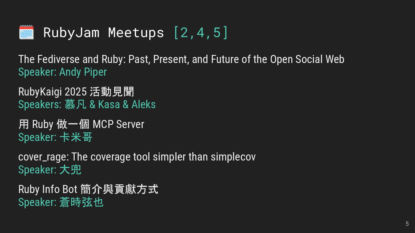 and Future of the Open Social Web Speaker: Andy Piper RubyKaigi 2025 活動見聞 Speakers: 慕凡 & Kasa & Aleks 用 Ruby 做一個 MCP Server Speaker: 卡米哥 cover_rage: The coverage tool simpler than simplecov Speaker: 大兜 Ruby Info Bot 簡介與貢獻方式 Speaker: 蒼時弦也 5