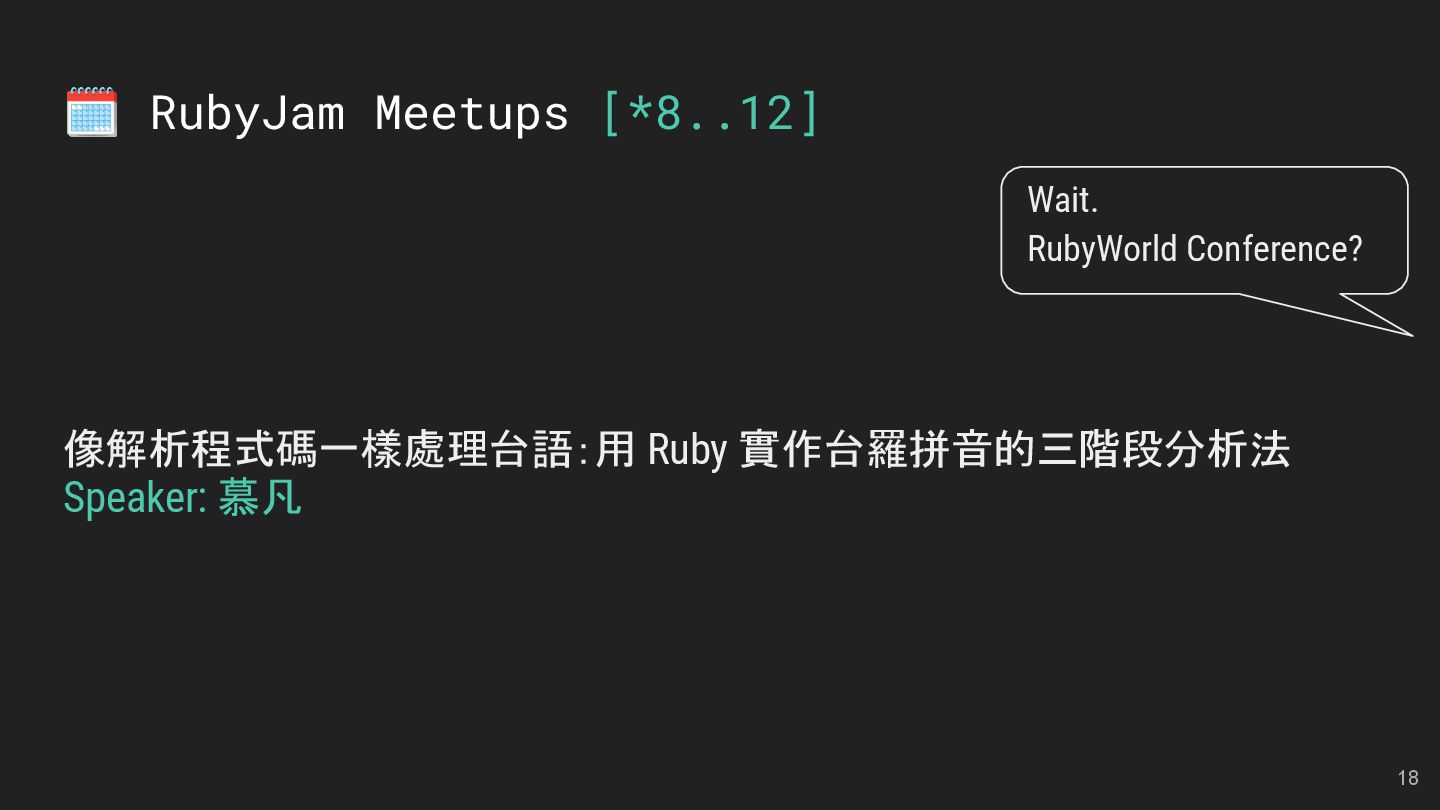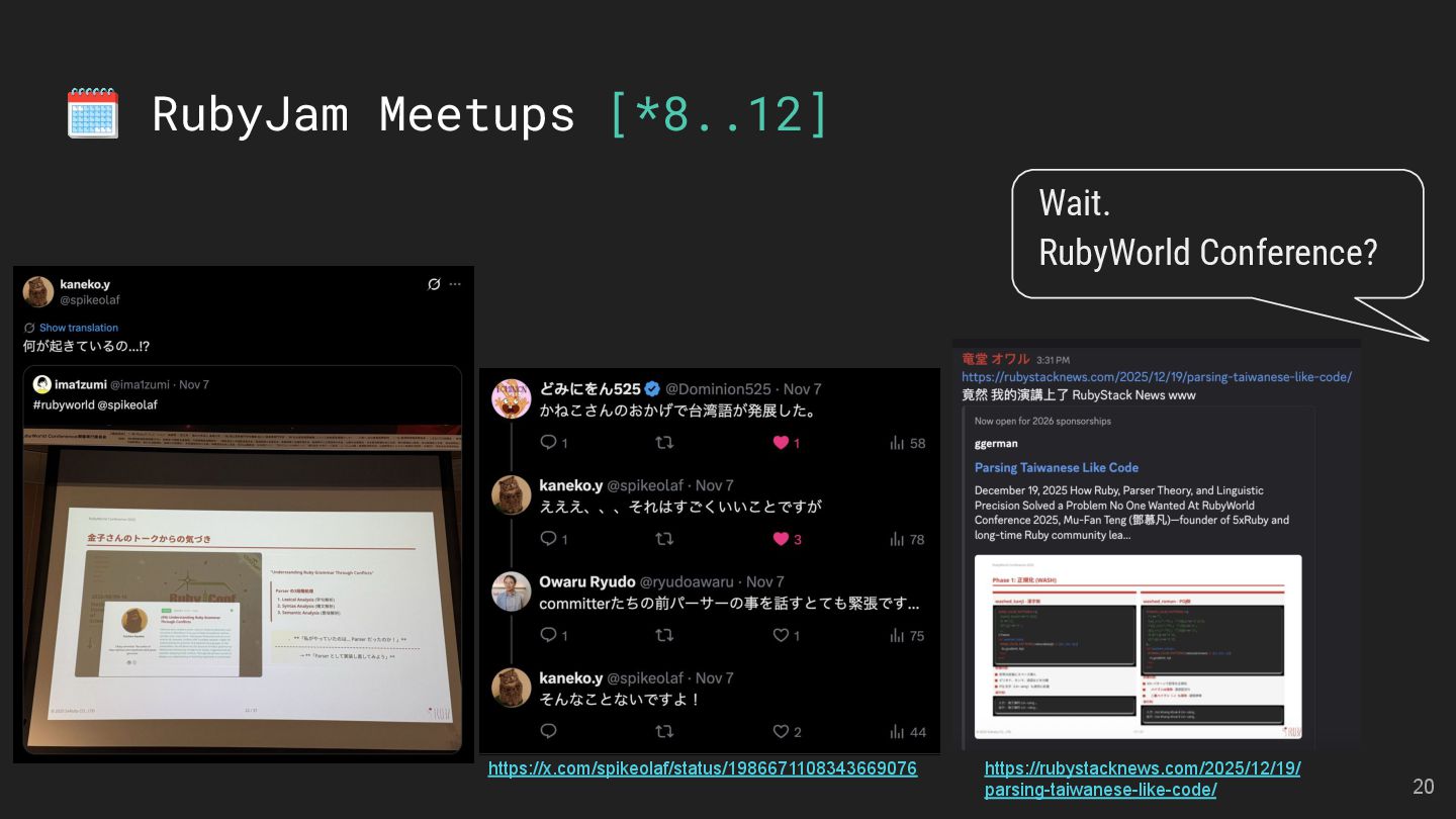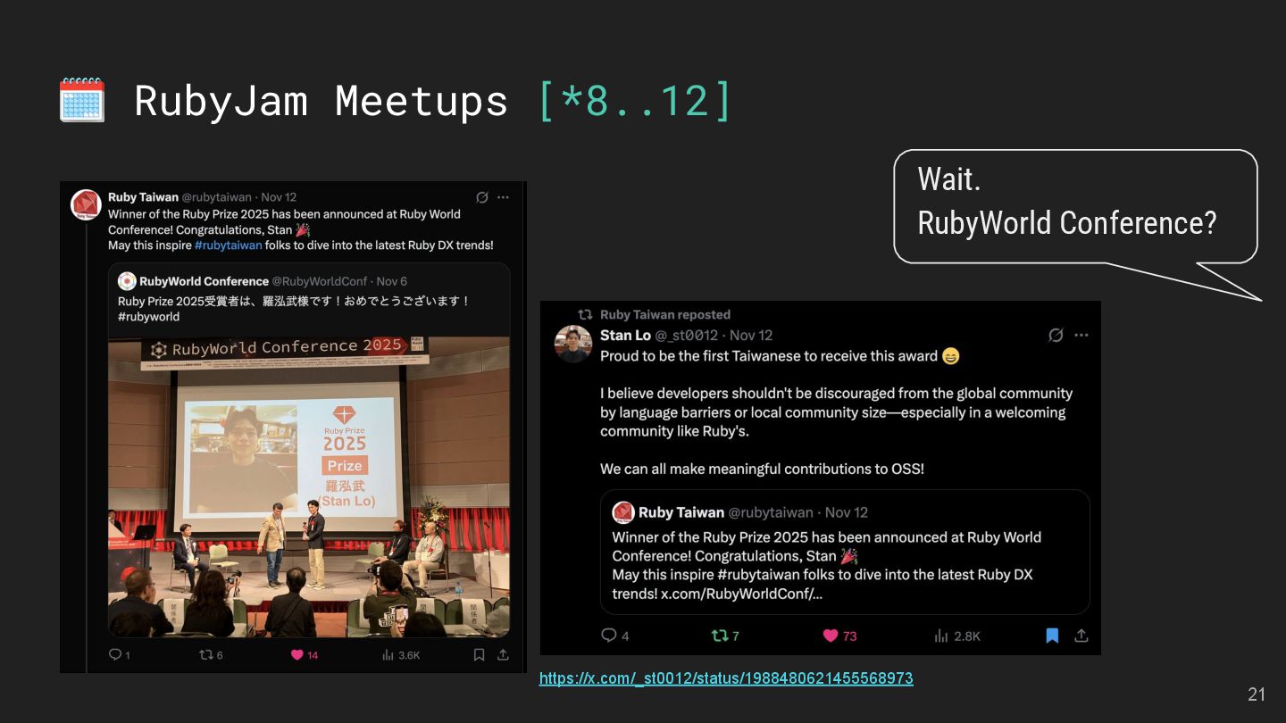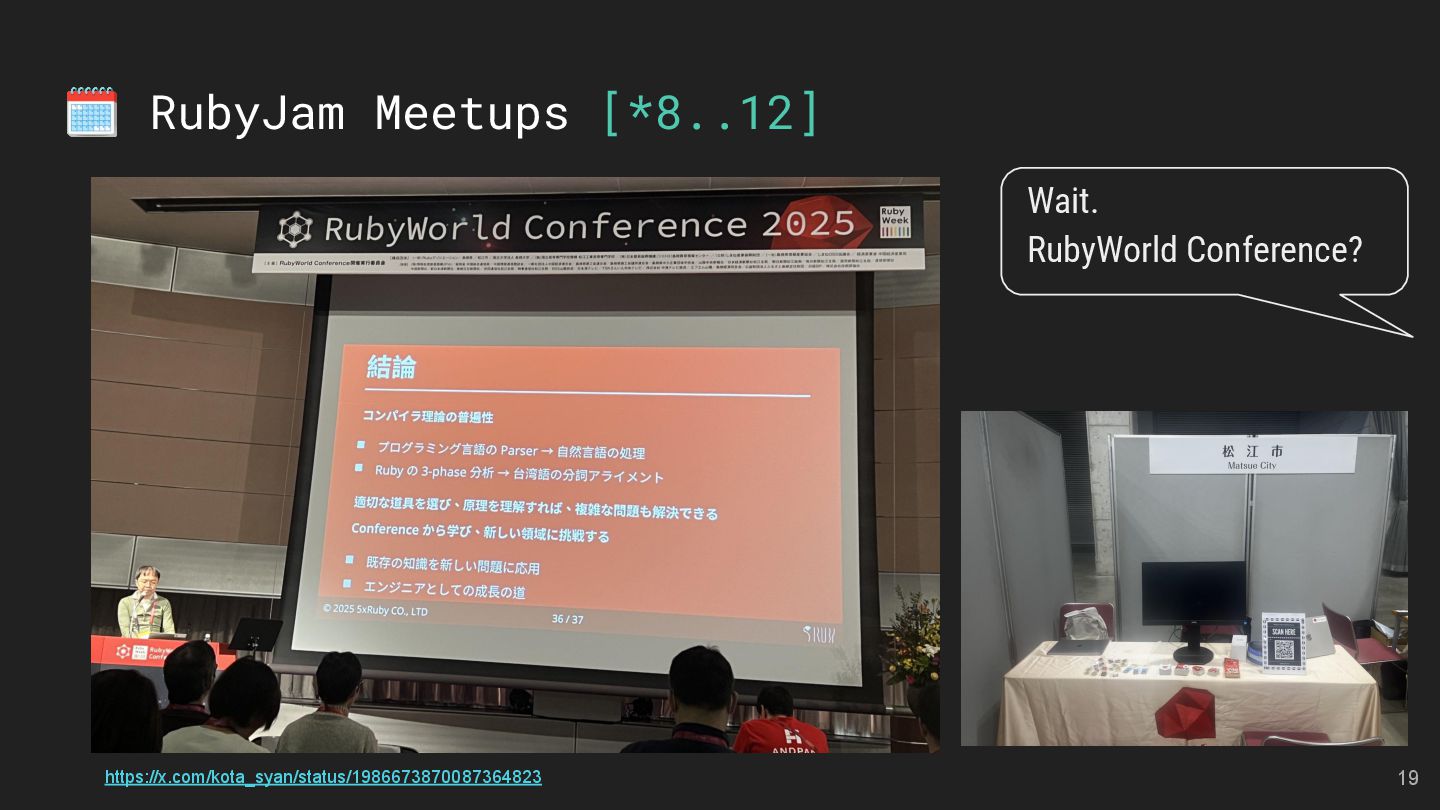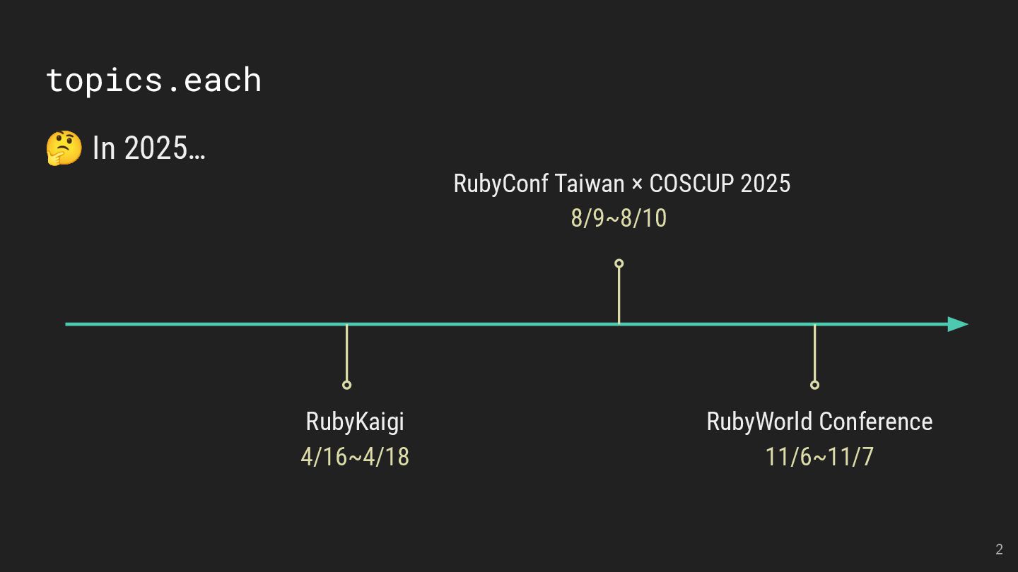 and Future of the Open Social Web Speaker: Andy Piper RubyKaigi 2025 活動見聞 Speakers: 慕凡 & Kasa & Aleks 用 Ruby 做一個 MCP Server Speaker: 卡米哥 cover_rage: The coverage tool simpler than simplecov Speaker: 大兜 Ruby Info Bot 簡介與貢獻方式 Speaker: 蒼時弦也 5