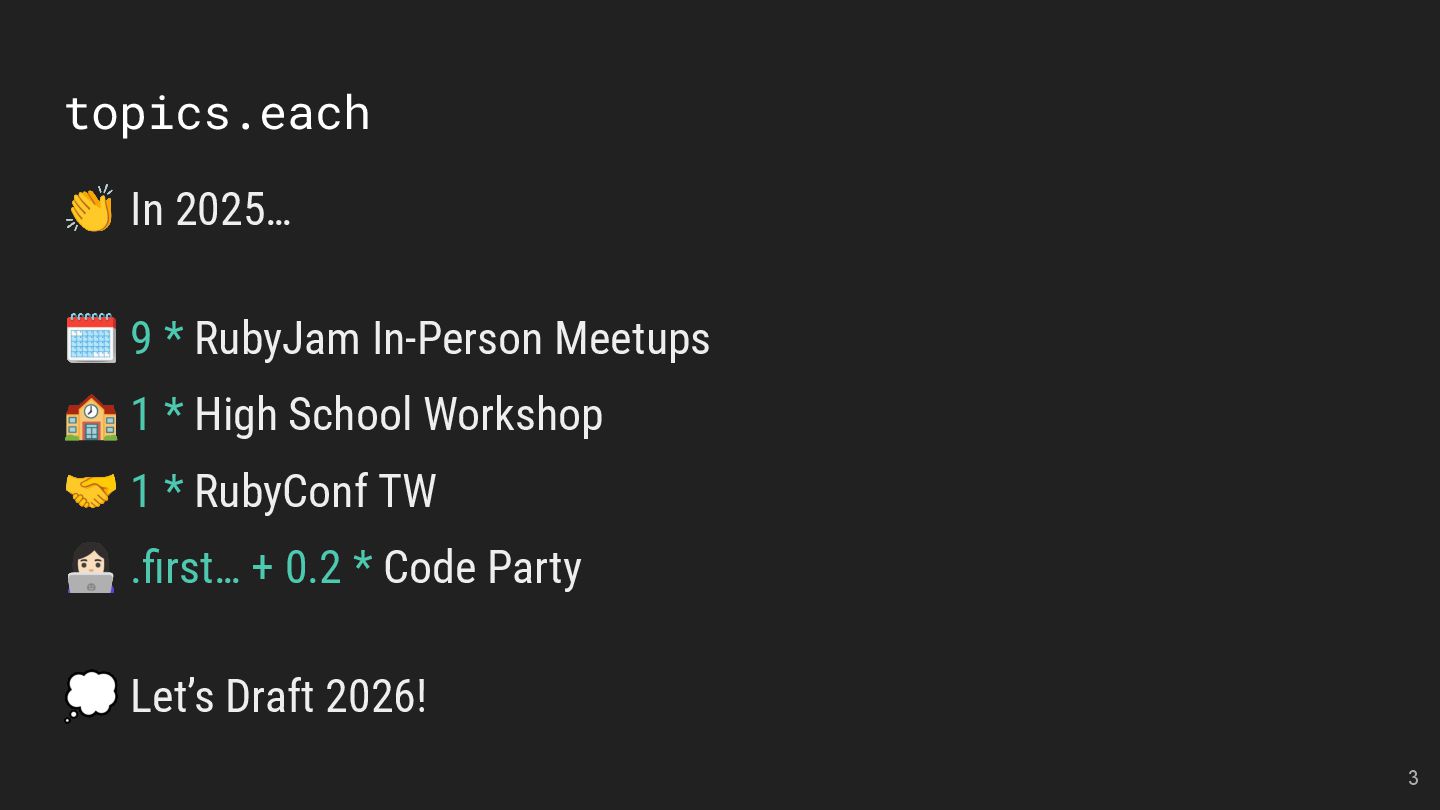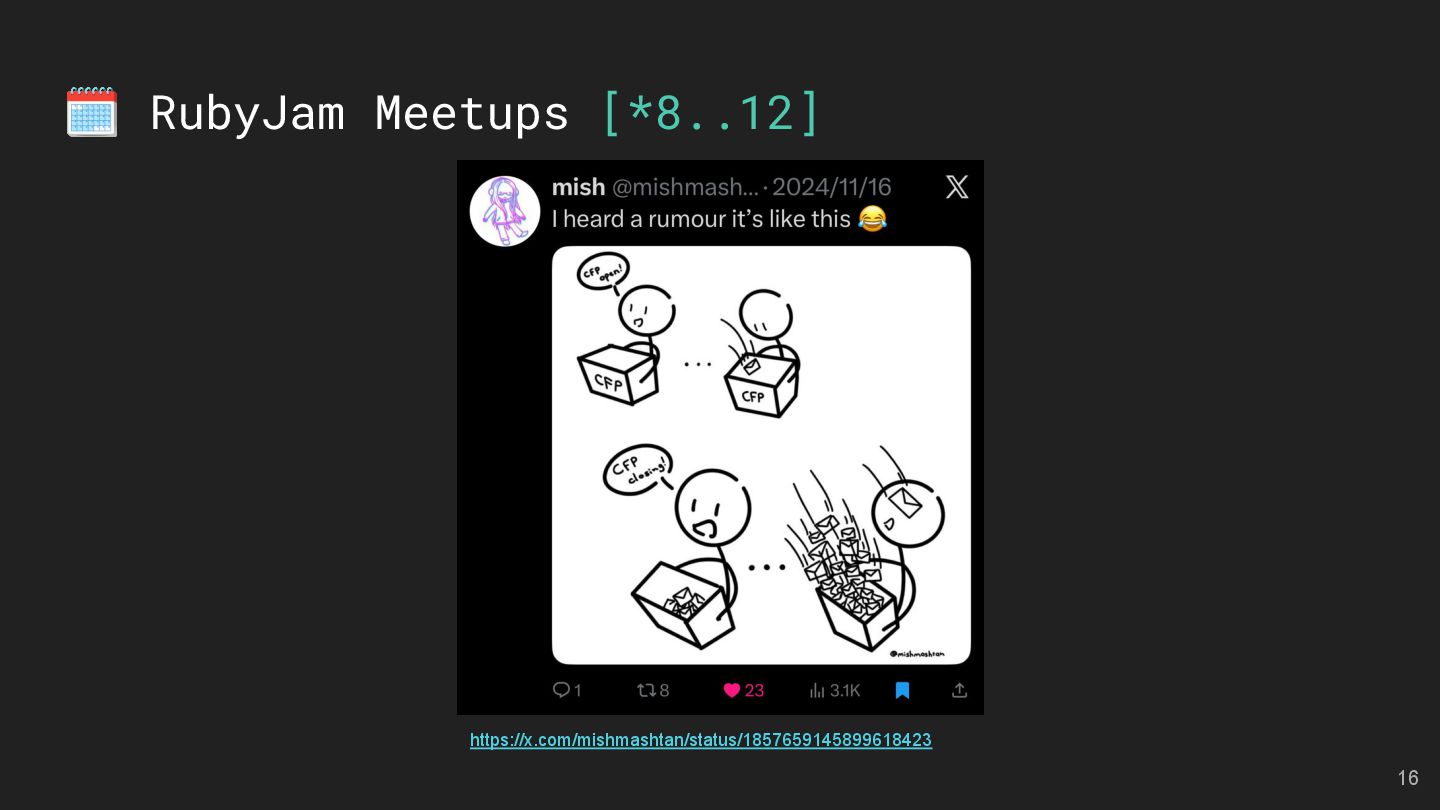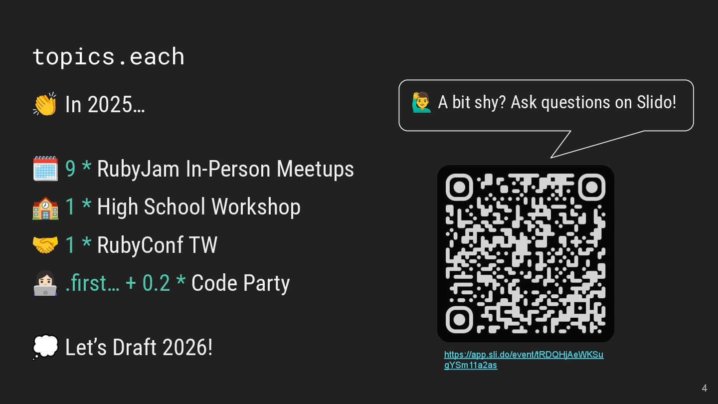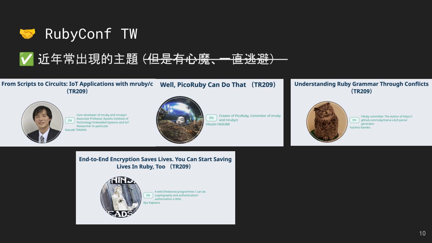 and Future of the Open Social Web Speaker: Andy Piper RubyKaigi 2025 活動見聞 Speakers: 慕凡 & Kasa & Aleks 用 Ruby 做一個 MCP Server Speaker: 卡米哥 cover_rage: The coverage tool simpler than simplecov Speaker: 大兜 Ruby Info Bot 簡介與貢獻方式 Speaker: 蒼時弦也 5