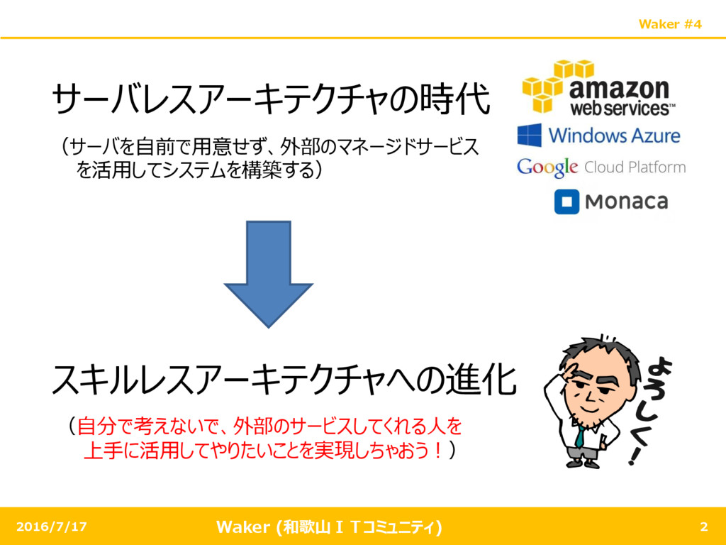 Waker (和歌山ITコミュニティ) Waker #4 2 2016/7/17 サーバレスアーキテクチャの時代 (サーバを自前で用意せず、外部のマネージドサービス を活用してシステムを構築する) (自分で考えないで、外部のサービスしてくれる人を