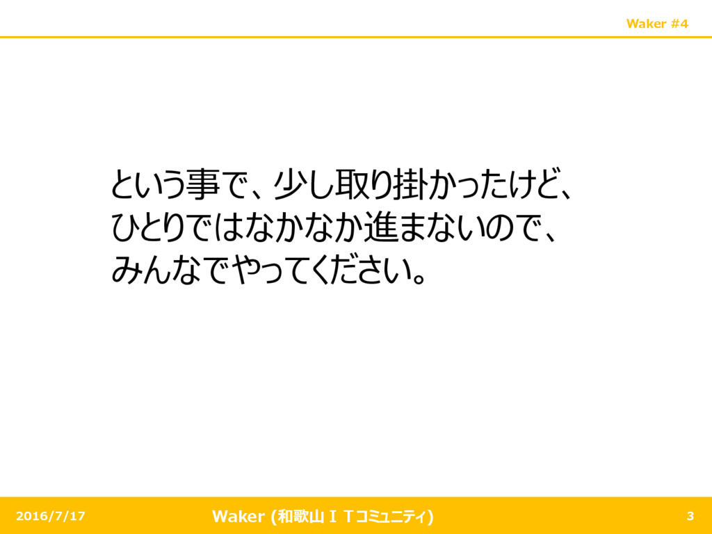 Waker (和歌山ITコミュニティ) Waker #4 2016/7/17 3 という事で、少し取り掛かったけど、 ひとりではなかなか進まないので、 みんなでやってください。