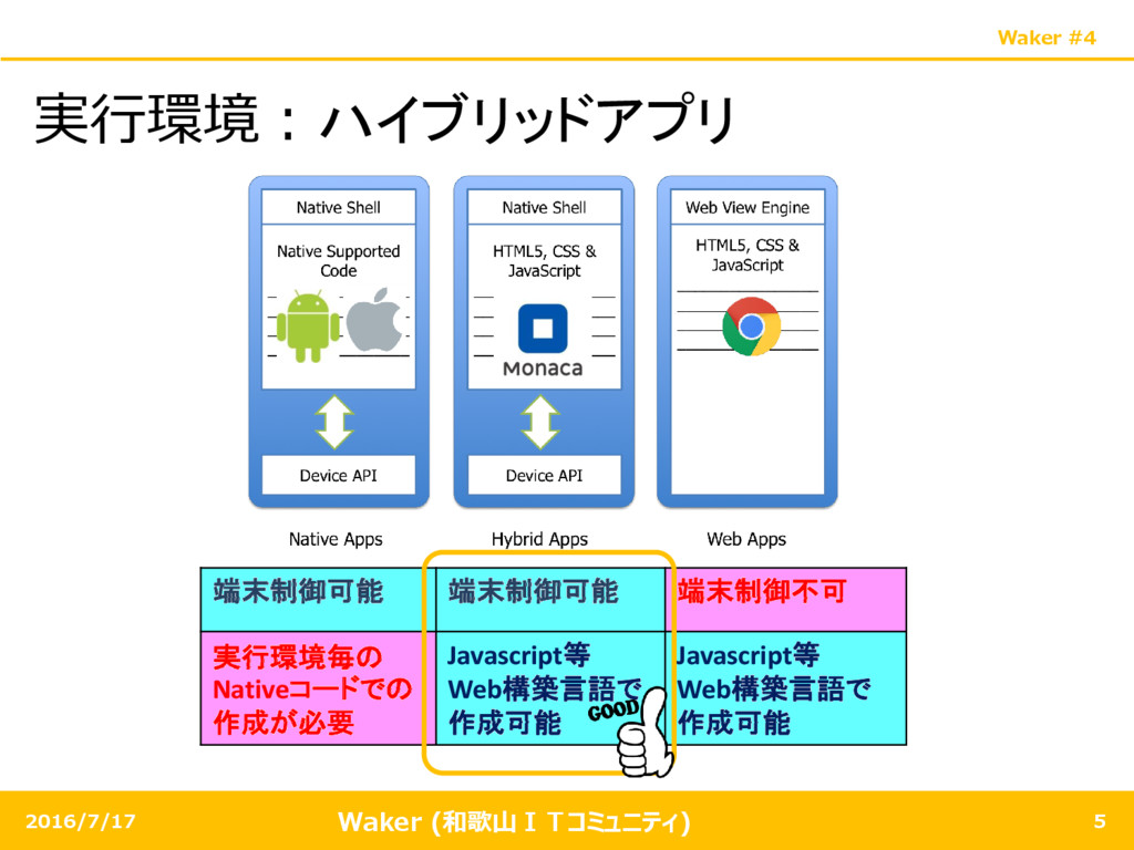 Waker (和歌山ITコミュニティ) Waker #4 2016/7/17 5 実行環境:ハイブリッドアプリ 端末制御可能 端末制御可能 端末制御不可