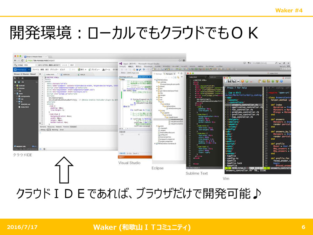 Waker (和歌山ITコミュニティ) Waker #4 2016/7/17 6 開発環境:ローカルでもクラウドでもOK クラウドIDEであれば、ブラウザだけで開発可能♪