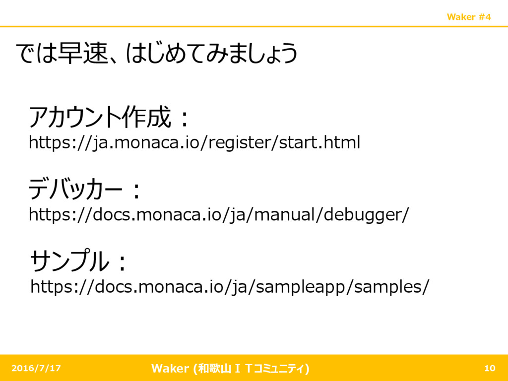 Waker (和歌山ITコミュニティ) Waker #4 2016/7/17 10 では早速、はじめてみましょう アカウント作成: https://ja.monaca.io/register/start.html デバッカー: