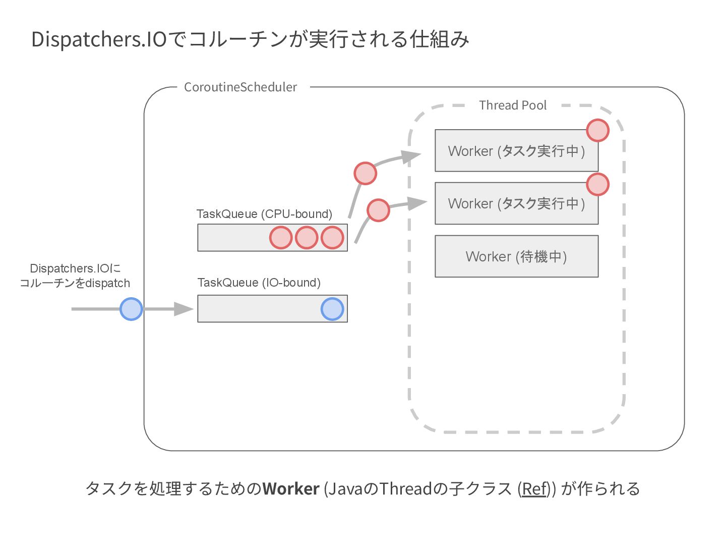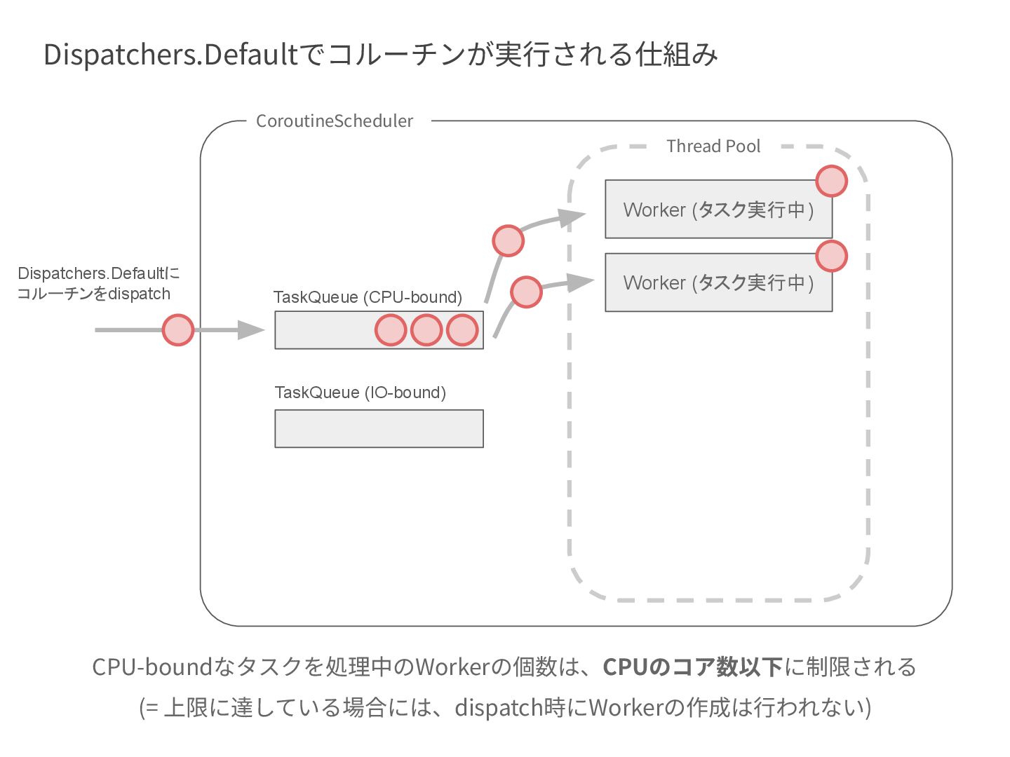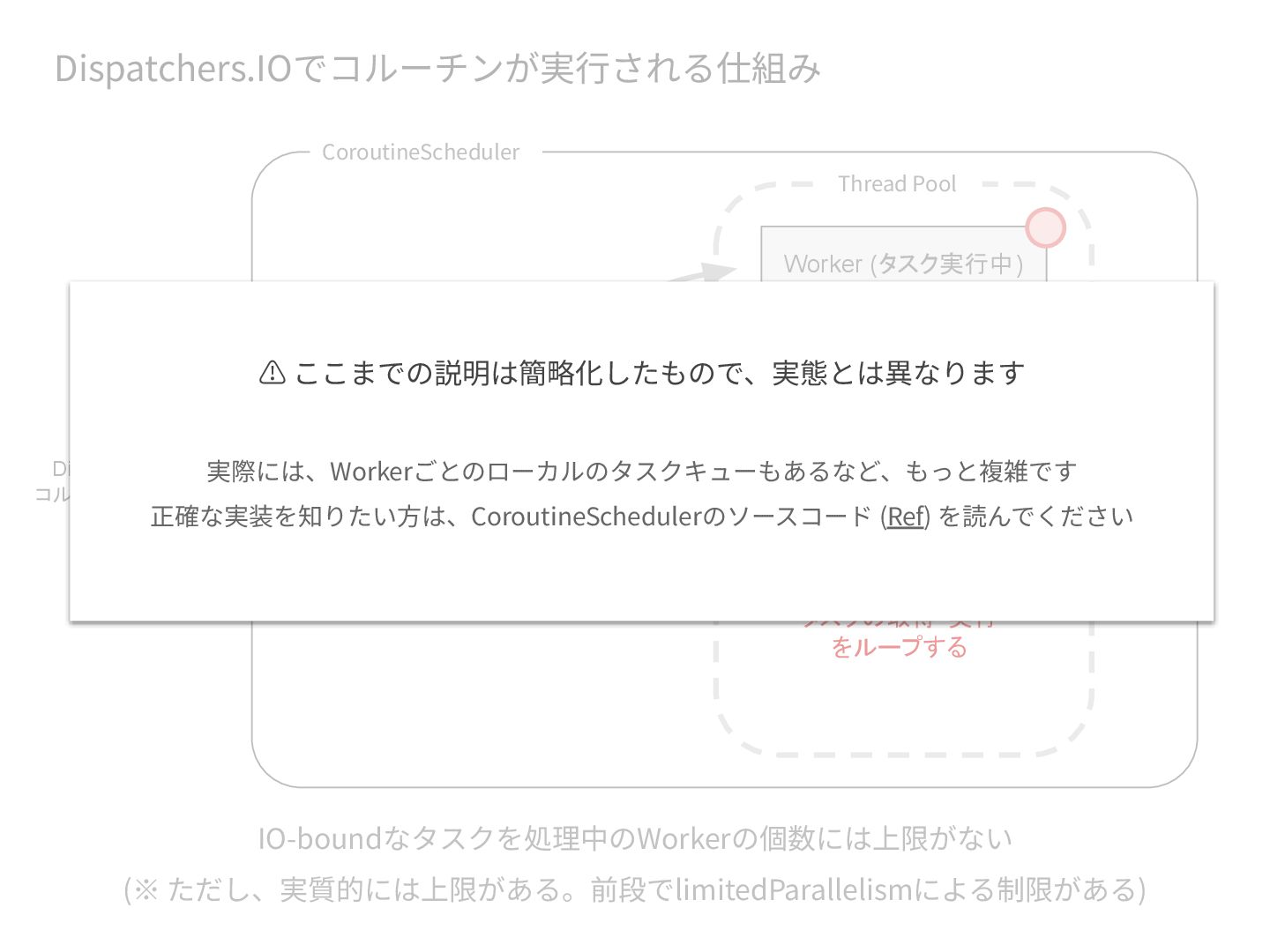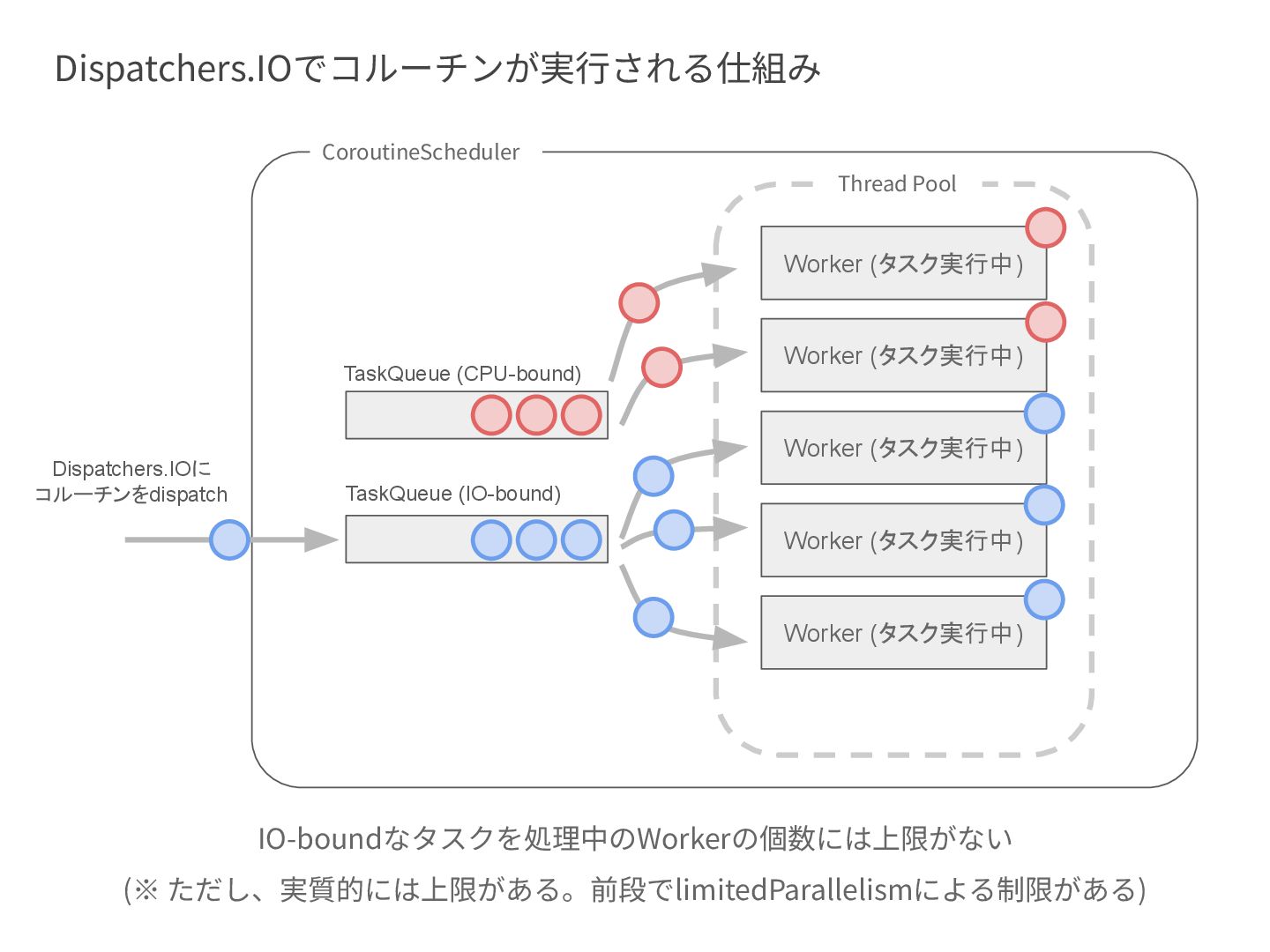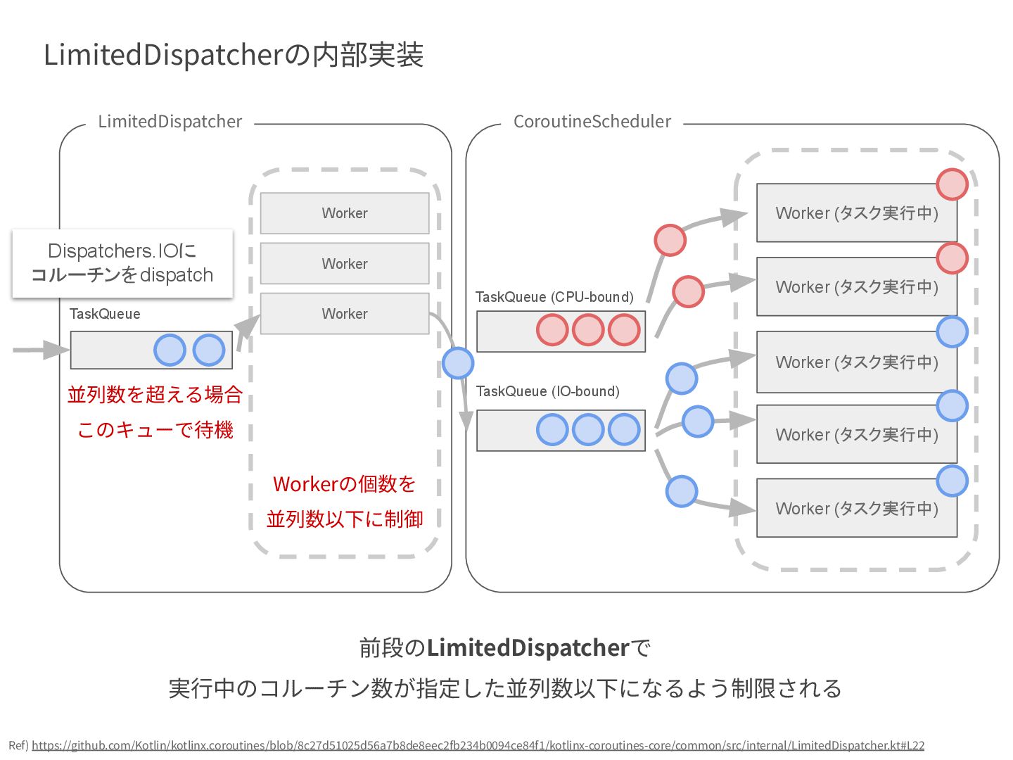 Worker (タスク実行中) Worker (タスク実行中) Worker (タスク実行中) TaskQueue LimitedDispatcher Worker Worker Worker Dispatchers.IOに コルーチンをdispatch 前段のLimitedDispatcherで 実⾏中のコルーチン数が指定した並列数以下になるよう制限される 並列数を超える場合 このキューで待機 Workerの個数を 並列数以下に制御 Ref) https://github.com/Kotlin/kotlinx.coroutines/blob/8c27d51025d56a7b8de8eec2fb234b0094ce84f1/kotlinx-coroutines-core/common/src/internal/LimitedDispatcher.kt#L22