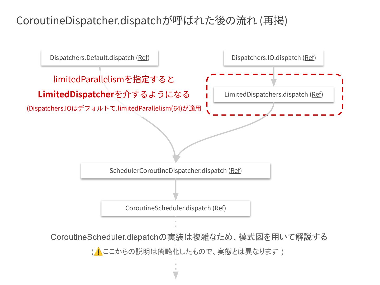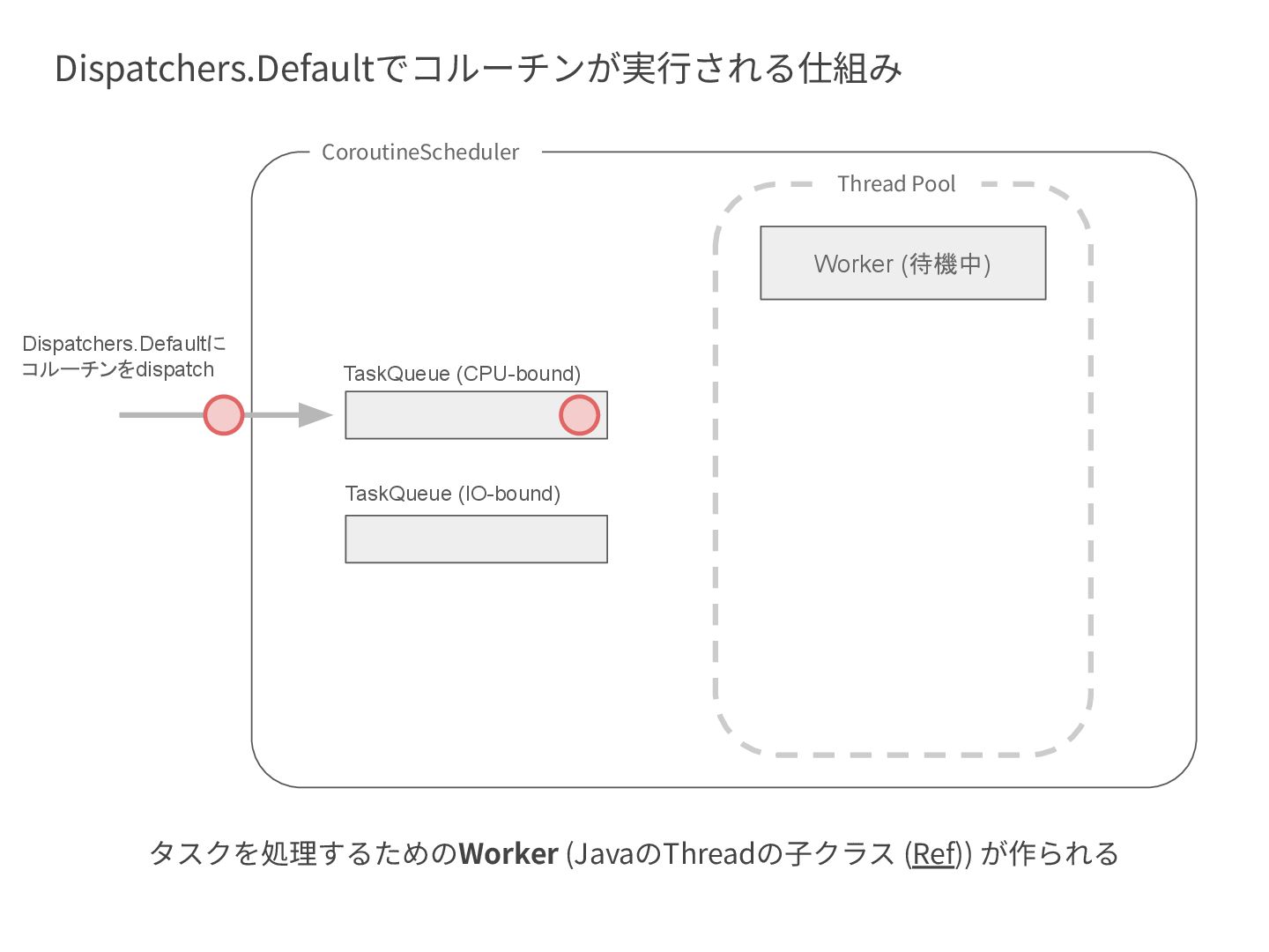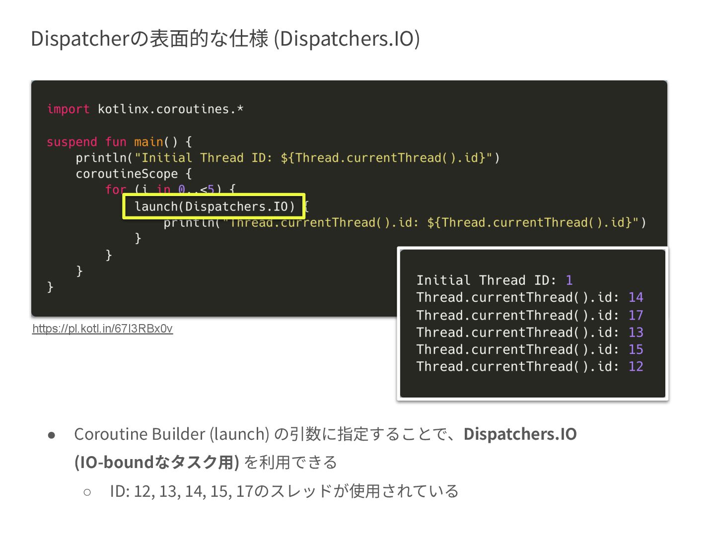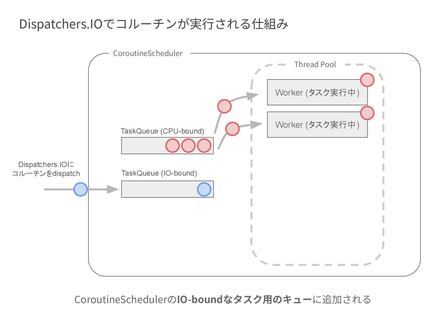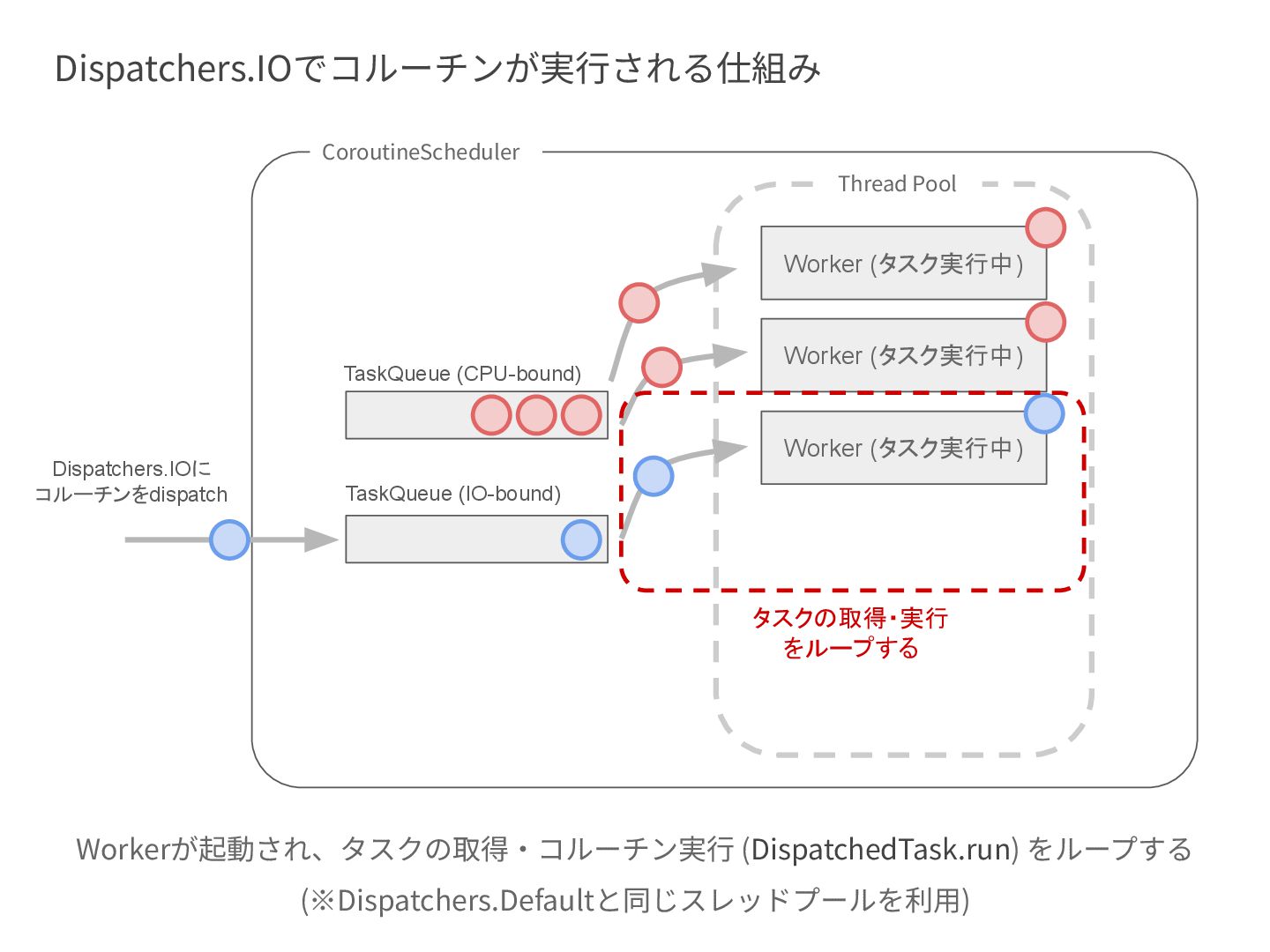 Worker (タスク実行中) Worker (タスク実行中) Worker (タスク実行中) TaskQueue LimitedDispatcher Worker Worker Worker Dispatchers.IOに コルーチンをdispatch 前段のLimitedDispatcherで 実⾏中のコルーチン数が指定した並列数以下になるよう制限される 並列数を超える場合 このキューで待機 Workerの個数を 並列数以下に制御 Ref) https://github.com/Kotlin/kotlinx.coroutines/blob/8c27d51025d56a7b8de8eec2fb234b0094ce84f1/kotlinx-coroutines-core/common/src/internal/LimitedDispatcher.kt#L22