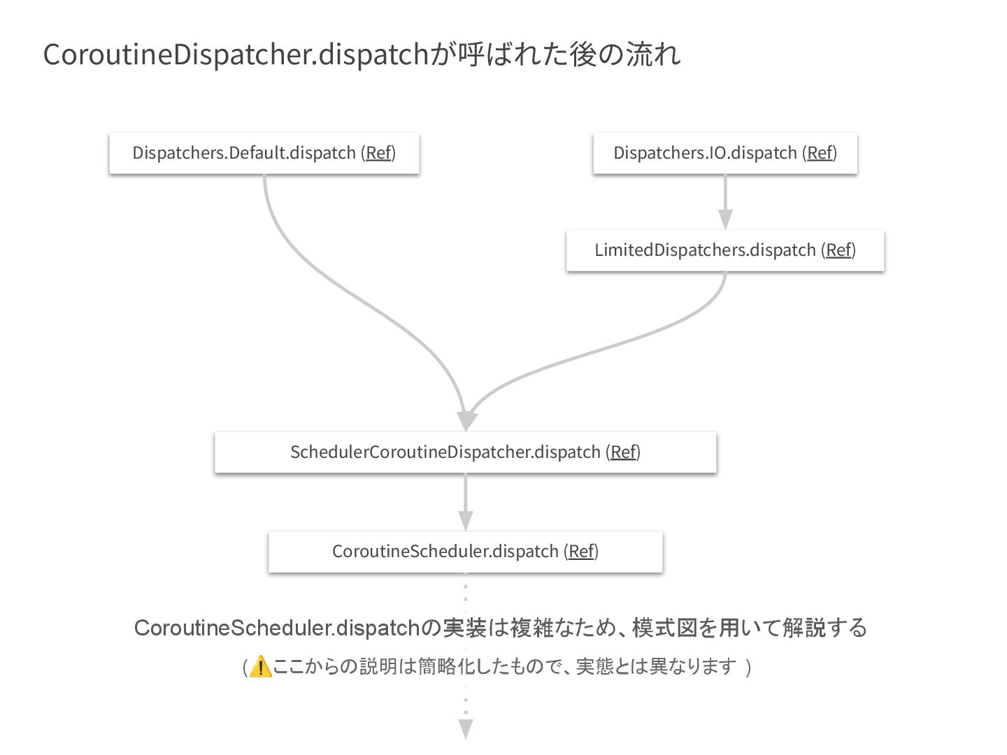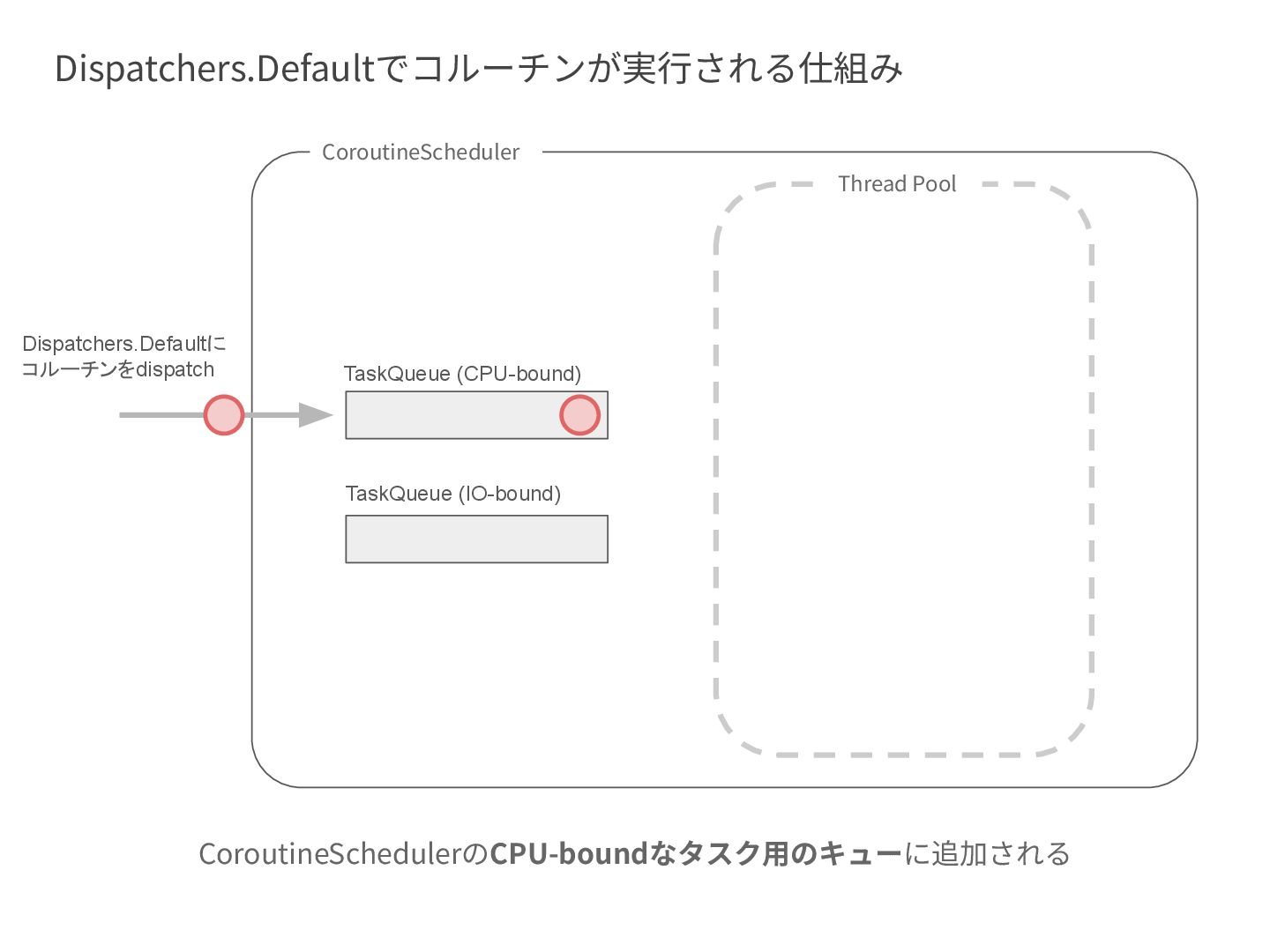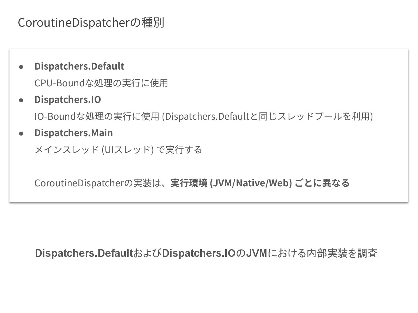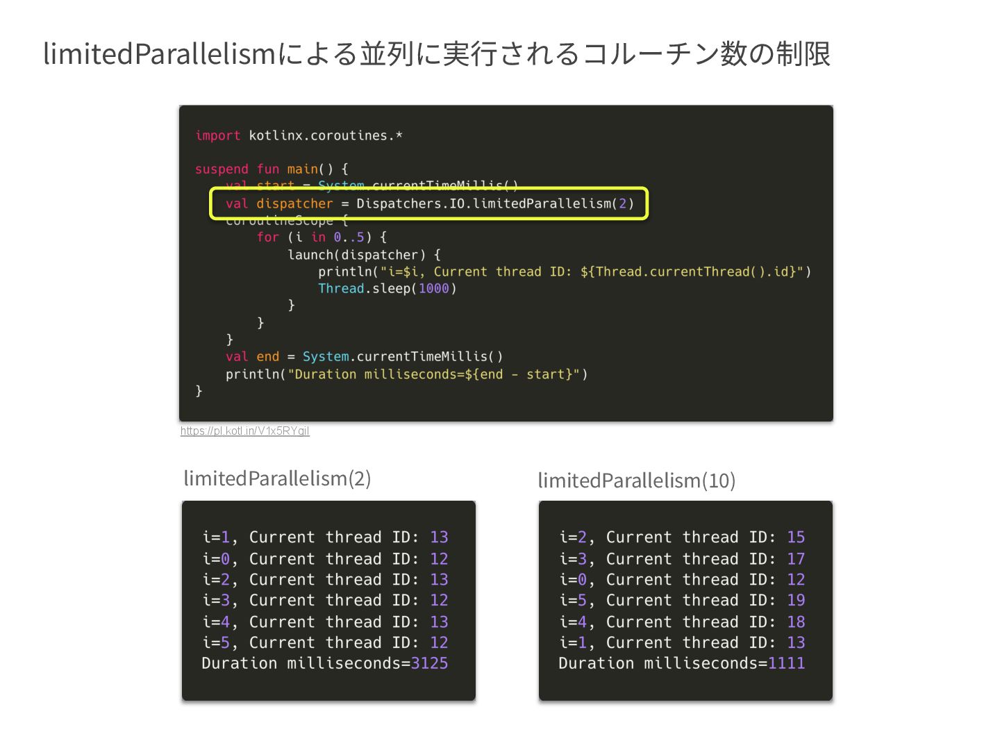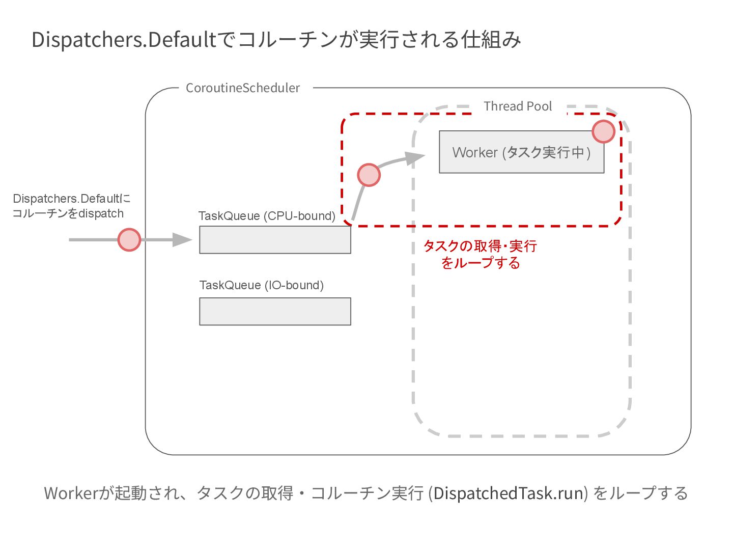 Worker (タスク実行中) Worker (タスク実行中) Worker (タスク実行中) TaskQueue LimitedDispatcher Worker Worker Worker Dispatchers.IOに コルーチンをdispatch 前段のLimitedDispatcherで 実⾏中のコルーチン数が指定した並列数以下になるよう制限される 並列数を超える場合 このキューで待機 Workerの個数を 並列数以下に制御 Ref) https://github.com/Kotlin/kotlinx.coroutines/blob/8c27d51025d56a7b8de8eec2fb234b0094ce84f1/kotlinx-coroutines-core/common/src/internal/LimitedDispatcher.kt#L22