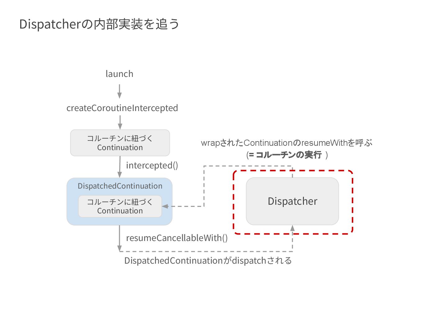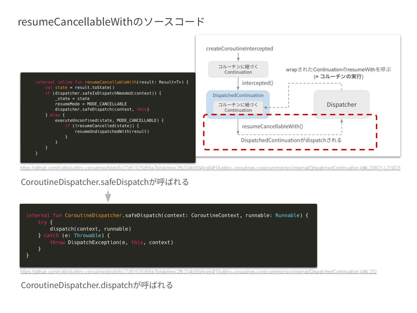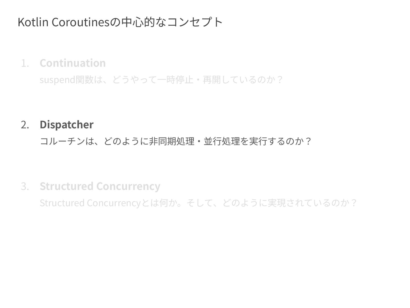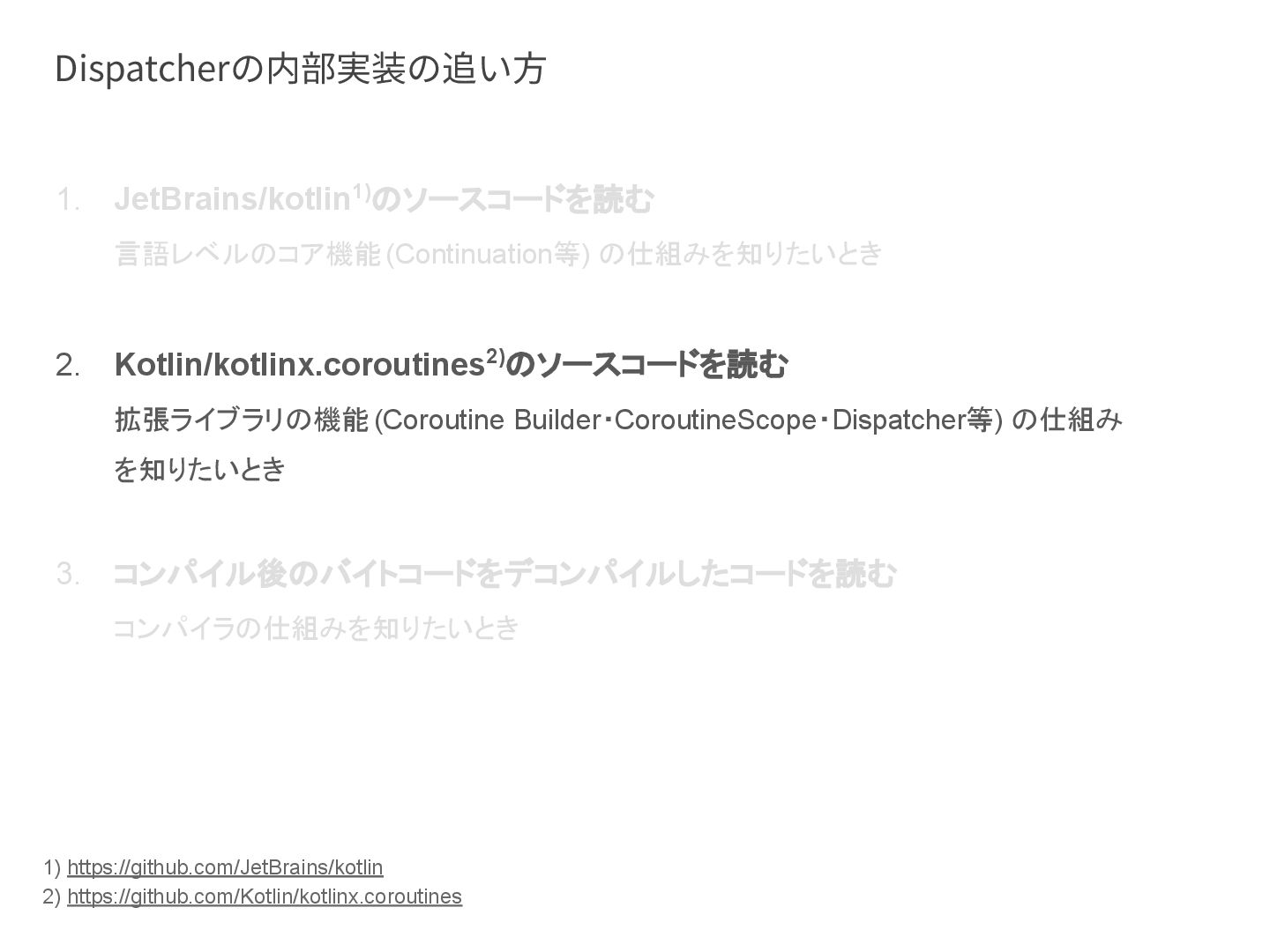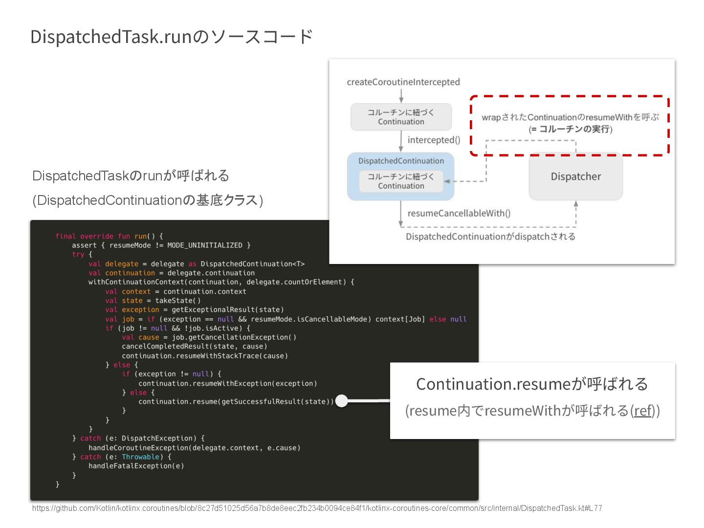 Worker (タスク実行中) Worker (タスク実行中) Worker (タスク実行中) TaskQueue LimitedDispatcher Worker Worker Worker Dispatchers.IOに コルーチンをdispatch 前段のLimitedDispatcherで 実⾏中のコルーチン数が指定した並列数以下になるよう制限される 並列数を超える場合 このキューで待機 Workerの個数を 並列数以下に制御 Ref) https://github.com/Kotlin/kotlinx.coroutines/blob/8c27d51025d56a7b8de8eec2fb234b0094ce84f1/kotlinx-coroutines-core/common/src/internal/LimitedDispatcher.kt#L22