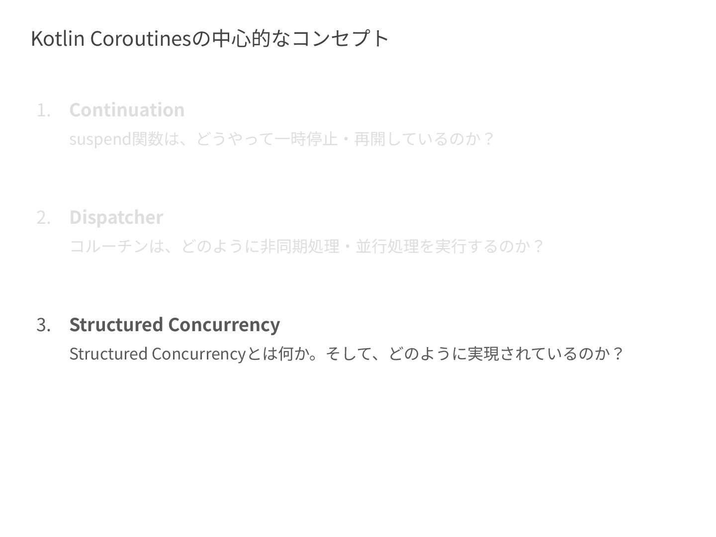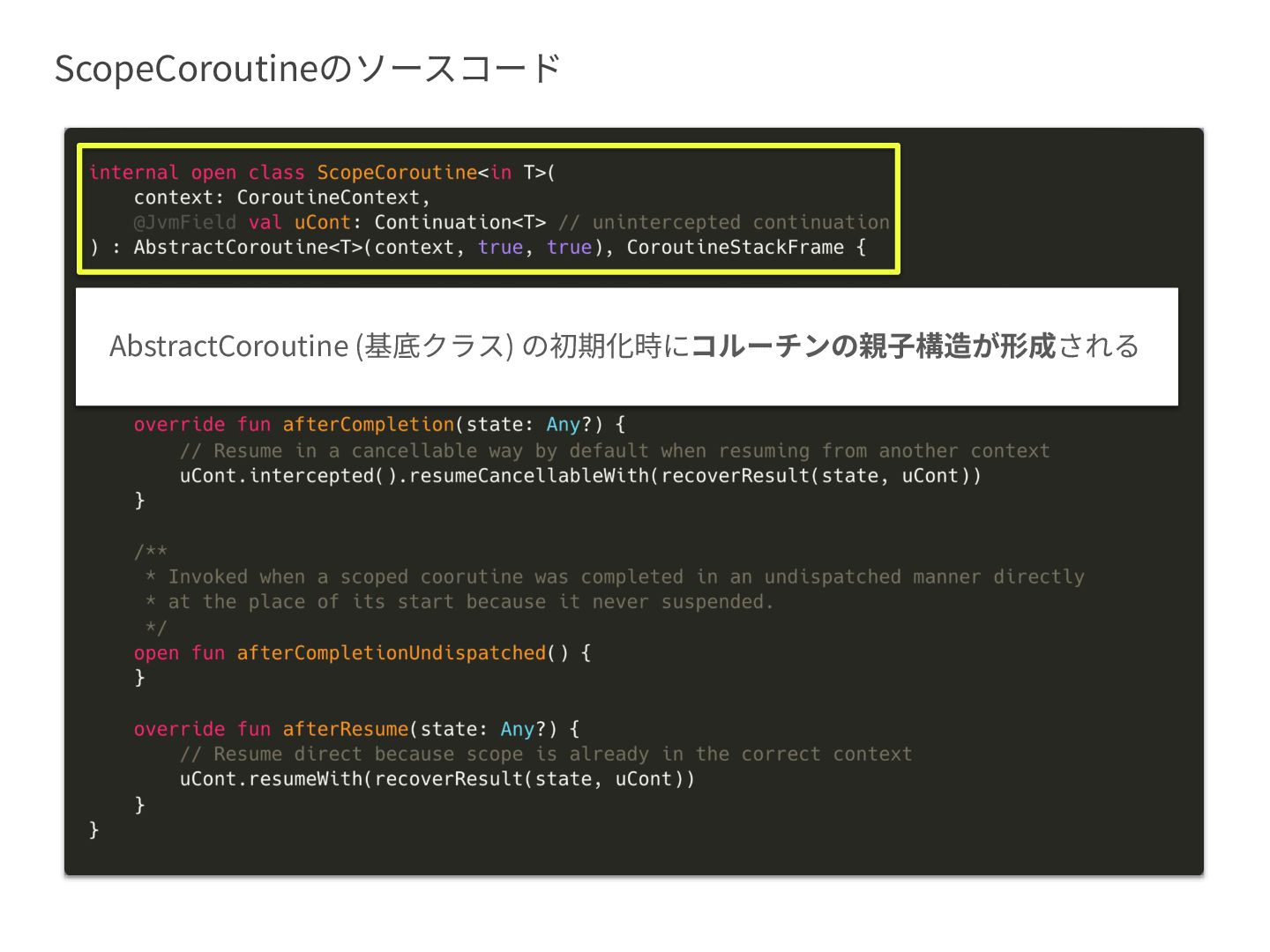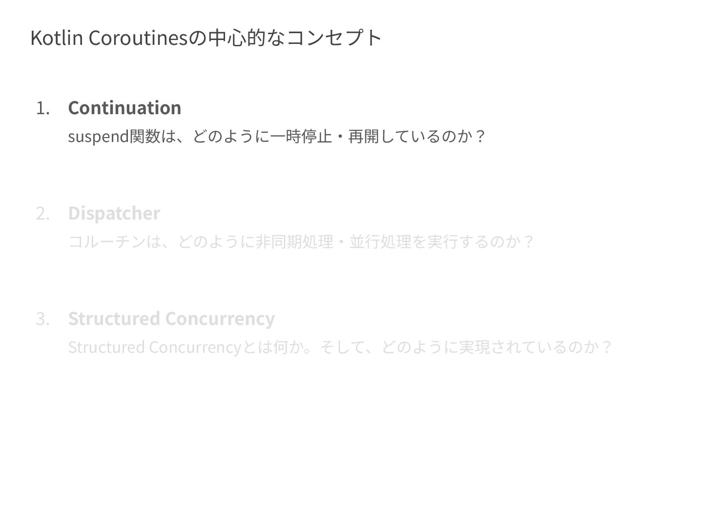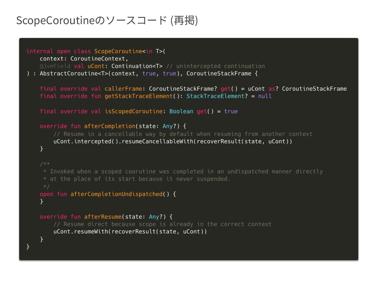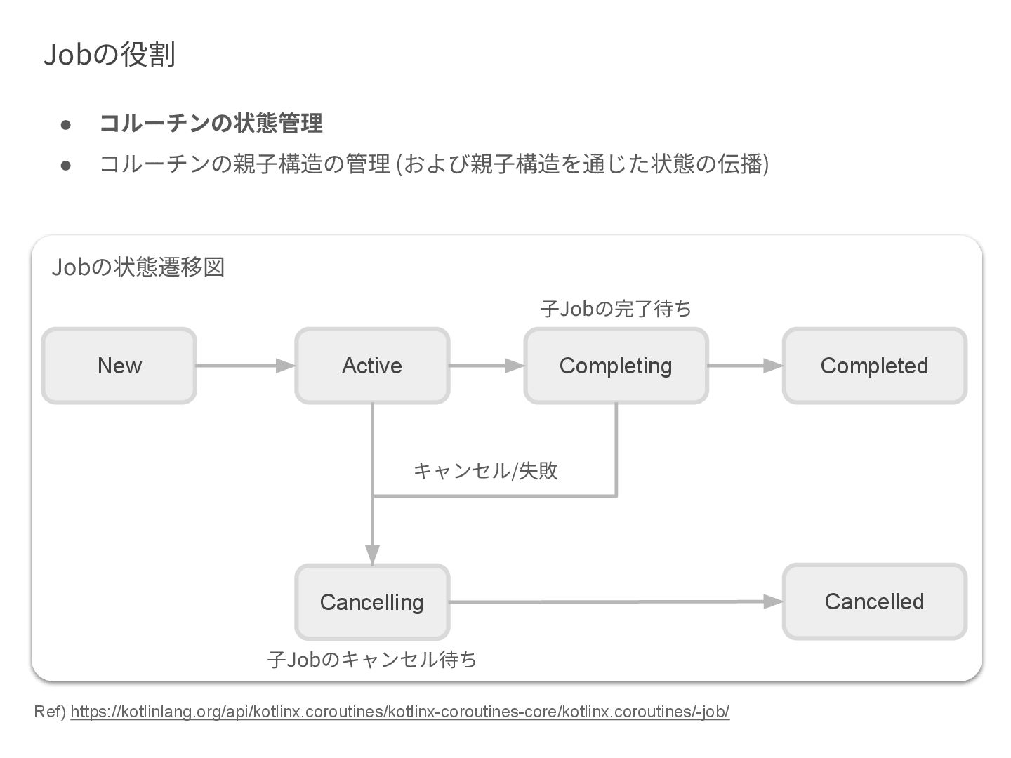 Worker (タスク実行中) Worker (タスク実行中) Worker (タスク実行中) TaskQueue LimitedDispatcher Worker Worker Worker Dispatchers.IOに コルーチンをdispatch 前段のLimitedDispatcherで 実⾏中のコルーチン数が指定した並列数以下になるよう制限される 並列数を超える場合 このキューで待機 Workerの個数を 並列数以下に制御 Ref) https://github.com/Kotlin/kotlinx.coroutines/blob/8c27d51025d56a7b8de8eec2fb234b0094ce84f1/kotlinx-coroutines-core/common/src/internal/LimitedDispatcher.kt#L22