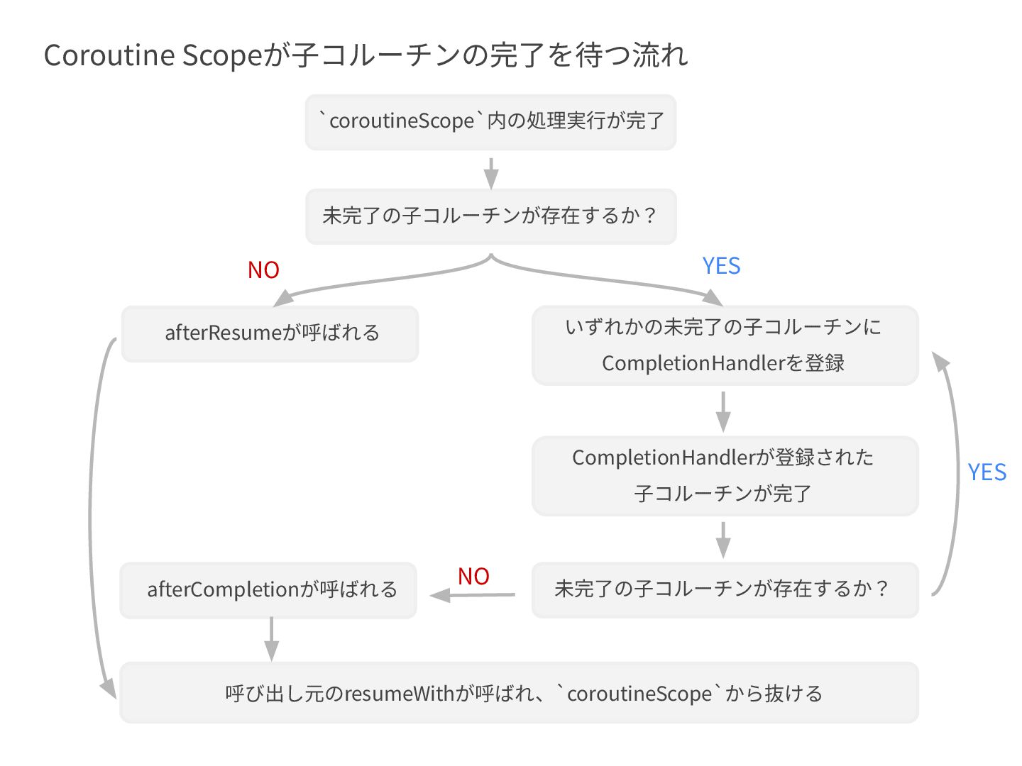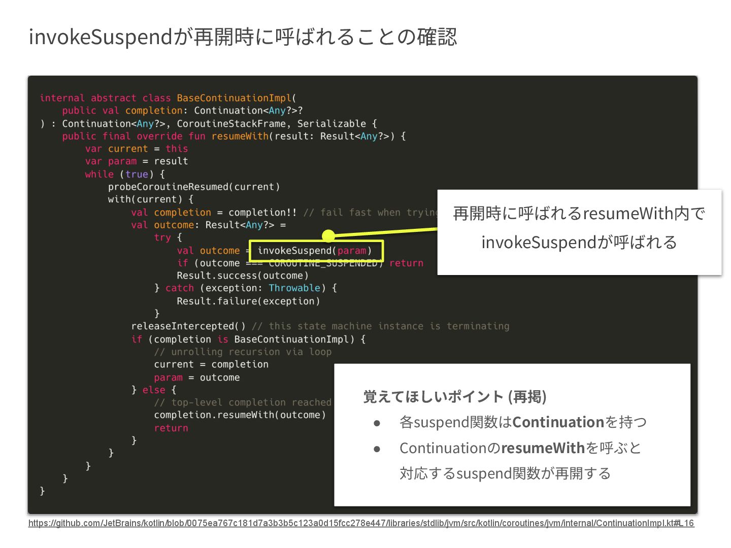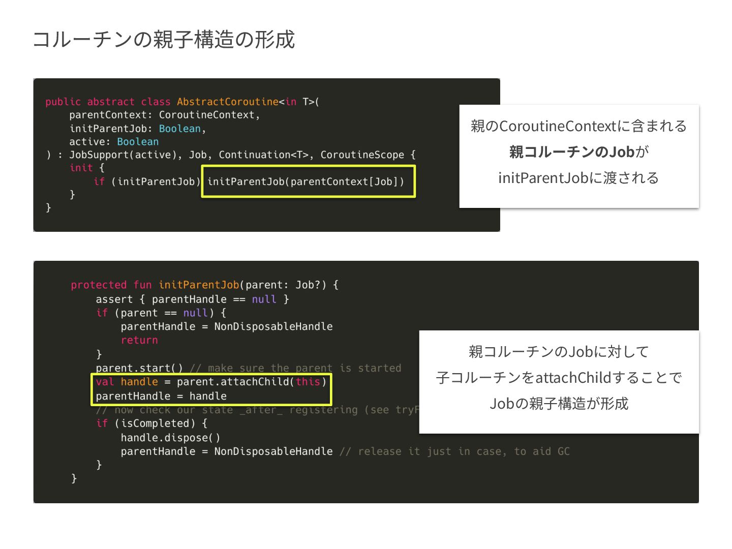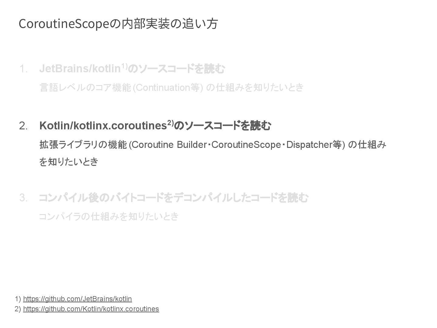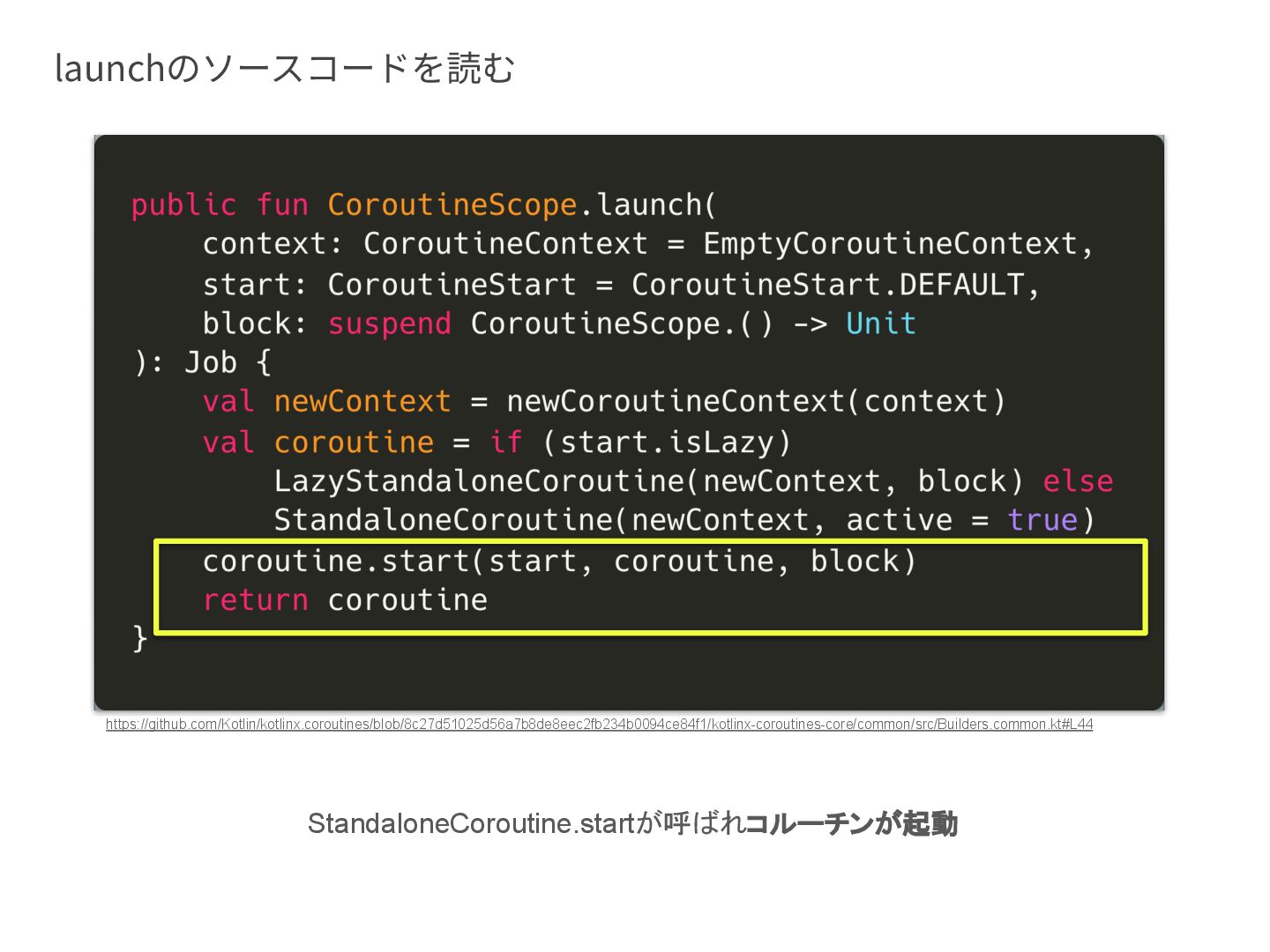 Worker (タスク実行中) Worker (タスク実行中) Worker (タスク実行中) TaskQueue LimitedDispatcher Worker Worker Worker Dispatchers.IOに コルーチンをdispatch 前段のLimitedDispatcherで 実⾏中のコルーチン数が指定した並列数以下になるよう制限される 並列数を超える場合 このキューで待機 Workerの個数を 並列数以下に制御 Ref) https://github.com/Kotlin/kotlinx.coroutines/blob/8c27d51025d56a7b8de8eec2fb234b0094ce84f1/kotlinx-coroutines-core/common/src/internal/LimitedDispatcher.kt#L22