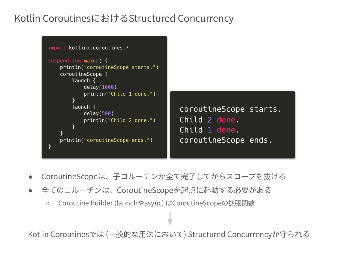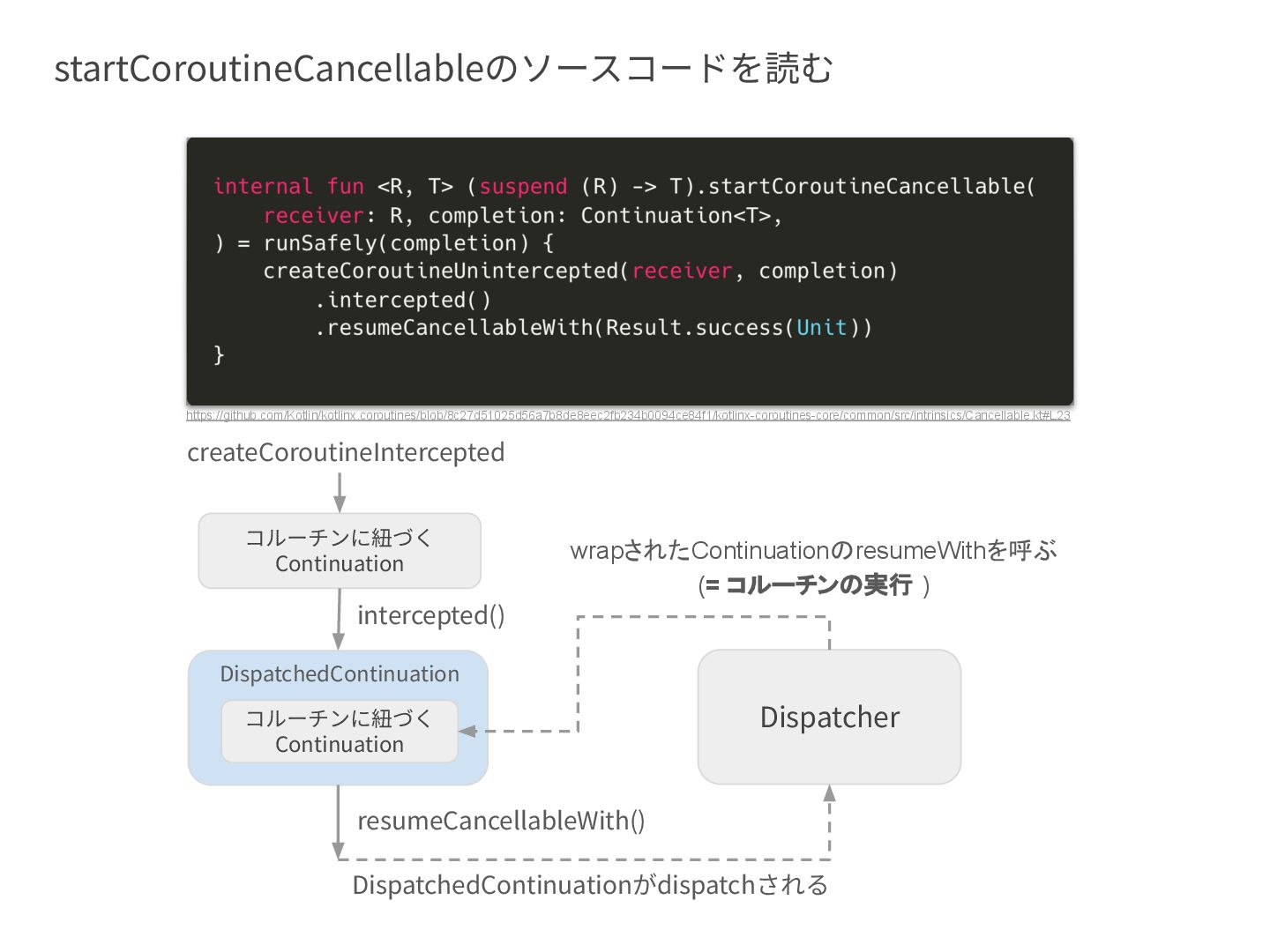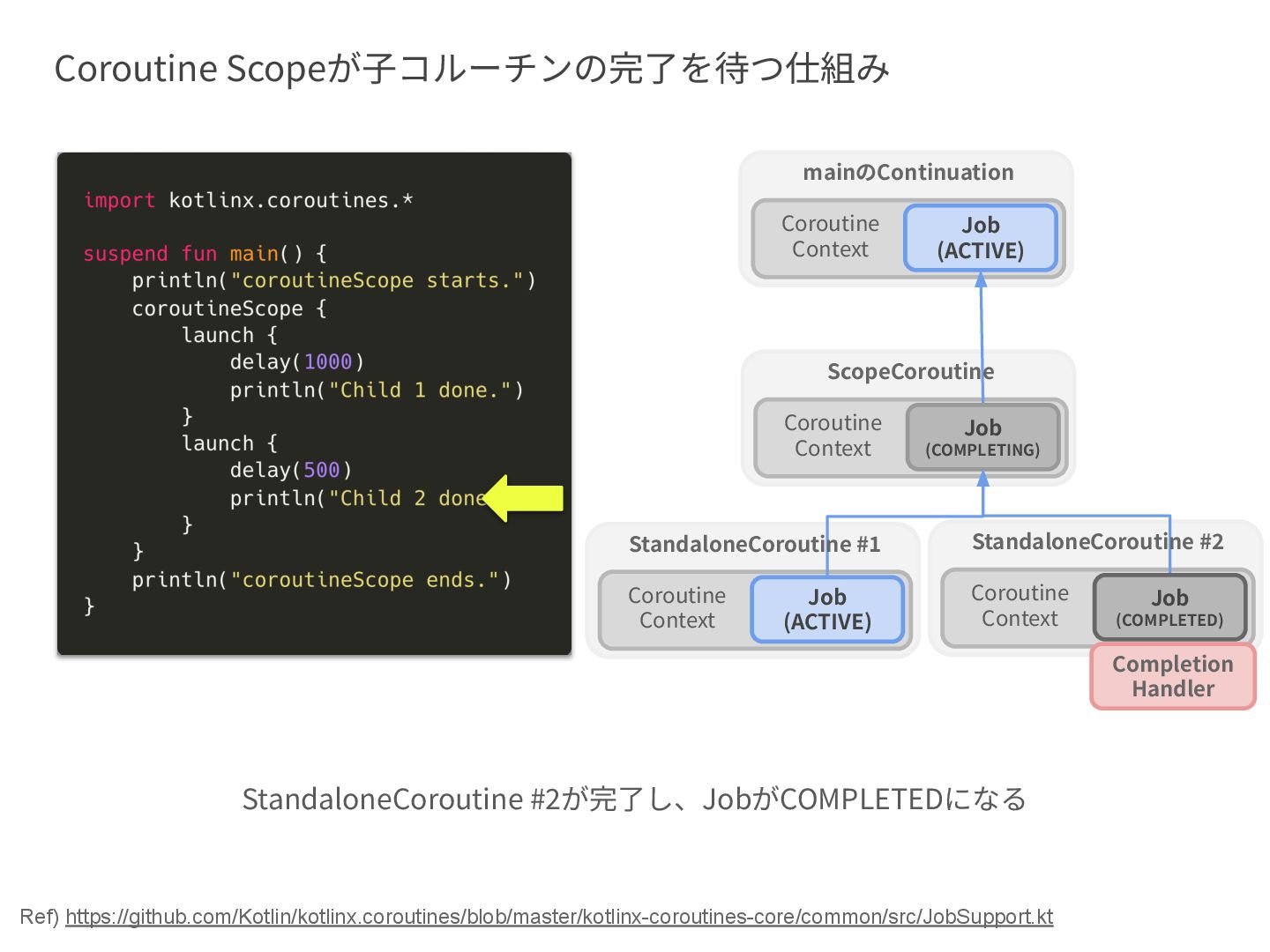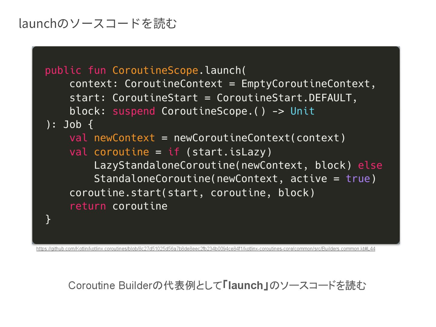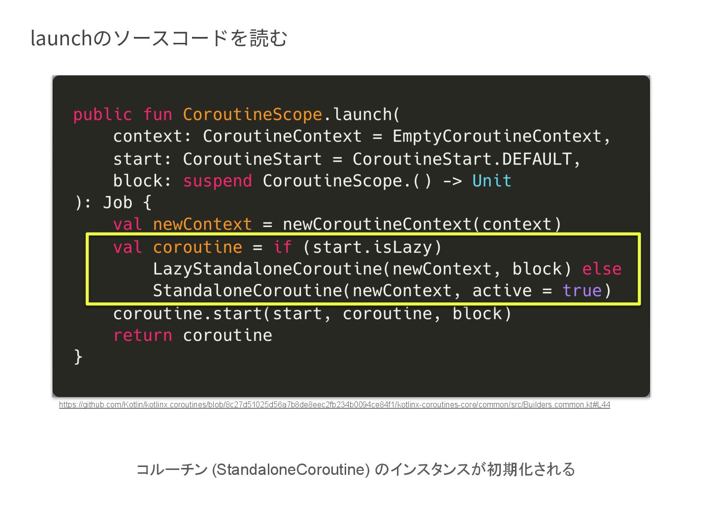 Worker (タスク実行中) Worker (タスク実行中) Worker (タスク実行中) TaskQueue LimitedDispatcher Worker Worker Worker Dispatchers.IOに コルーチンをdispatch 前段のLimitedDispatcherで 実⾏中のコルーチン数が指定した並列数以下になるよう制限される 並列数を超える場合 このキューで待機 Workerの個数を 並列数以下に制御 Ref) https://github.com/Kotlin/kotlinx.coroutines/blob/8c27d51025d56a7b8de8eec2fb234b0094ce84f1/kotlinx-coroutines-core/common/src/internal/LimitedDispatcher.kt#L22