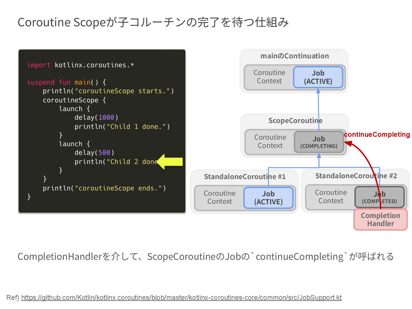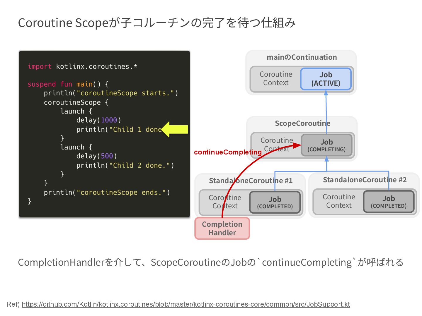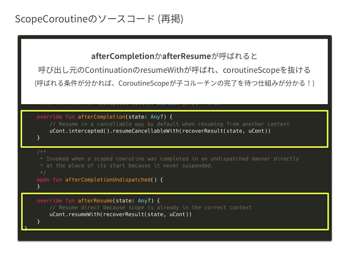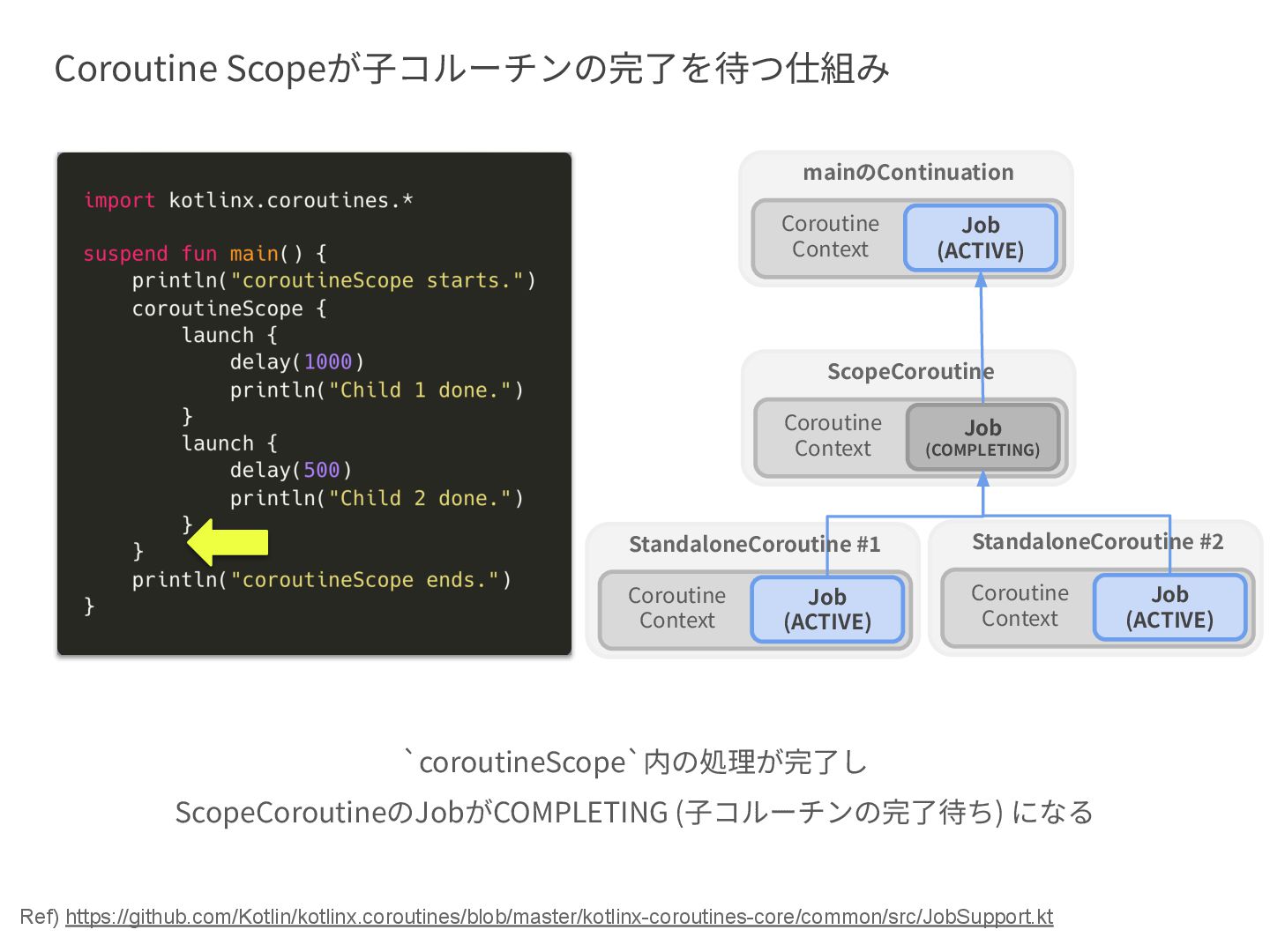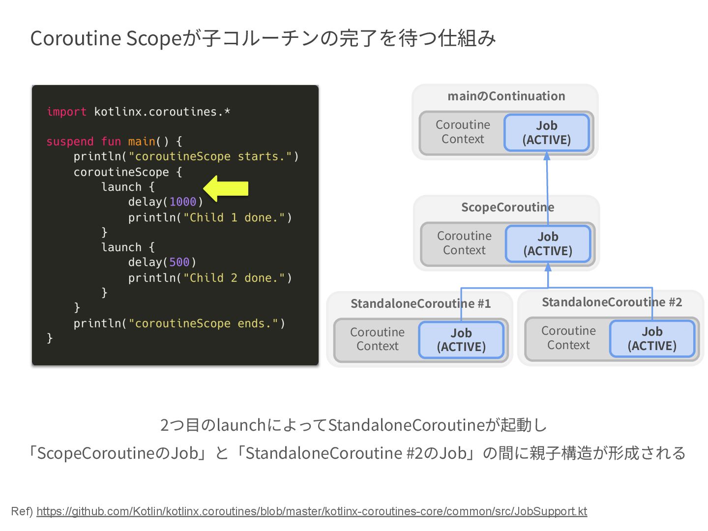 Worker (タスク実行中) Worker (タスク実行中) Worker (タスク実行中) TaskQueue LimitedDispatcher Worker Worker Worker Dispatchers.IOに コルーチンをdispatch 前段のLimitedDispatcherで 実⾏中のコルーチン数が指定した並列数以下になるよう制限される 並列数を超える場合 このキューで待機 Workerの個数を 並列数以下に制御 Ref) https://github.com/Kotlin/kotlinx.coroutines/blob/8c27d51025d56a7b8de8eec2fb234b0094ce84f1/kotlinx-coroutines-core/common/src/internal/LimitedDispatcher.kt#L22