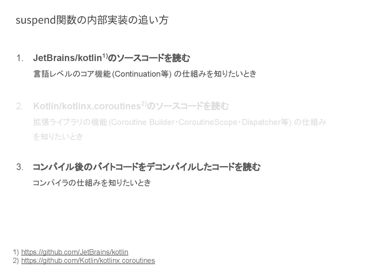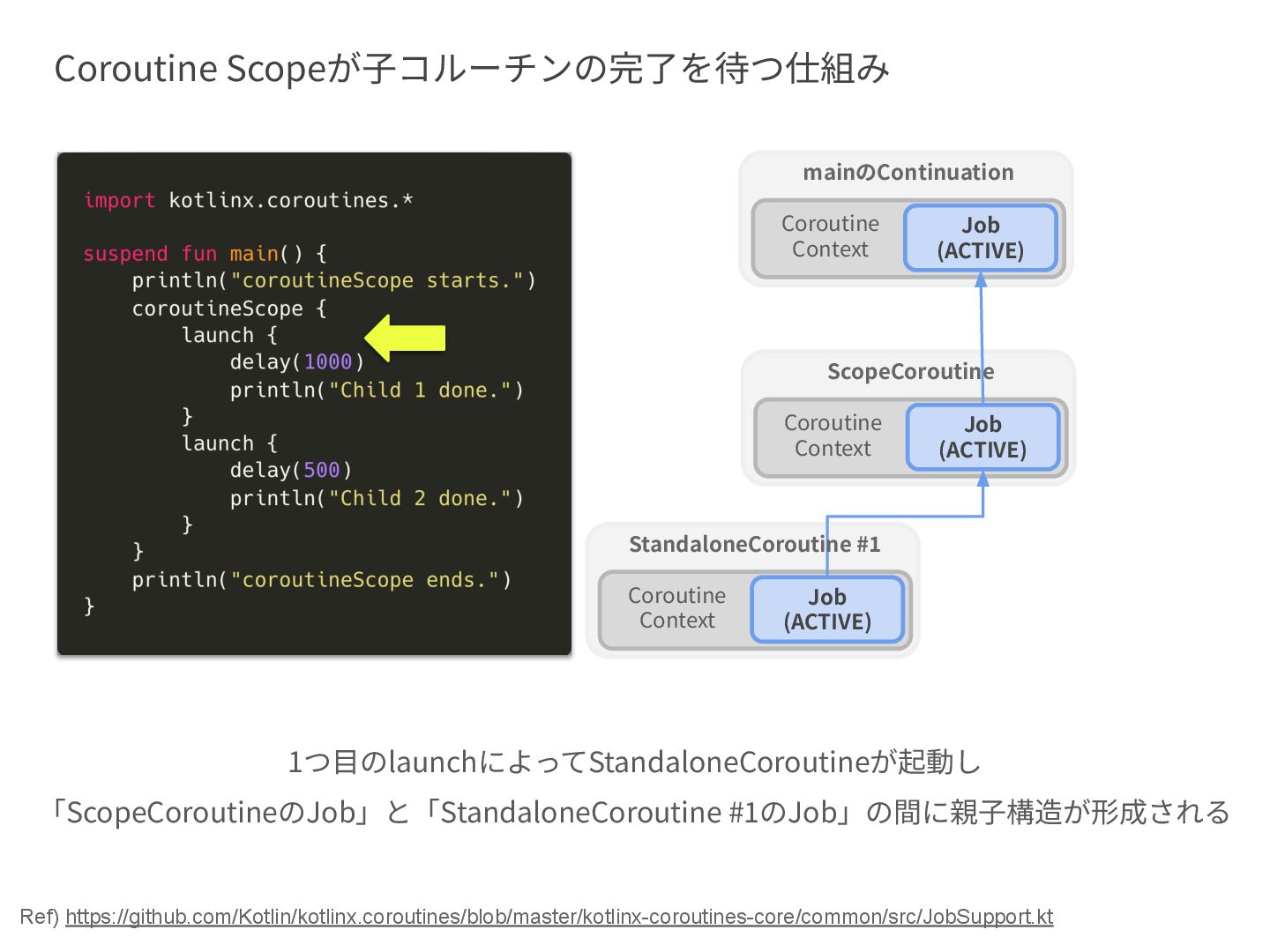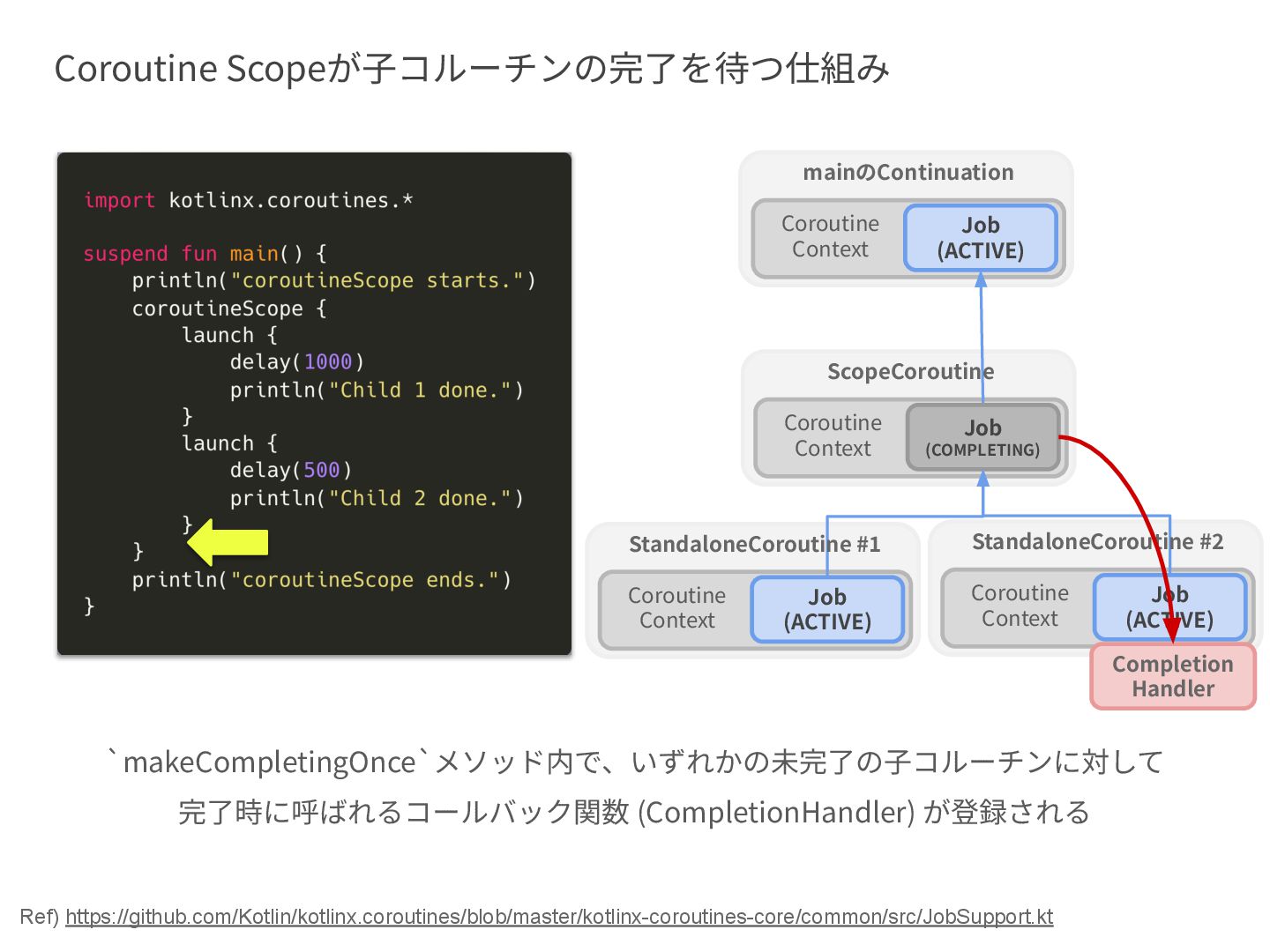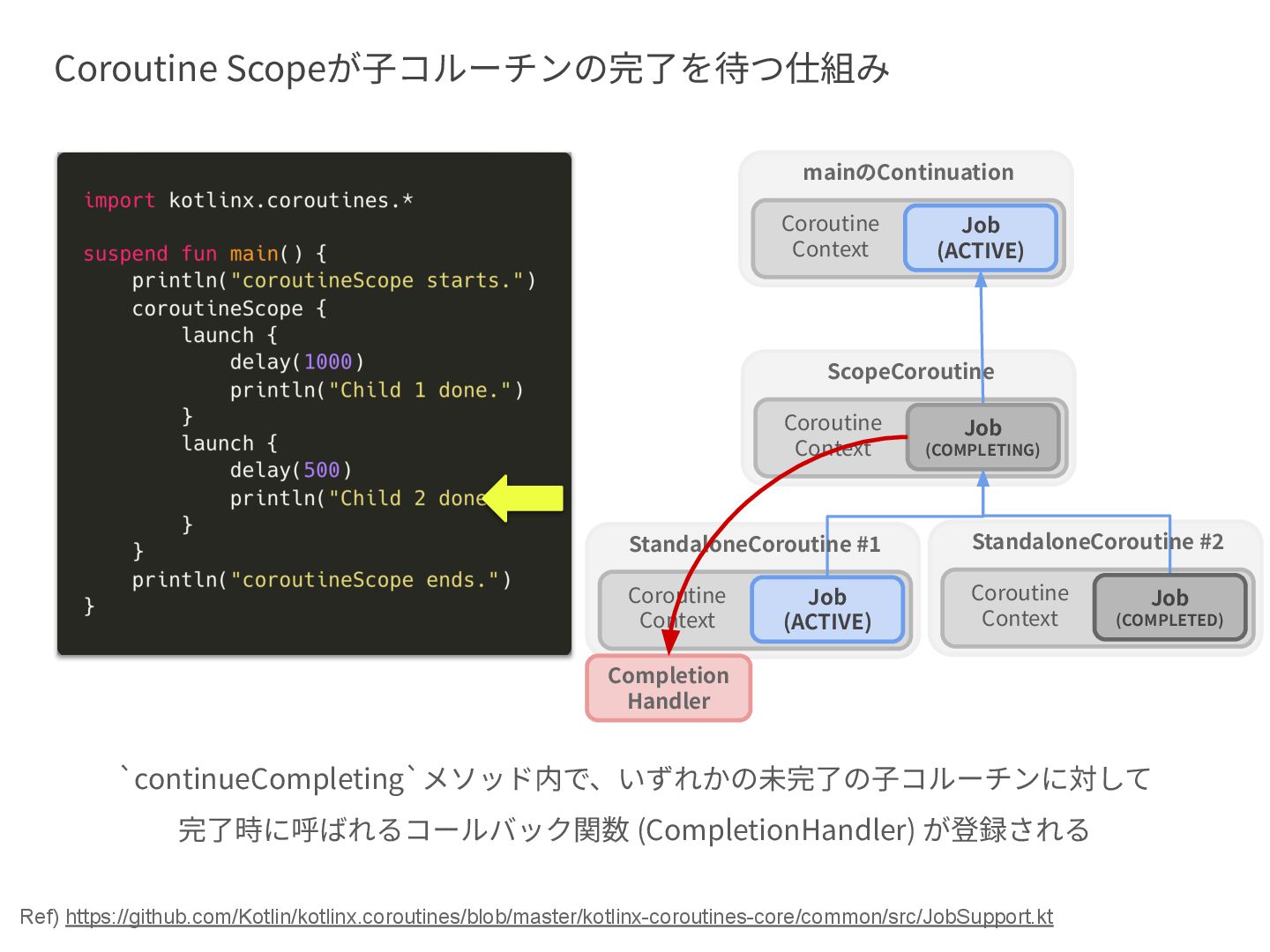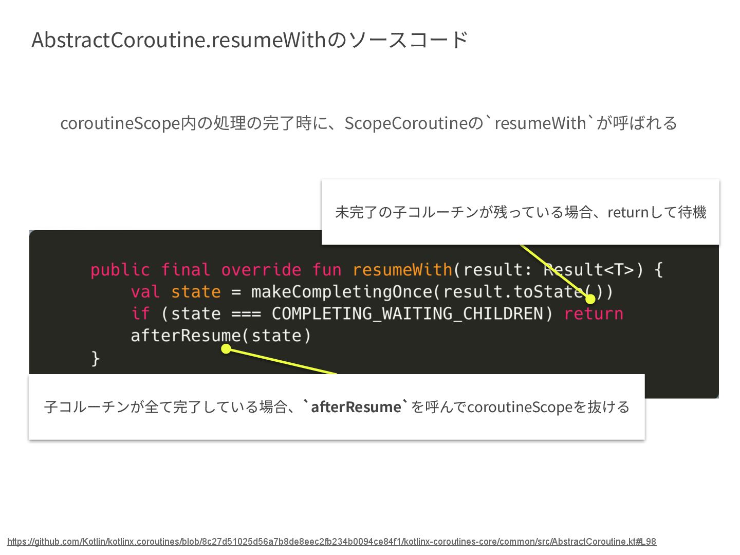 Worker (タスク実行中) Worker (タスク実行中) Worker (タスク実行中) TaskQueue LimitedDispatcher Worker Worker Worker Dispatchers.IOに コルーチンをdispatch 前段のLimitedDispatcherで 実⾏中のコルーチン数が指定した並列数以下になるよう制限される 並列数を超える場合 このキューで待機 Workerの個数を 並列数以下に制御 Ref) https://github.com/Kotlin/kotlinx.coroutines/blob/8c27d51025d56a7b8de8eec2fb234b0094ce84f1/kotlinx-coroutines-core/common/src/internal/LimitedDispatcher.kt#L22