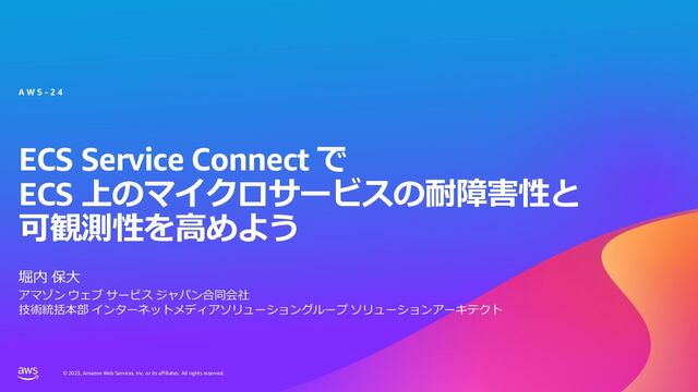 rights reserved. © 2023, Amazon Web Services, Inc. or its affiliates. All rights reserved. ECS Service Connect で ECS 上のマイクロサービスの耐障害性と 可観測性を高めよう 堀内 保大 A W S - 2 4 アマゾン ウェブ サービス ジャパン合同会社 技術統括本部 インターネットメディアソリューショングループ ソリューションアーキテクト