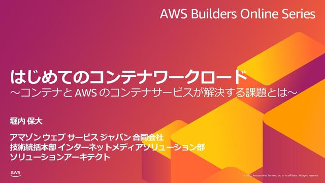 rights reserved. #AWSBuilders リソースが隔離されたOS上のプロセス (仮想マシンと同様に「起動・停止・削除」などのライフサイクルを持つ) コンテナ 仮想マシン Bins/Libs App2 Process Infrastructure Guest OS Docker Infrastructure Hypervisor Guest OS Bins/Libs App2 Guest OS Bins/Libs App1 VM VM App1 Bins/Libs Process 仮想マシンとコンテナの違いって? Hypervisor