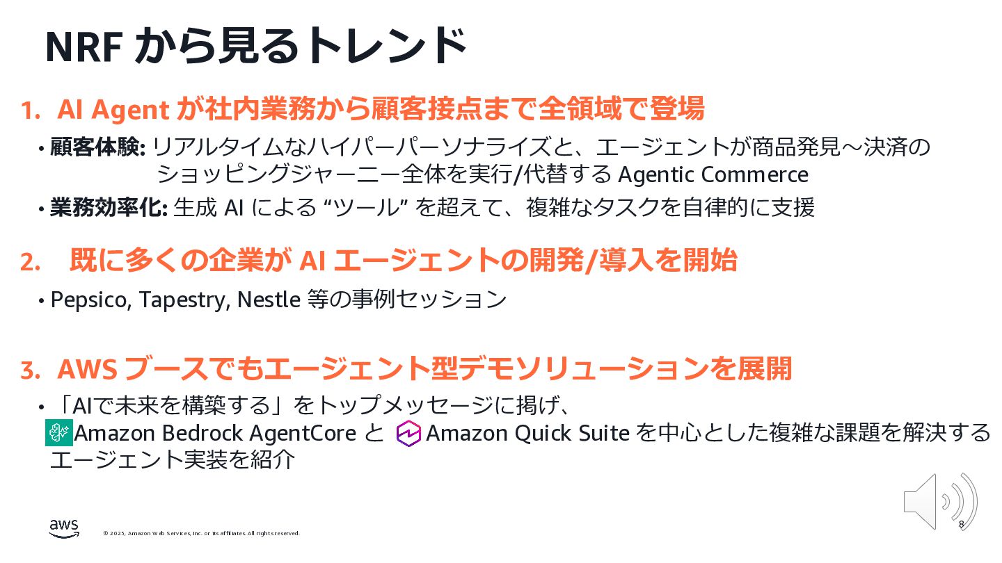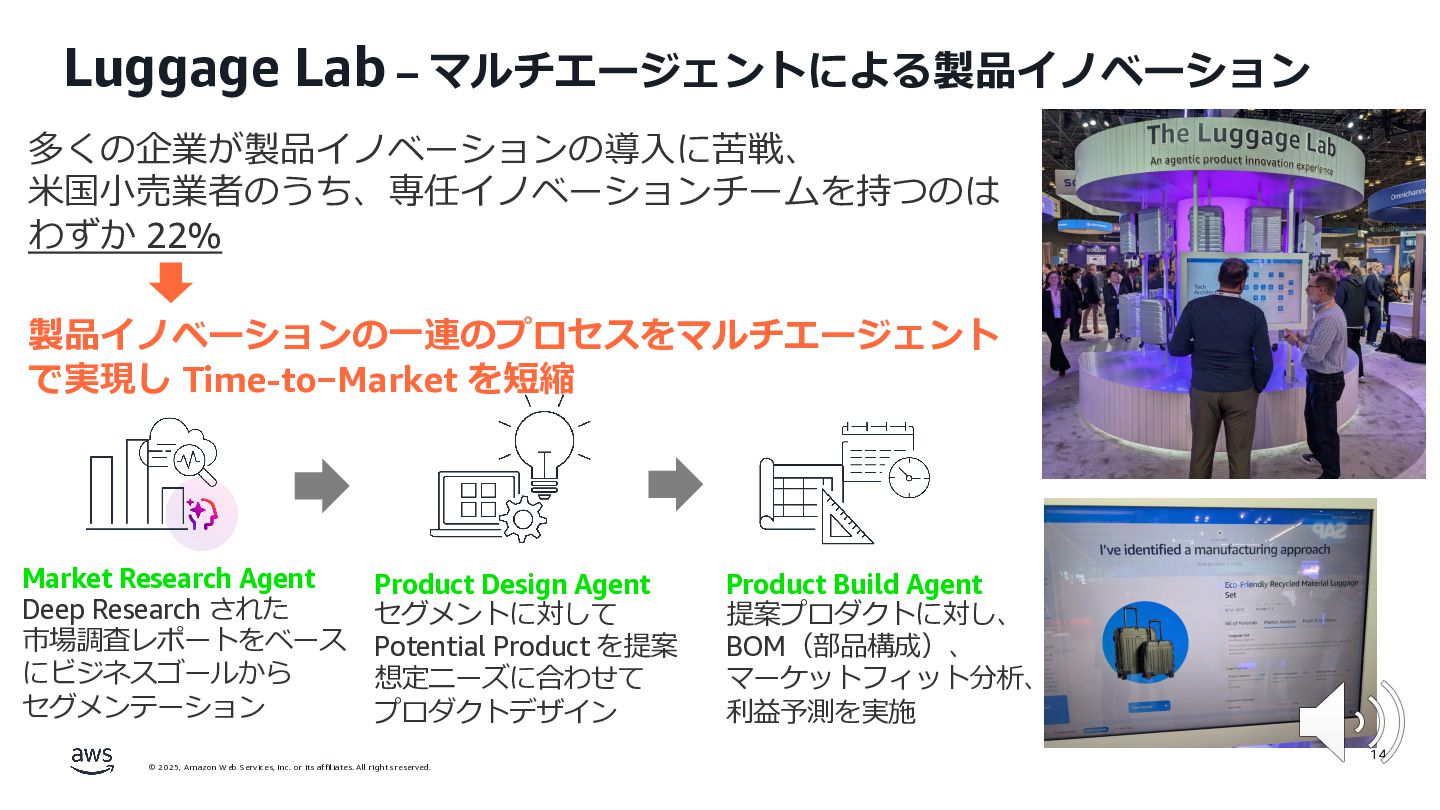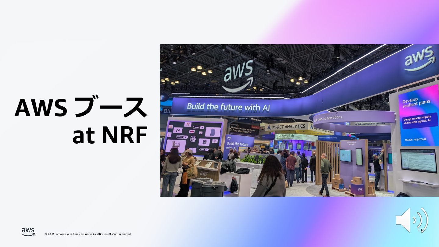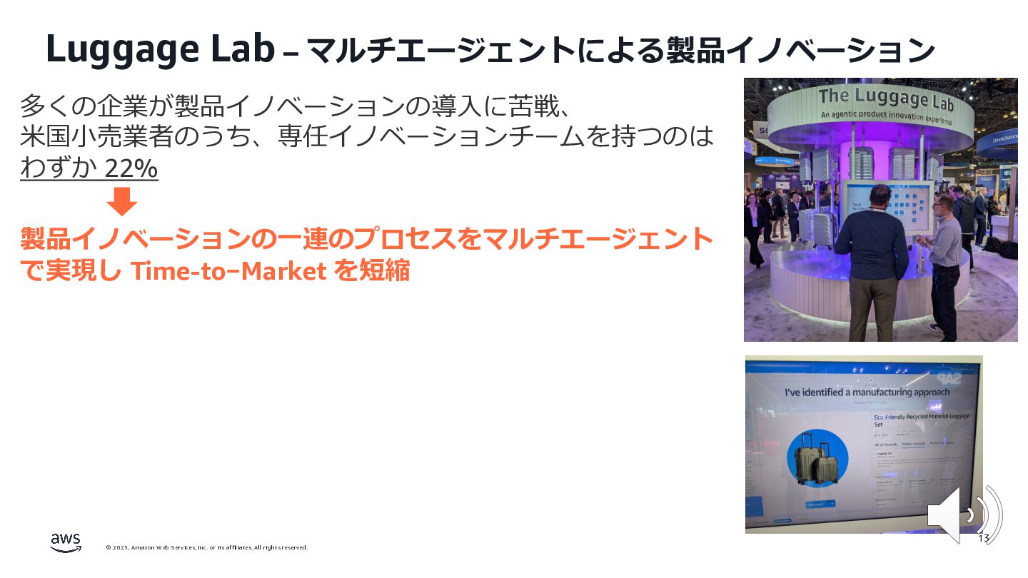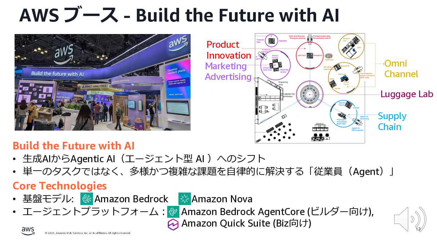rights reserved. 12 Build the Future with AI • ⽣成AIからAgentic AI(エージェント型 AI )へのシフト • 単⼀のタスクではなく、多様かつ複雑な課題を⾃律的に解決する「従業員(Agent)」 Core Technologies • 基盤モデル: Amazon Bedrock Amazon Nova • エージェントプラットフォーム︓ Amazon Bedrock AgentCore (ビルダー向け), Amazon Quick Suite (Biz向け) AWS ブース - Build the Future with AI Supply Chain Luggage Lab Omni Channel Marketing Advertising Product Innovation