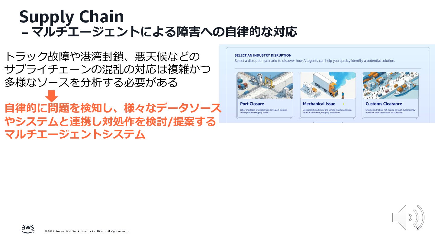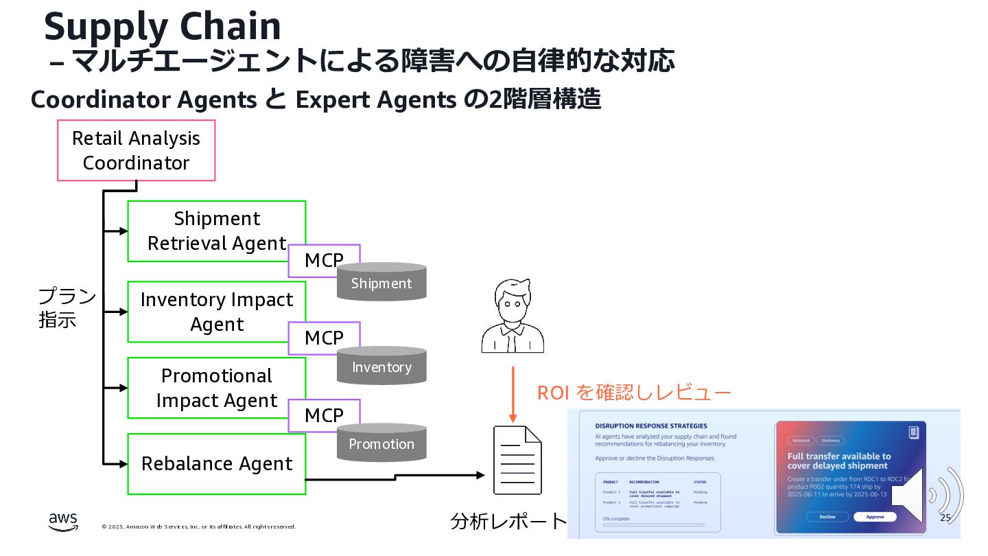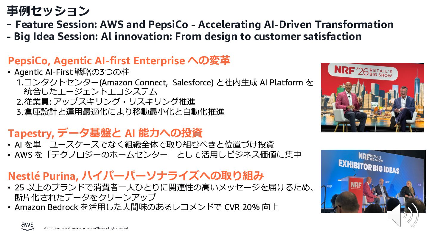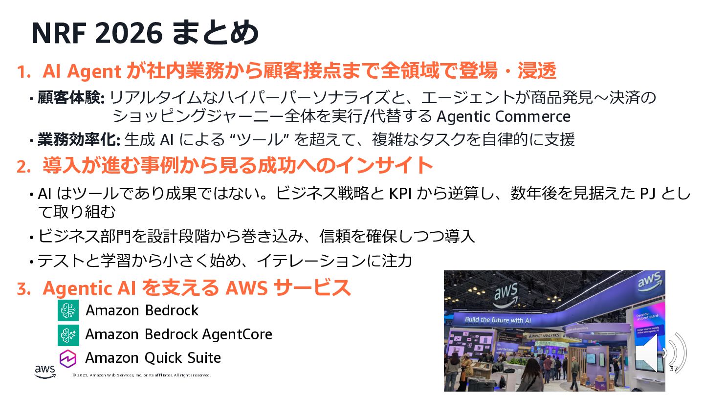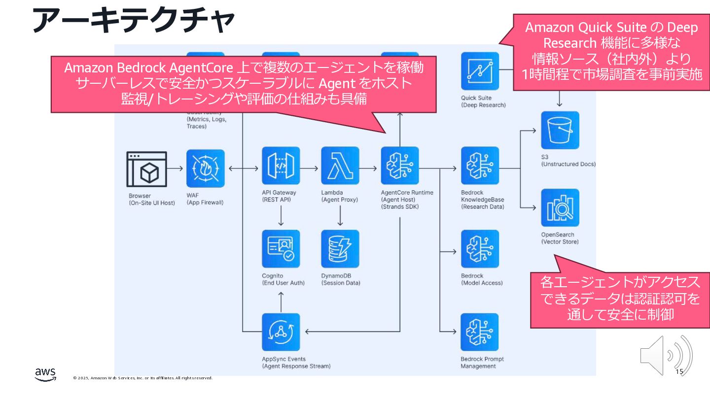 rights reserved. 12 Build the Future with AI • ⽣成AIからAgentic AI(エージェント型 AI )へのシフト • 単⼀のタスクではなく、多様かつ複雑な課題を⾃律的に解決する「従業員(Agent)」 Core Technologies • 基盤モデル: Amazon Bedrock Amazon Nova • エージェントプラットフォーム︓ Amazon Bedrock AgentCore (ビルダー向け), Amazon Quick Suite (Biz向け) AWS ブース - Build the Future with AI Supply Chain Luggage Lab Omni Channel Marketing Advertising Product Innovation