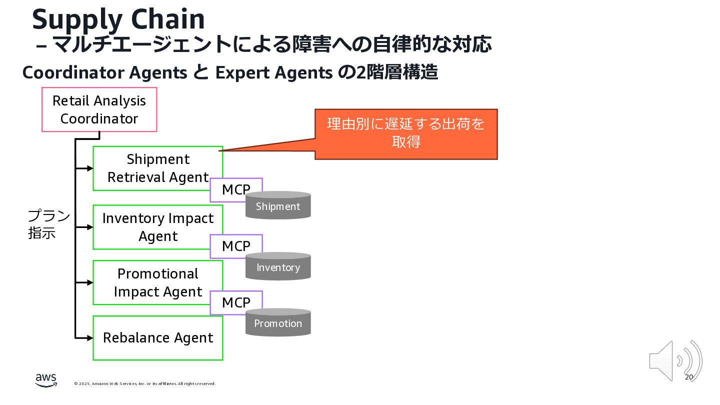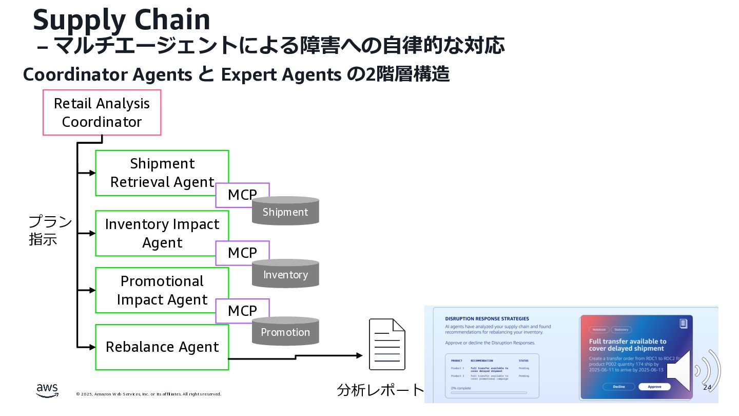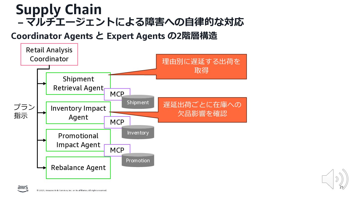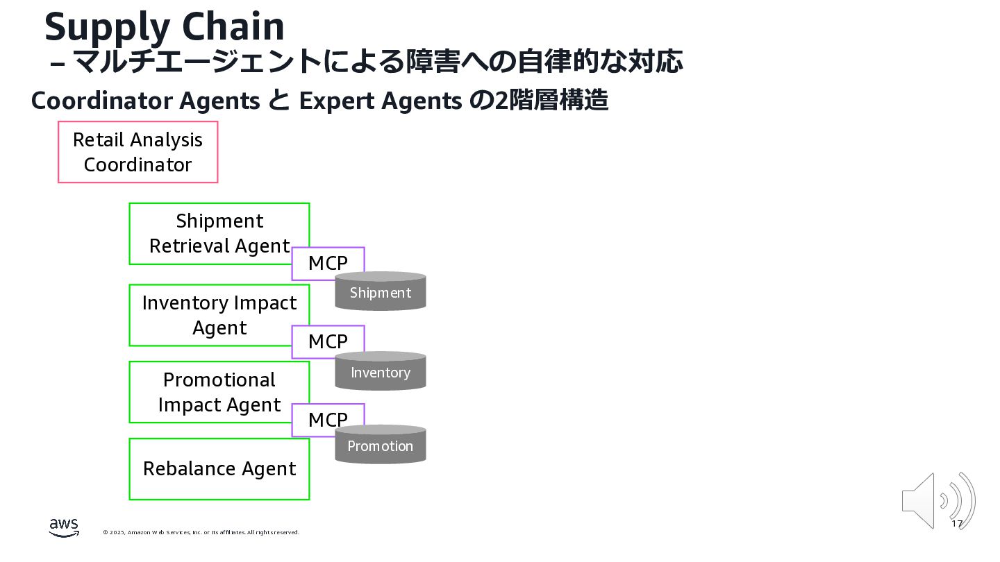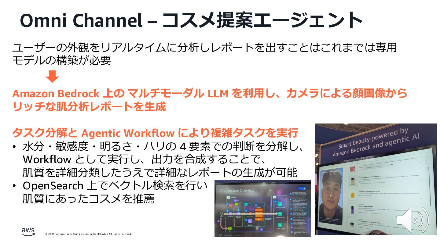 rights reserved. 12 Build the Future with AI • ⽣成AIからAgentic AI(エージェント型 AI )へのシフト • 単⼀のタスクではなく、多様かつ複雑な課題を⾃律的に解決する「従業員(Agent)」 Core Technologies • 基盤モデル: Amazon Bedrock Amazon Nova • エージェントプラットフォーム︓ Amazon Bedrock AgentCore (ビルダー向け), Amazon Quick Suite (Biz向け) AWS ブース - Build the Future with AI Supply Chain Luggage Lab Omni Channel Marketing Advertising Product Innovation