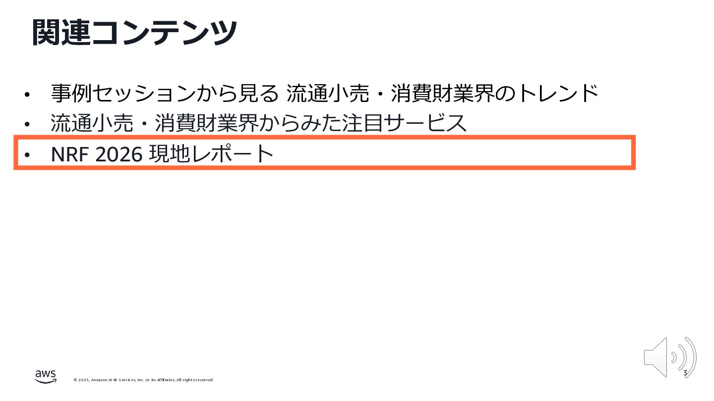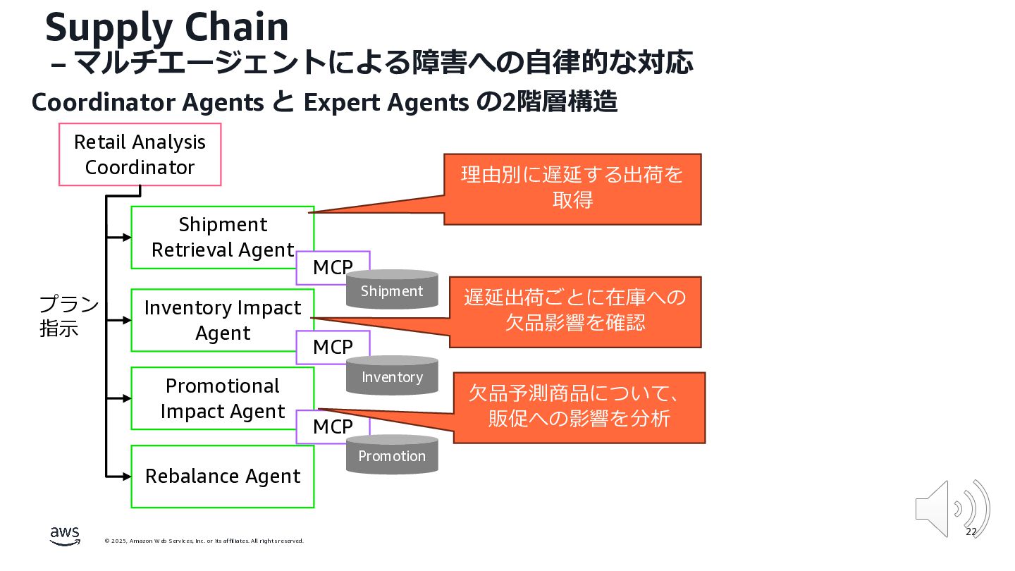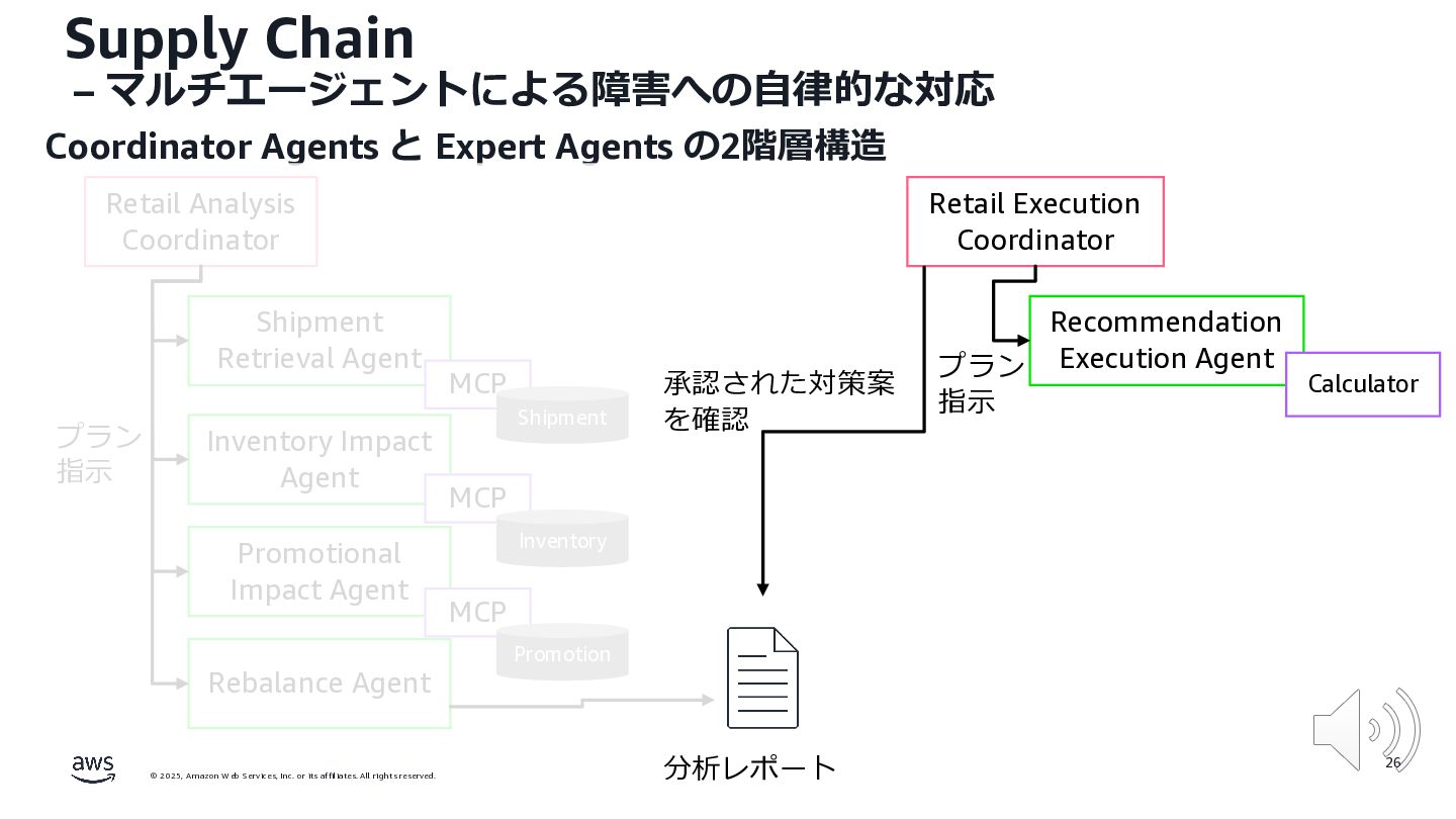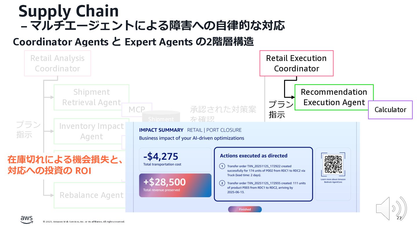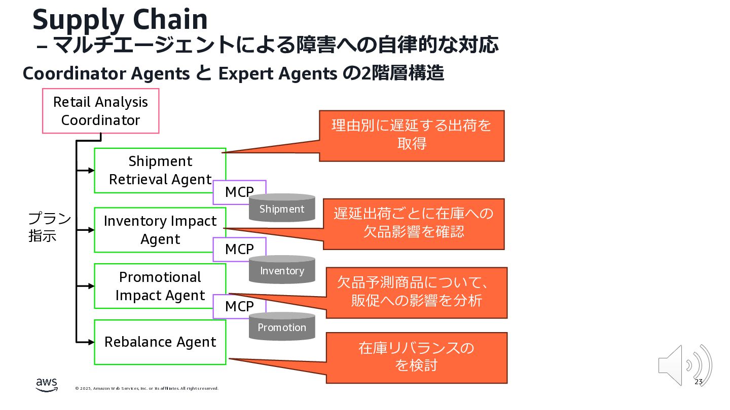 rights reserved. 12 Build the Future with AI • ⽣成AIからAgentic AI(エージェント型 AI )へのシフト • 単⼀のタスクではなく、多様かつ複雑な課題を⾃律的に解決する「従業員(Agent)」 Core Technologies • 基盤モデル: Amazon Bedrock Amazon Nova • エージェントプラットフォーム︓ Amazon Bedrock AgentCore (ビルダー向け), Amazon Quick Suite (Biz向け) AWS ブース - Build the Future with AI Supply Chain Luggage Lab Omni Channel Marketing Advertising Product Innovation
