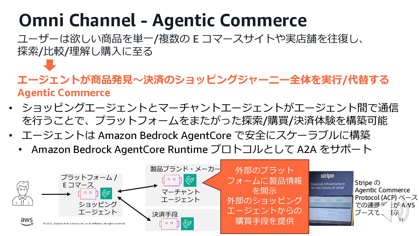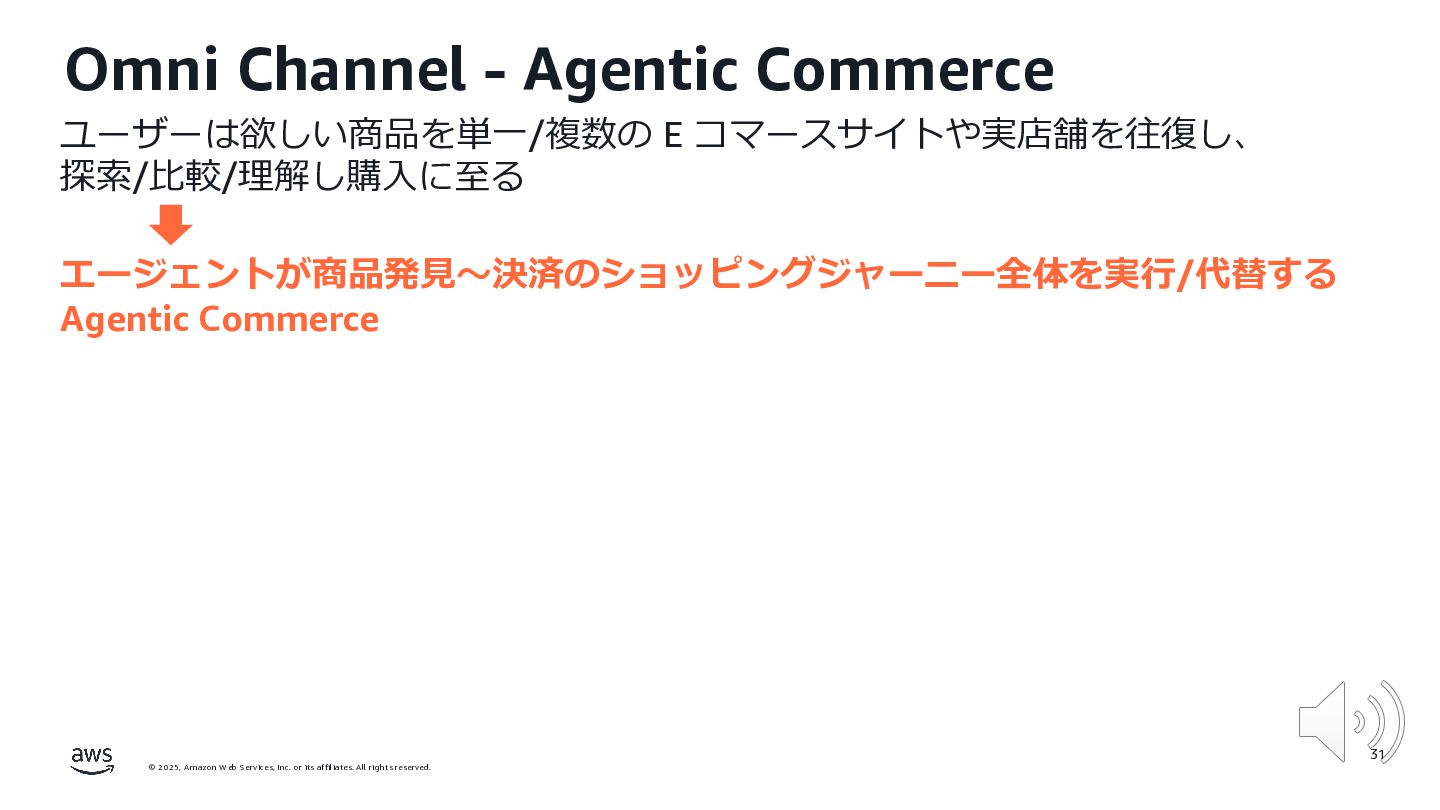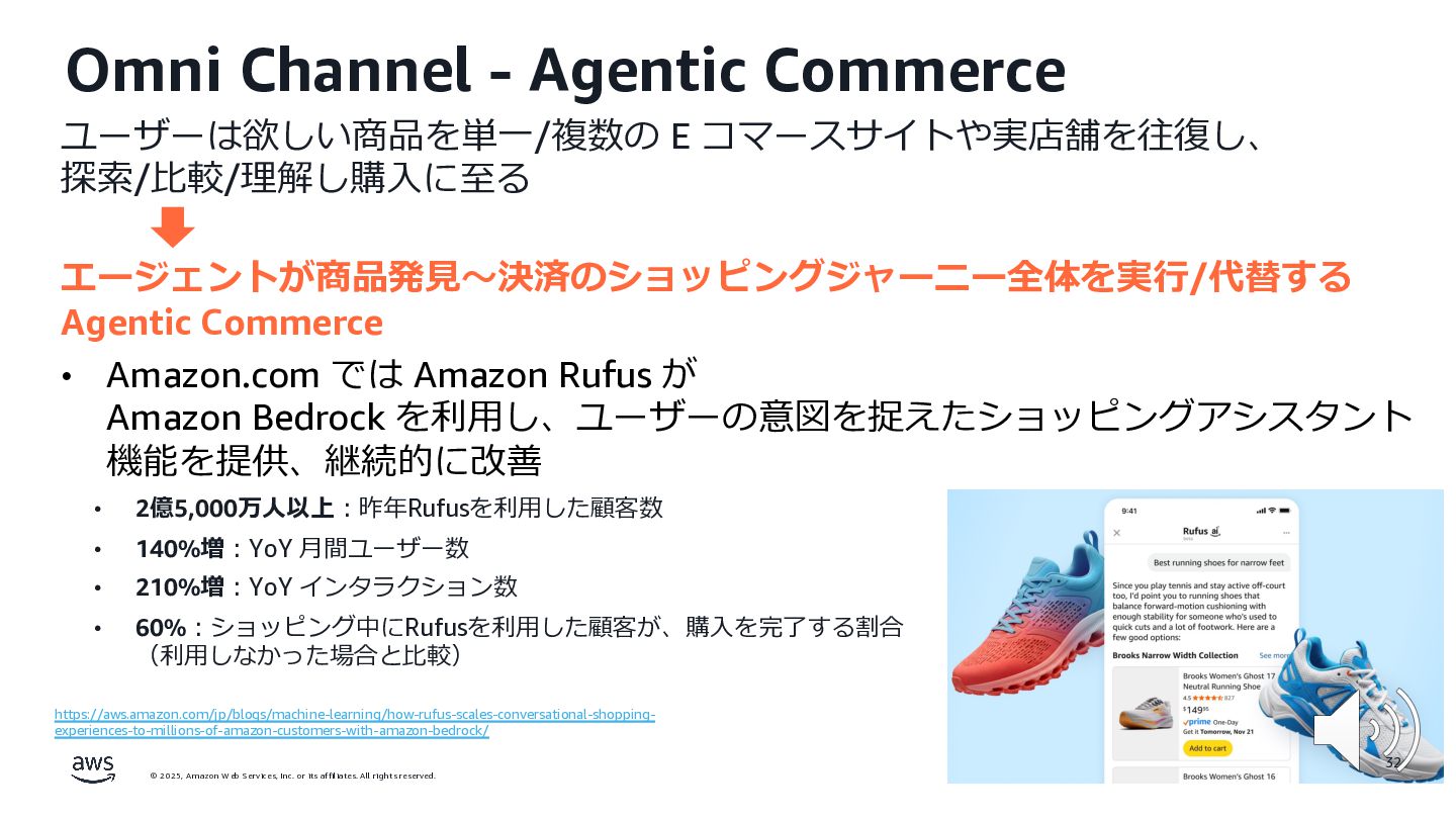 rights reserved. ユーザーは欲しい商品を単⼀/複数の E コマースサイトや実店舗を往復し、 探索/⽐較/理解し購⼊に⾄る エージェントが商品発⾒〜決済のショッピングジャーニー全体を実⾏/代替する Agentic Commerce 31 Omni Channel ‐ Agentic Commerce