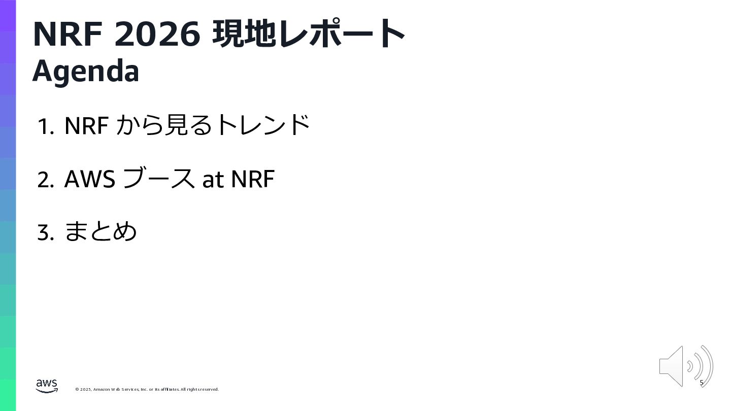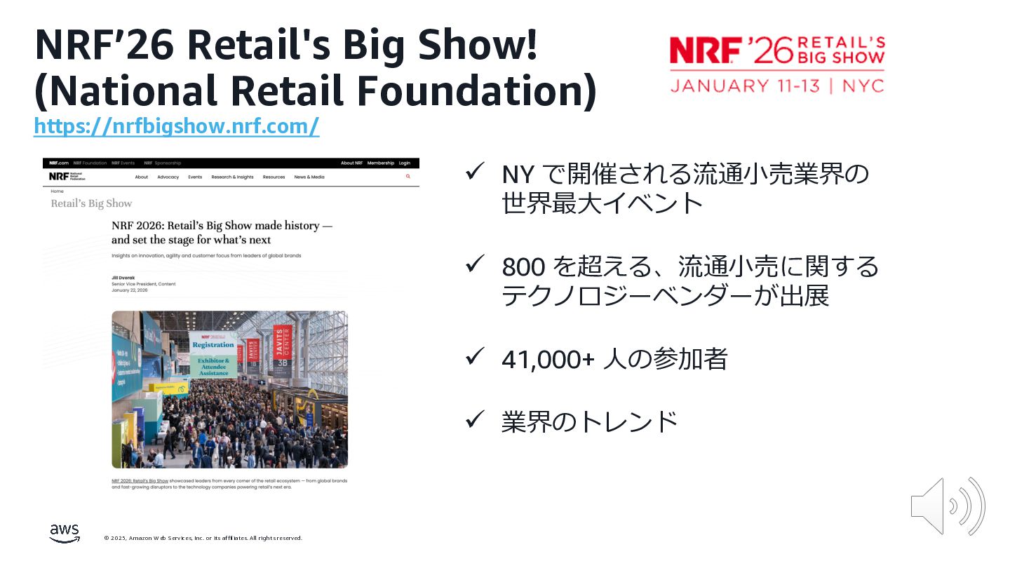 rights reserved. NRF’26 Retail's Big Show! (National Retail Foundation) https://nrfbigshow.nrf.com/ ü NY で開催される流通⼩売業界の 世界最⼤イベント ü 800 を超える、流通⼩売に関する テクノロジーベンダーが出展 ü 41,000+ ⼈の参加者 ü 業界のトレンド 6