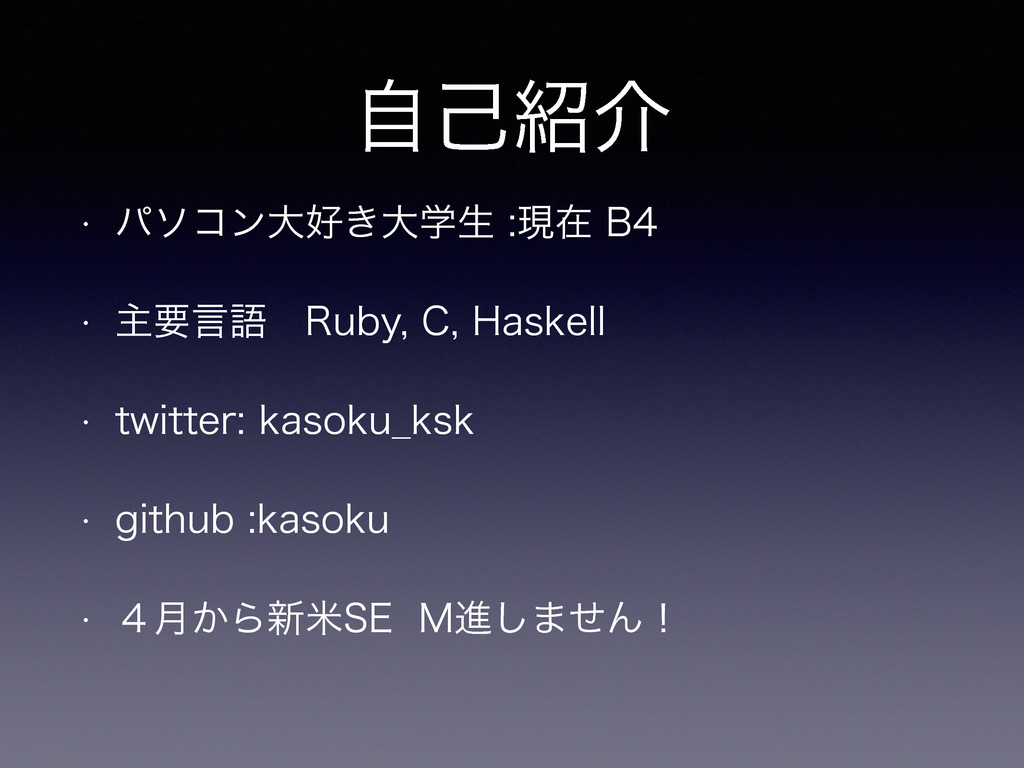 ࣗݾհ w ύιίϯେ͖େֶੜݱࡏ# w ओཁݴޠɹ3VCZ $ )BTLFMM w UXJUUFSLBTPLV@LTL w