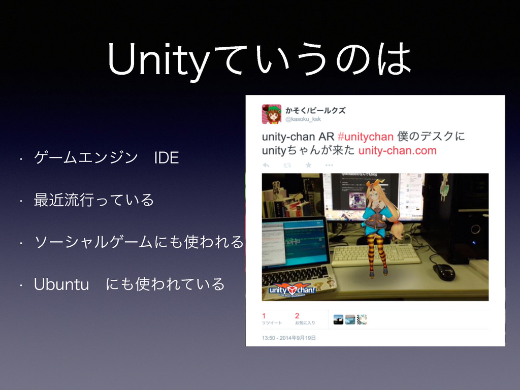6OJUZ͍ͯ͏ͷɹ w ήʔϜΤϯδϯɹ*%& w ࠷ۙྲྀߦ͍ͬͯΔ w ιʔγϟϧήʔϜʹΘΕΔ w 6CVOUVɹʹΘΕ͍ͯΔ