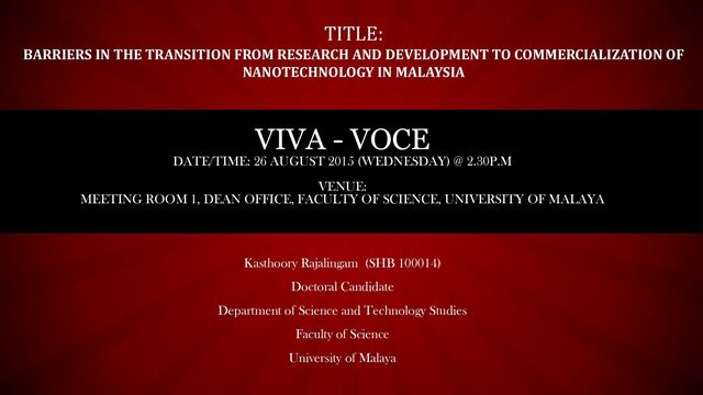 Micro-engineering and Nanoelectronics (IMEN), UKM, Bangi Nanoelectronics, OLED, Micro- electromechanical systems (MEMS/NEMS), Nanowire, Sensors Set up in 2002. Consist of full time researchers, postgraduate students, PhD graduates, MSc graduates. Collaborating with institutions in Korea, Japan and Indonesia, Telekom and MIMOS Ibnu Sina Institute for Fundamental Science Studies (IIS), UTM, Johor Nanochemistry – nanostructures material, nanocatalysts, carbon nanotube (CNT), nanoelectronic devices Set up in 1997; other sources claim it was set up in 1971. Conducts fundamental science research. Combinatorial Technology and Catalysis Research Center (COMBICAT/NANOCEN),UM Catalysts Set up date of CoE not available Advances Materials Research Center (AMREC), SIRIM Berhad, Kedah Nanomaterials and processes Set up in Shah Alam in 1996; moved to Kedah in 2000 Advanced Materials and Nanotechnology Laboratory (AMNL), UPM, Serdang based in Institute of Advanced Technology, (ITMA), UPM, Serdang Nano-composite materials, nanostructures, carbon nanotubes, Nanomedicine, Electronics Set up in 1999 PutraCAT, UPM, Serdang Nanostructures, nanoparticles of bulk metal oxides Set up in 2008 Institute of Nanoelectronics Engineering (INEE), UniMAP, Perlis Nanobiochips, photonics, non-volatile memory devices, novel devices, smart sensor Set up in 2008 Malaysian Institute of Microelectronic Systems (MIMOS) Nanostructures in MEMS/NEMS, nanoelectronics Set up in 1985 Source: Asia Nano Forum (ANF); Based on Visitations, Institutions and Research Institutes Websites/ Organization Brochures Nanotechnology Institutions and Research Centers in Malaysia