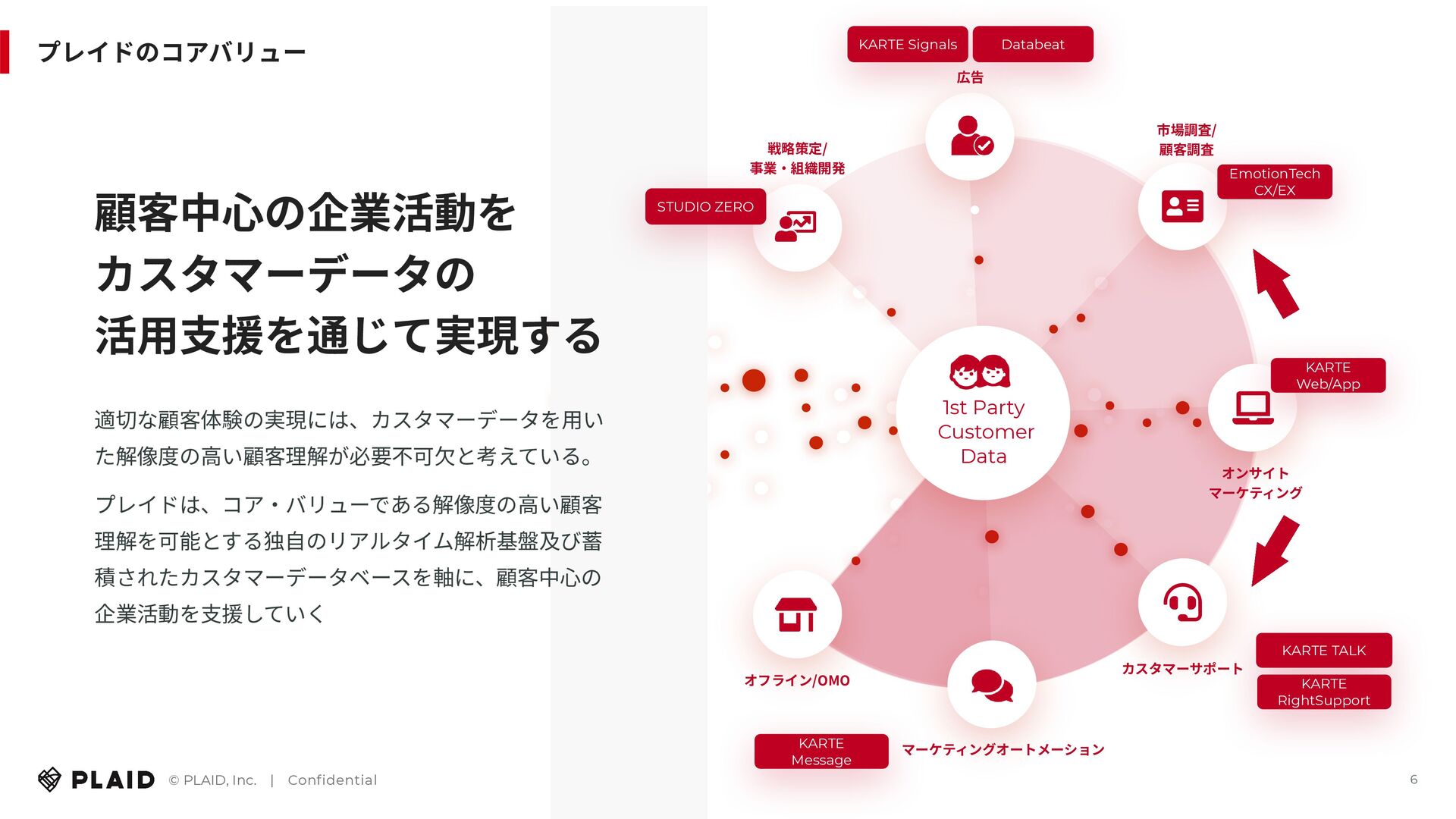 for AppΛఏڙ։࢝ 2018.5ɹ 27ԯԁΛௐୡ 2019.11ɹ Google͔ΒͷࢿۚௐୡΛൃද 2020.12ɹ౦ژূ݊औҾॴϚβʔζʢݱ౦ূάϩʔεࢢʣʹ্ 2021.8ɹ ࡾҪ࢈ͱ৽ձࣾ גࣜձࣾυοτϛʔΛઃཱ 2021.8ɹ גࣜձࣾΤϞʔγϣϯςοΫͷաגࣜΛऔಘ͠ɺ ɹɹɹɹ NPSͳͲαʔϕΠʹ͓͚ΔαʔϏεఏڙΛຊ֨Խ 2021.12ɹ ৽ձࣾ גࣜձࣾRightTouchΛઃཱ͠ ɹɹɹɹ ΧελϚʔαϙʔτྖҬʹਖ਼ࣜࢀೖ 2022.1ɹ ΞδτגࣜձࣾͷաגࣜΛऔಘ͠ɺ ɹɹɹɹ ΠϯλʔωοτࠂྖҬʹ͓͚ΔαʔϏεΛ֦ॆ 沿 革 株式会社プレイド PLAID, Inc. ઃཱɿ201110݄ ॴࡏɿ౦ژதԝ۠ۜ࠲6-10-1 GINZA SIX 10F ैۀһʢ࿈݁/୯ମʣɿ414/341ਓʢ202312݄࣌ʣ