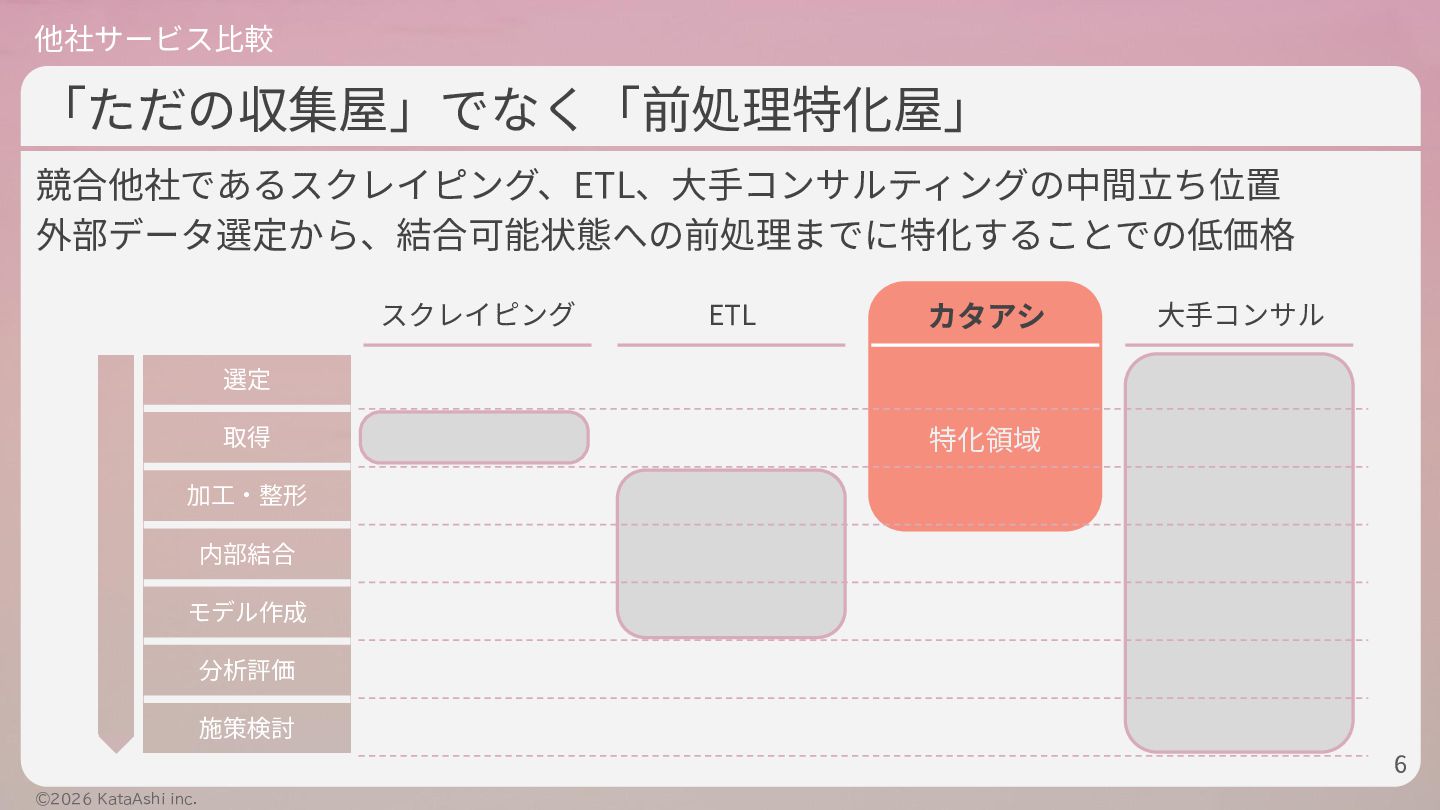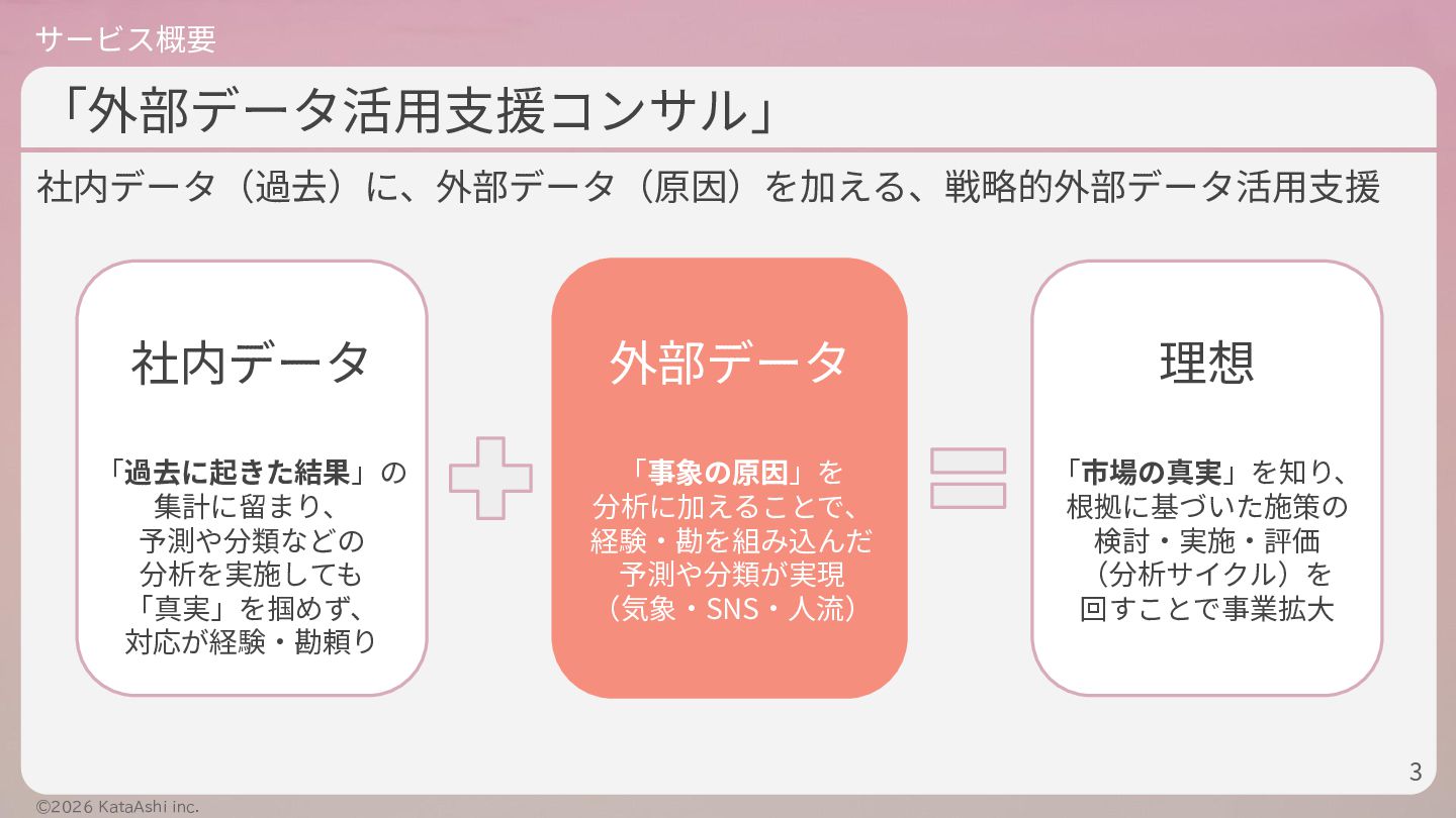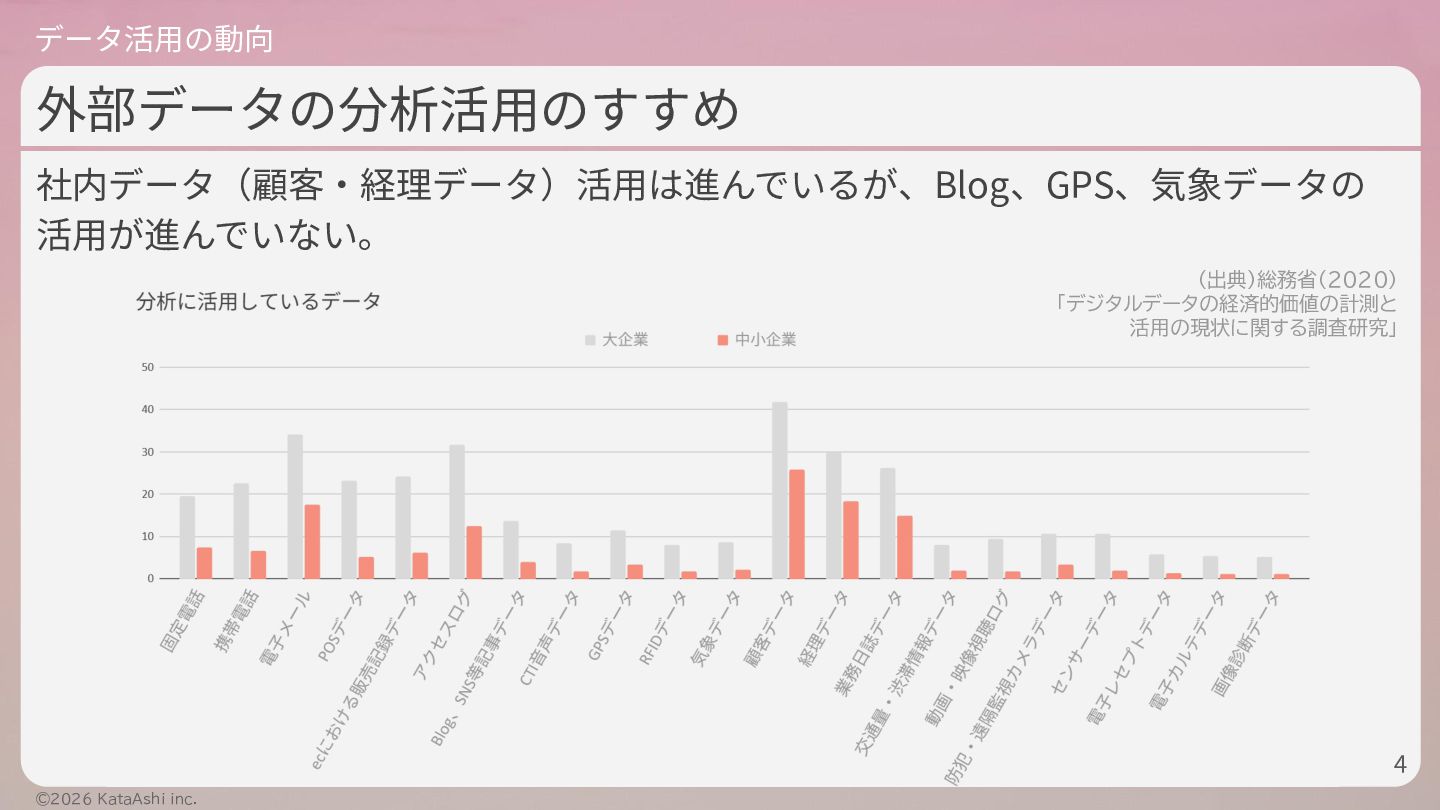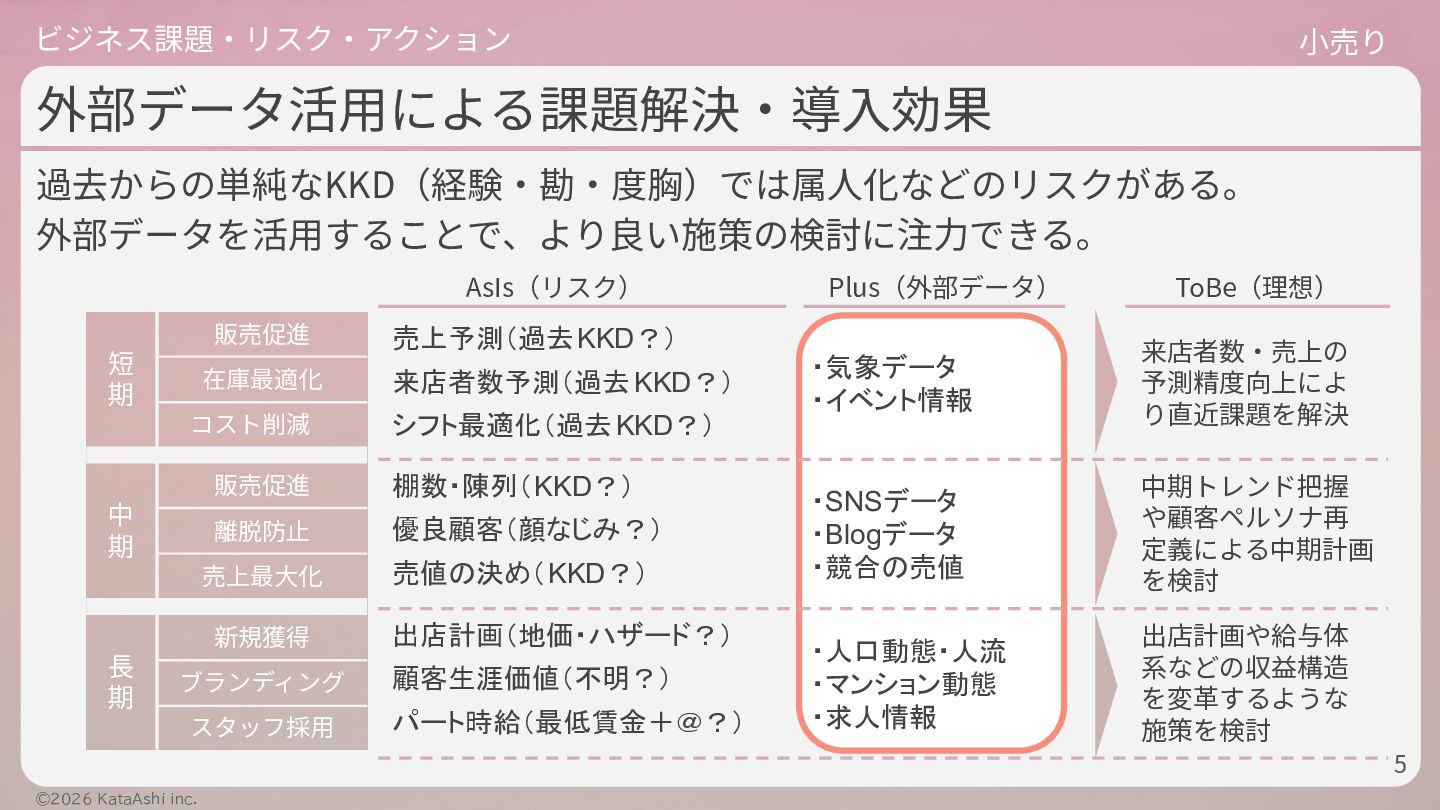 ⻑ 期 販売促進 在庫最適化 コスト削減 販売促進 離脱防⽌ 売上最⼤化 ブランディング 新規獲得 スタッフ採⽤ AsIs(リスク) Plus(外部データ) ToBe(理想) 来店者数‧売上の 予測精度向上によ り直近課題を解決 中期トレンド把握 や顧客ペルソナ再 定義による中期計画 を検討 出店計画や給与体 系などの収益構造 を変⾰するような 施策を検討 ・SNSデータ ・Blogデータ ・競合の売値 出店計画(地価・ハザード?) 顧客生涯価値(不明?) パート時給(最低賃金+@?) ・人口動態・人流 ・マンション動態 ・求人情報 ・気象データ ・イベント情報 棚数・陳列(KKD?) 優良顧客(顔なじみ?) 売値の決め(KKD?) 売上予測(過去KKD?) 来店者数予測(過去 KKD?) シフト最適化(過去KKD?) 過去からの単純なKKD(経験‧勘‧度胸)では属⼈化などのリスクがある。 外部データを活⽤することで、より良い施策の検討に注⼒できる。 ⼩売り