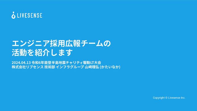 エンジニア採⽤広報チームの 活動を紹介します 2024.04.13 令和6年能登半島地震チャリティ駆動LT⼤会 株式会社リブセンス 技術部 インフラグループ ⼭崎理弘 (かたいなか) Copyright