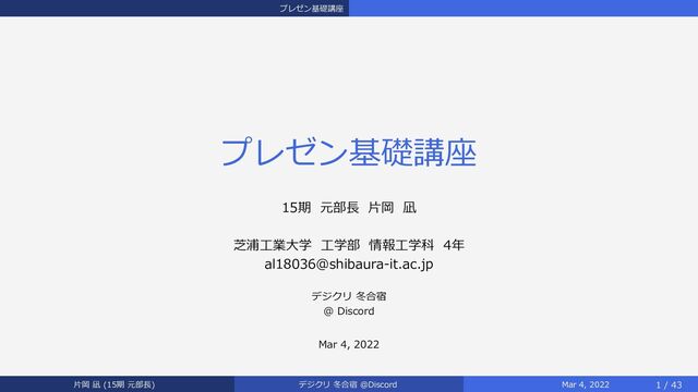 1 / 43 プレゼン基礎講座 プレゼン基礎講座 15期 元部長 片岡 凪 芝浦工業大学 工学部 情報工学科 4年
