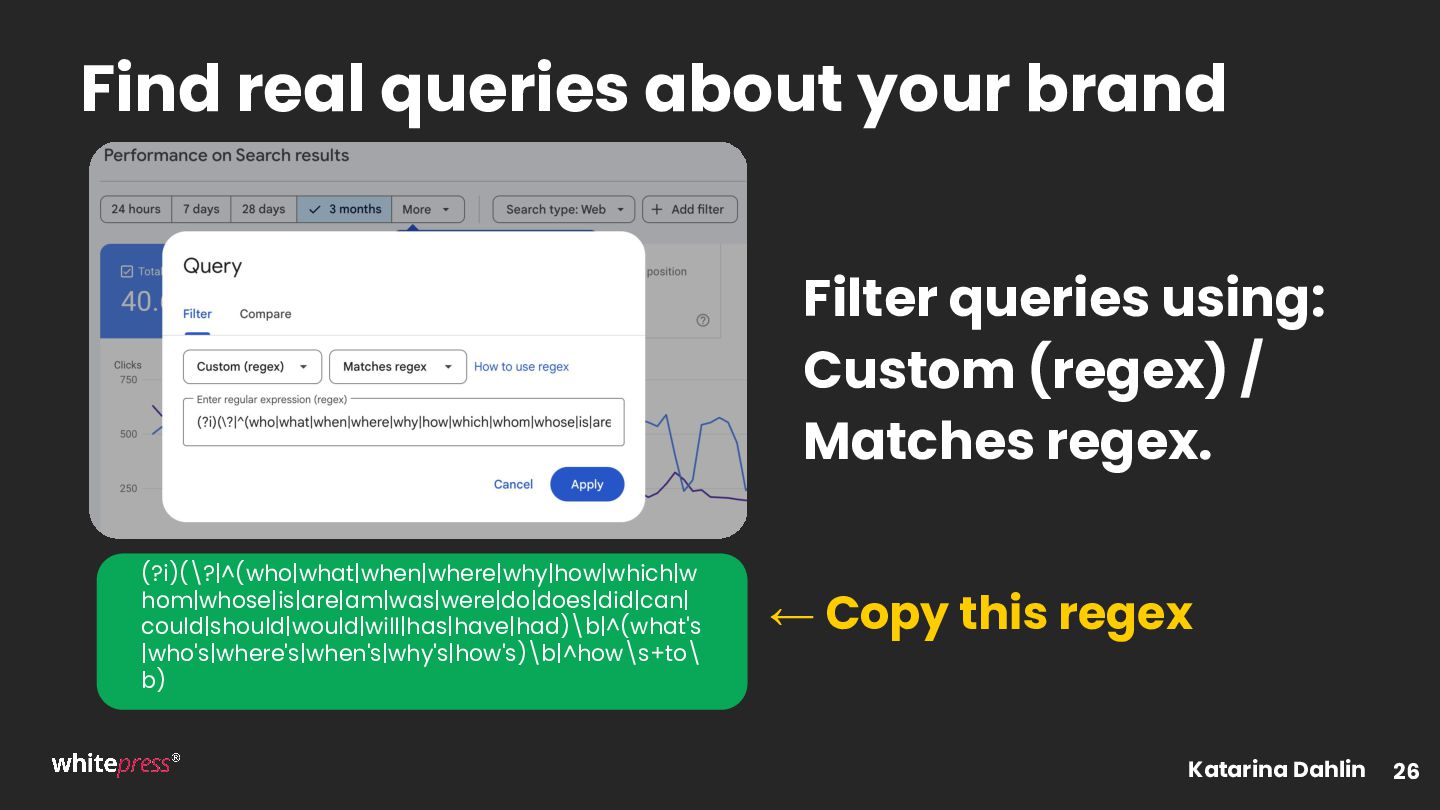 regex. Find real queries about your brand (?i)(\?|^(who|what|when|where|why|how|which|w hom|whose|is|are|am|was|were|do|does|did|can| could|should|would|will|has|have|had)\b|^(what's |who's|where's|when's|why's|how's)\b|^how\s+to\ b) ← Copy this regex 26
