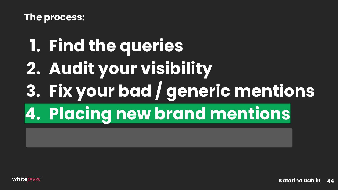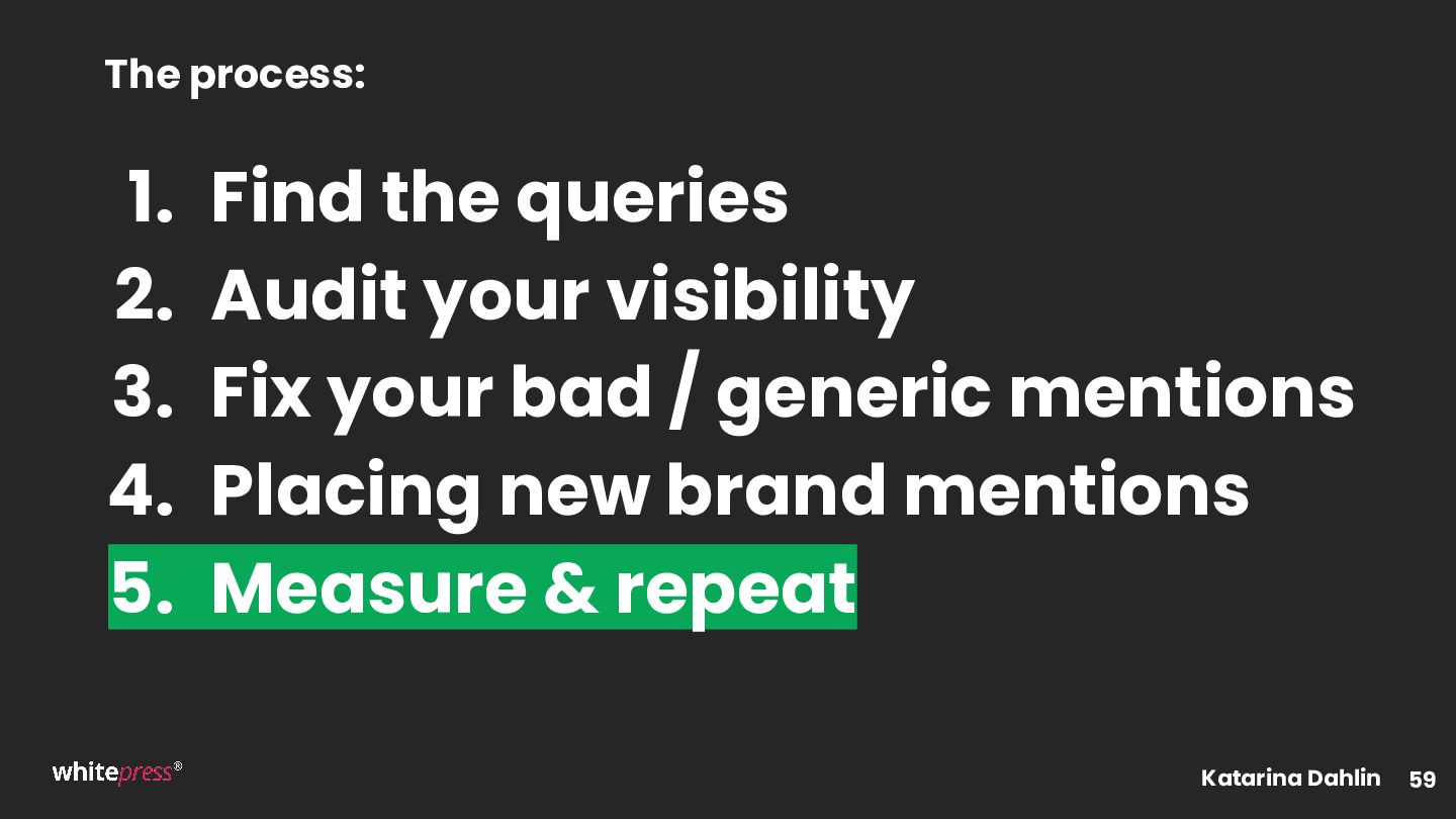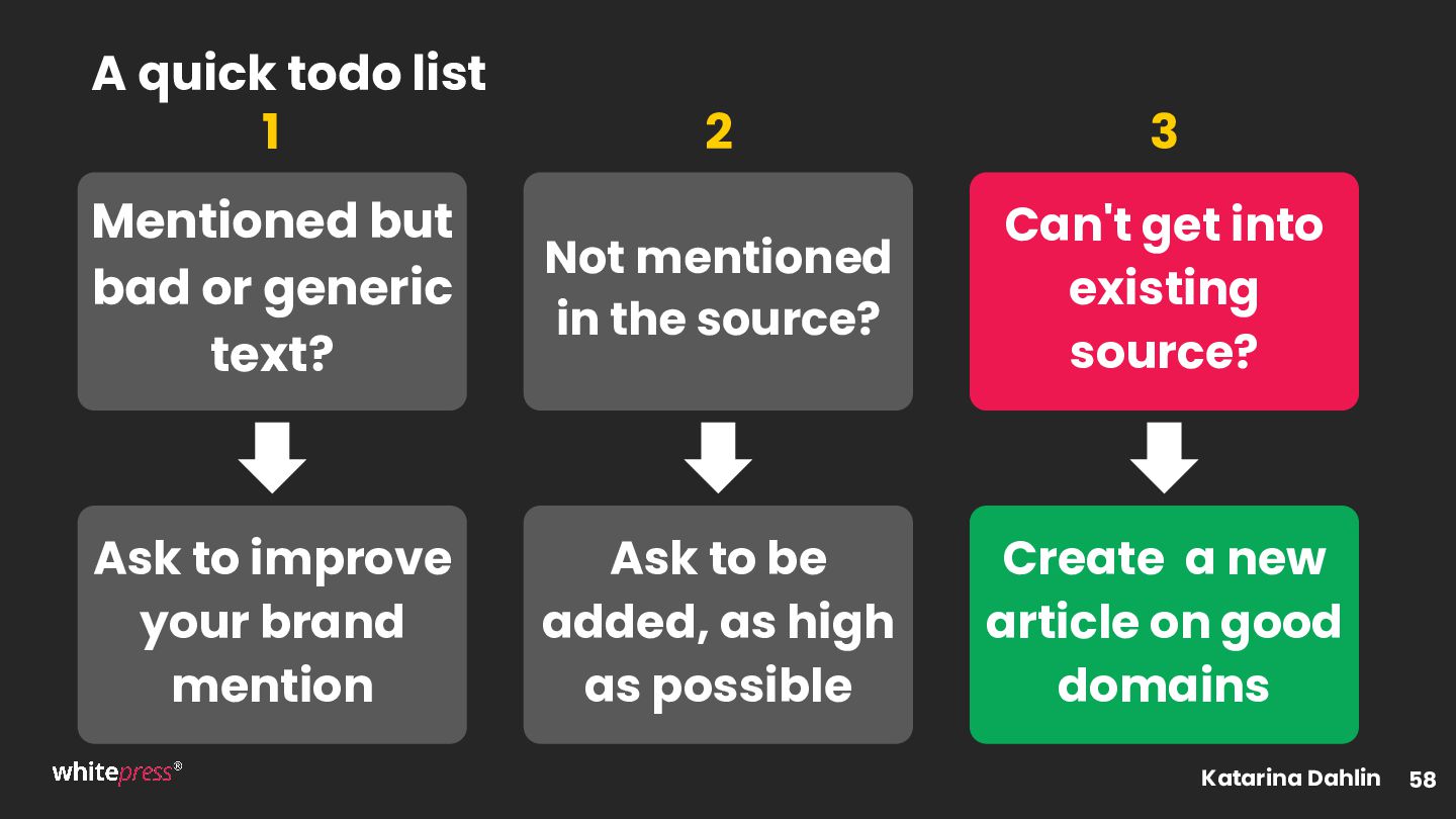 mentioned in the source? Can't get into existing source? Ask to improve your brand mention Ask to be added, as high as possible Create a new article on good domains A quick todo list 1 2 3 58