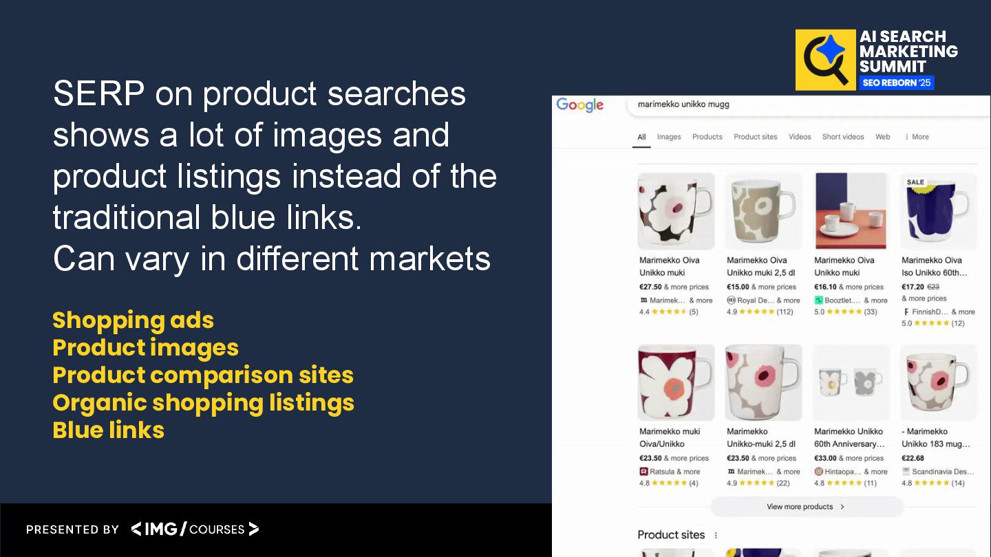 product listings instead of the traditional blue links. Can vary in different markets Shopping ads Product images Product comparison sites Organic shopping listings Blue links