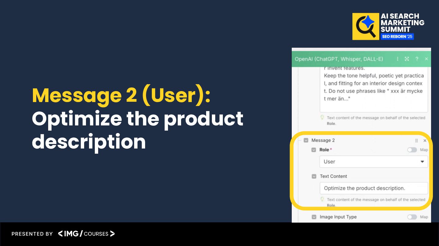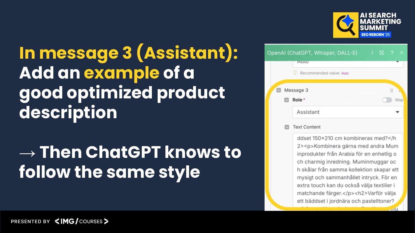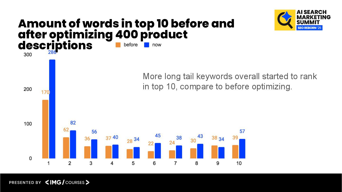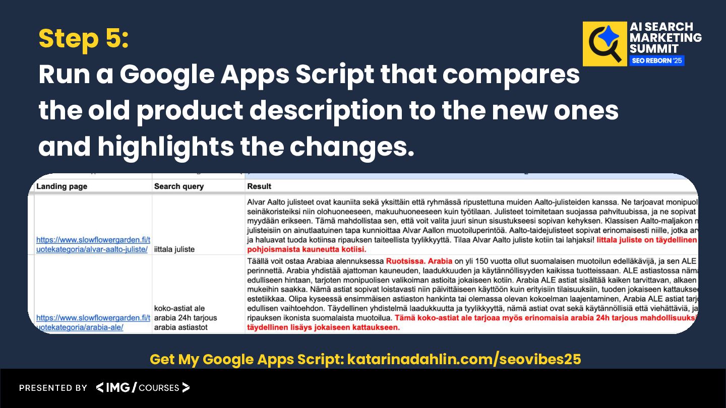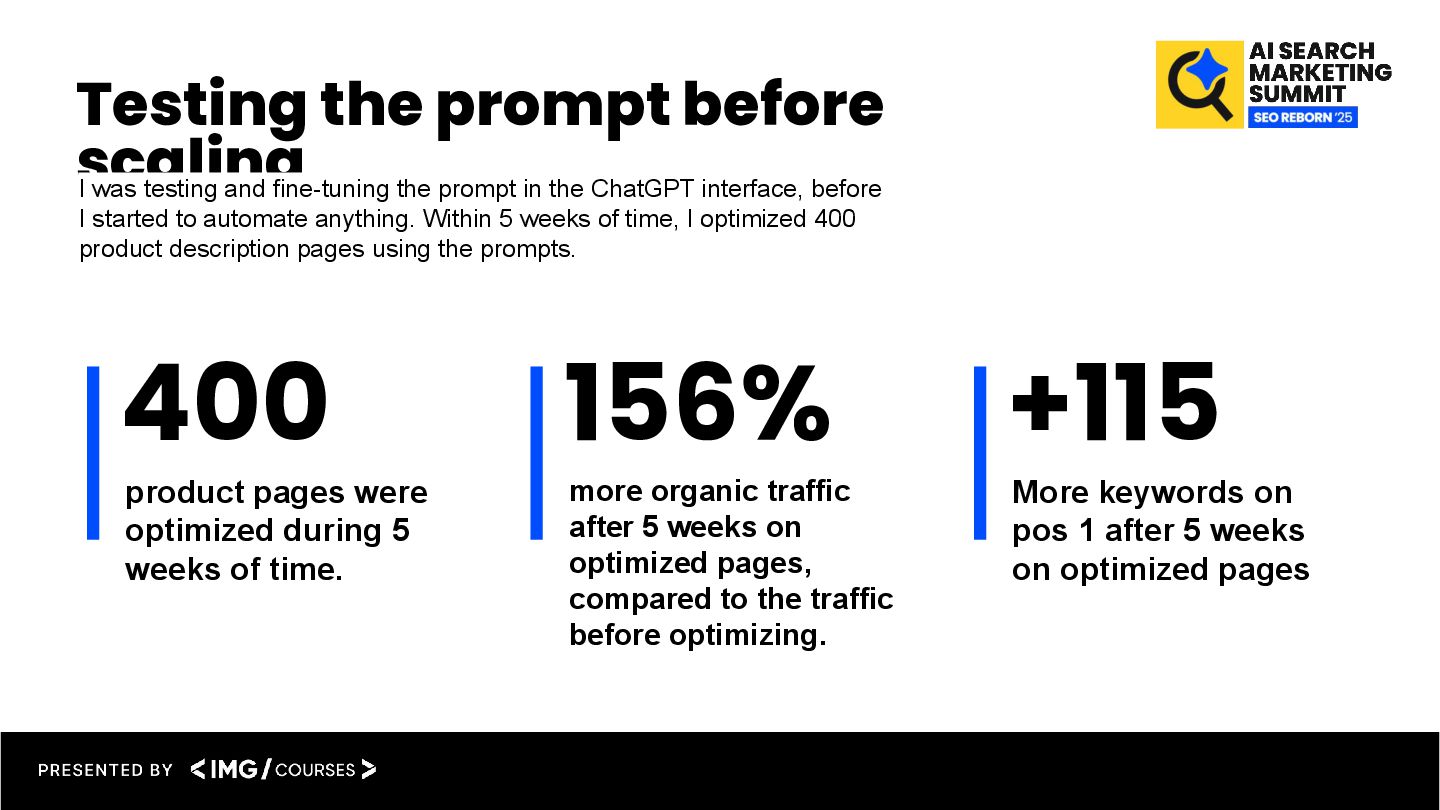 the prompt in the ChatGPT interface, before I started to automate anything. Within 5 weeks of time, I optimized 400 product description pages using the prompts. 400 product pages were optimized during 5 weeks of time. 156% more organic traffic after 5 weeks on optimized pages, compared to the traffic before optimizing. +115 More keywords on pos 1 after 5 weeks on optimized pages
