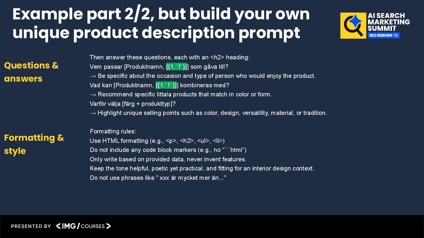 passar [Produktnamn, {{1.`1`}}] som gåva till? → Be specific about the occasion and type of person who would enjoy the product. Vad kan [Produktnamn, {{1.`1`}}] kombineras med? → Recommend specific Iittala products that match in color or form. Varför välja [färg + produkttyp]? → Highlight unique selling points such as color, design, versatility, material, or tradition. Formatting rules: Use HTML formatting (e.g., <p>, <h2>, <ul>, <li>) Do not include any code block markers (e.g., no “```html”) Only write based on provided data, never invent features. Keep the tone helpful, poetic yet practical, and fitting for an interior design context. Do not use phrases like " xxx är mycket mer än..." Questions & answers Formatting & style Example part 2/2, but build your own unique product description prompt