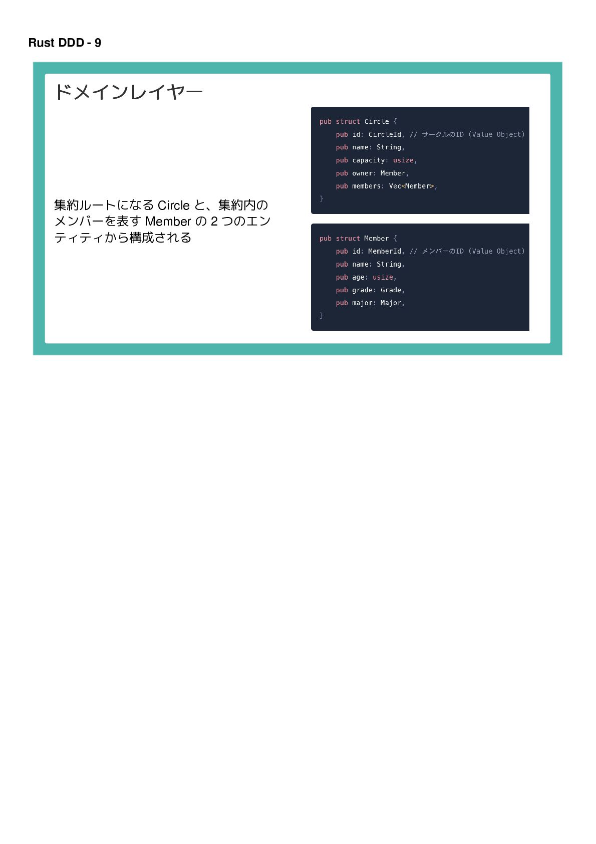 Rust DDD - 9 ドメインレイヤー ドメインレイヤー 集約ルートになる Circle と、集約内の メンバーを表す