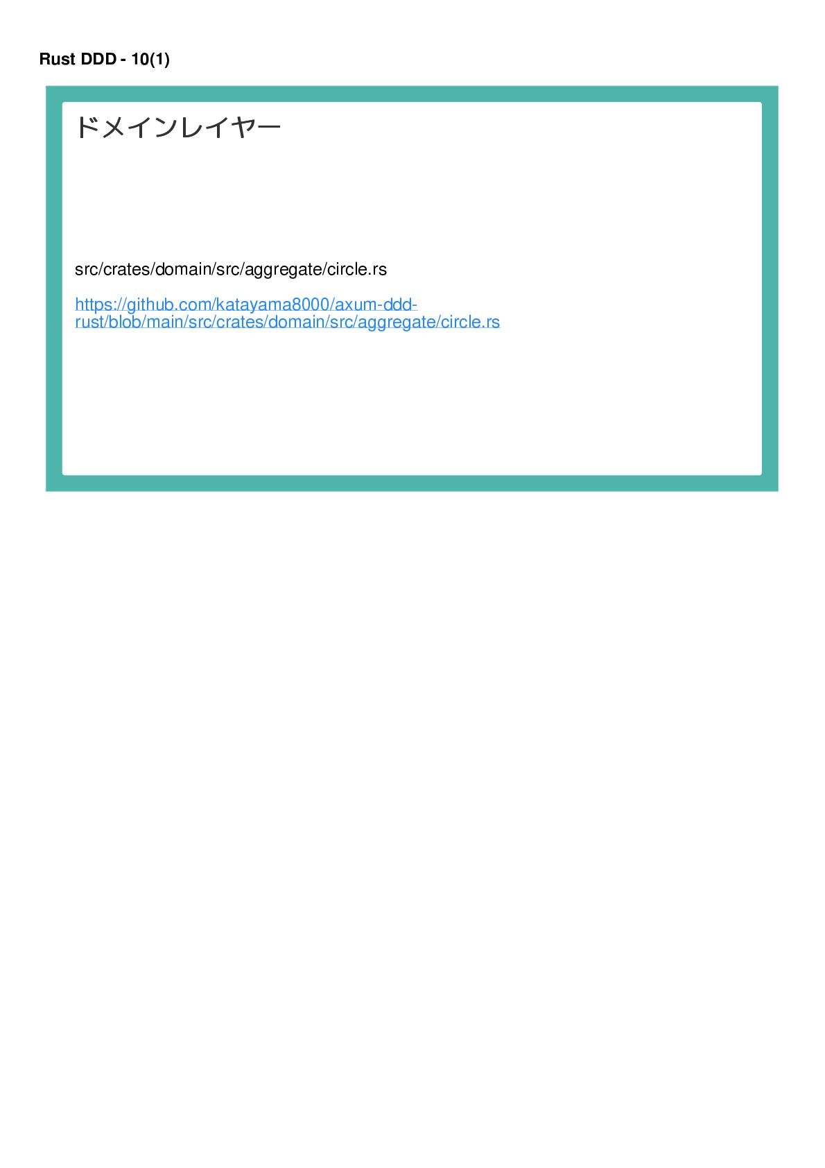 Rust DDD - 10(1) ドメインレイヤー ドメインレイヤー src/crates/domain/src/aggregate/circle.rs https://github.com/katayama8000/axum-ddd- rust/blob/main/src/crates/domain/src/aggregate/circle.rs