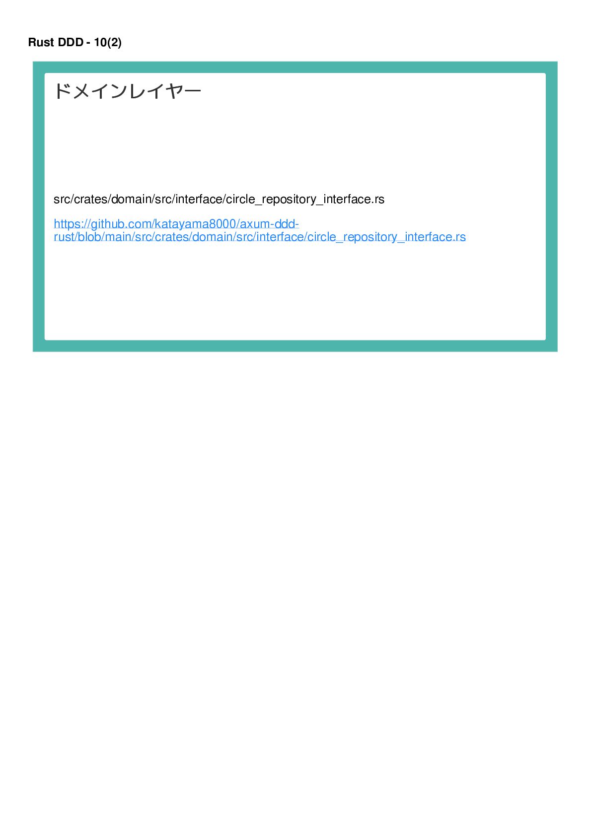 Rust DDD - 10(2) ドメインレイヤー ドメインレイヤー src/crates/domain/src/interface/circle_repository_interface.rs https://github.com/katayama8000/axum-ddd- rust/blob/main/src/crates/domain/src/interface/circle_repository_interface.rs