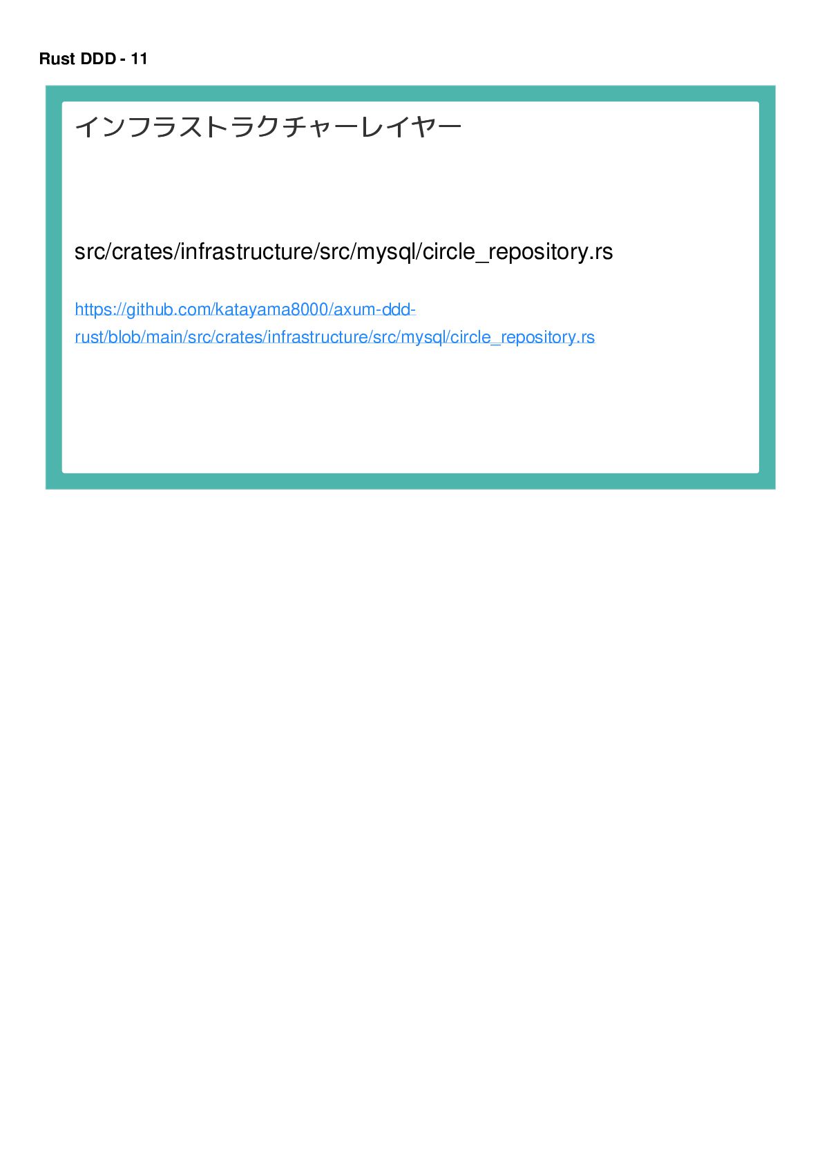 Rust DDD - 11 インフラストラクチャーレイヤー インフラストラクチャーレイヤー src/crates/infrastructure/src/mysql/circle_repository.rs https://github.com/katayama8000/axum-ddd- rust/blob/main/src/crates/infrastructure/src/mysql/circle_repository.rs